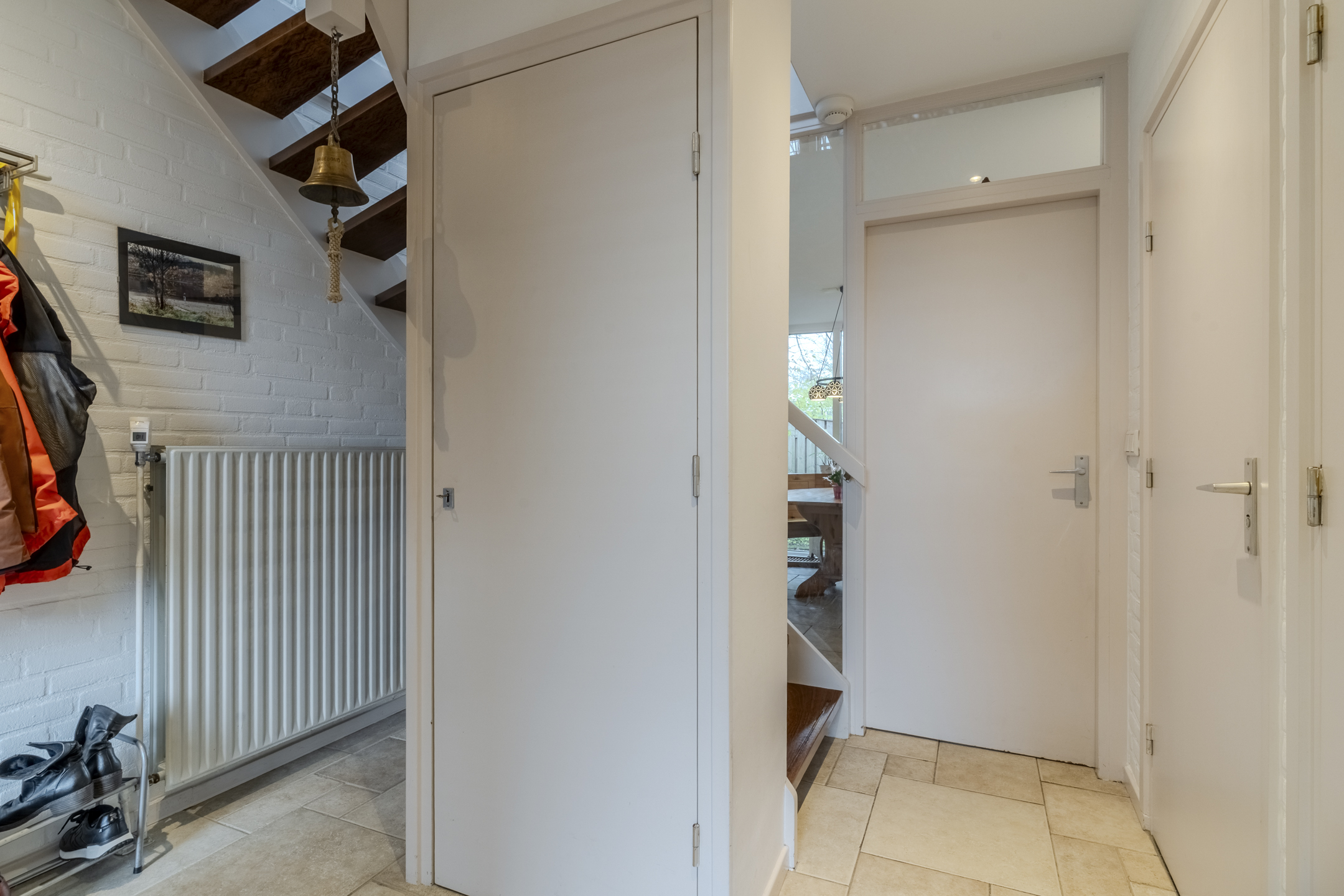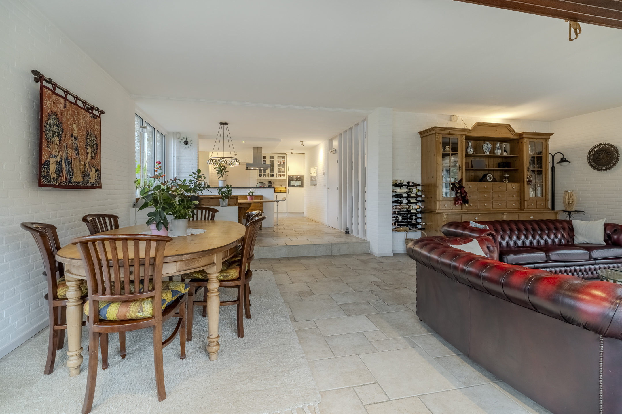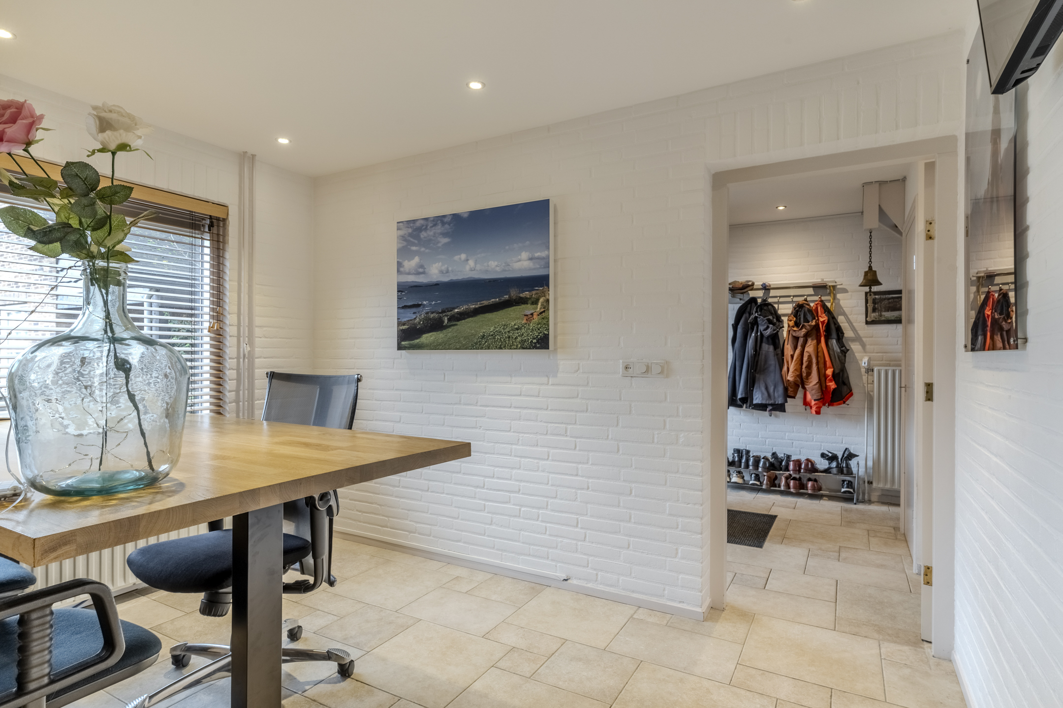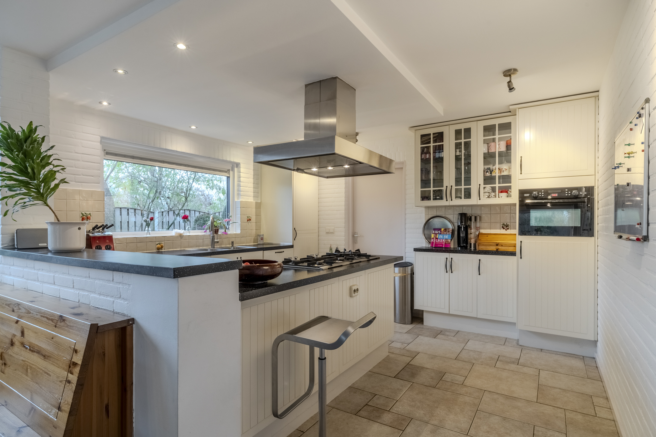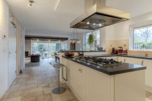 Entree/ontvangsthal met tegelvloer, meterkast (vernieuwd, 3x25A), licht betegelde toiletruimte, trappartij naar de eerste verdieping en toegang tot de op de begane grond gelegen slaapkamer met volledig betegelde doucheruimte en-suite (momenteel in gebruik als werkkamer met archiefruimte). Riante living (ca. 74m²) voorzien van tegelvloer met vloerverwarming, schuifpui naar de achtertuin, een sfeervolle houtgestookte inzethaard (2024), indirecte plafond verlichting en een half-open keuken met een keukeninrichting in U-opstelling met veel kastruimte en de navolgende inbouwapparatuur te weten: gaskookplaat, rvs-afzuigkap, grote koelkast, combi-magnetron, vaatwasmachine en een Quooker. Vanuit de keuken is er een prettig direct contact met de rest van de living.