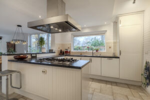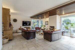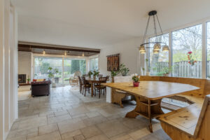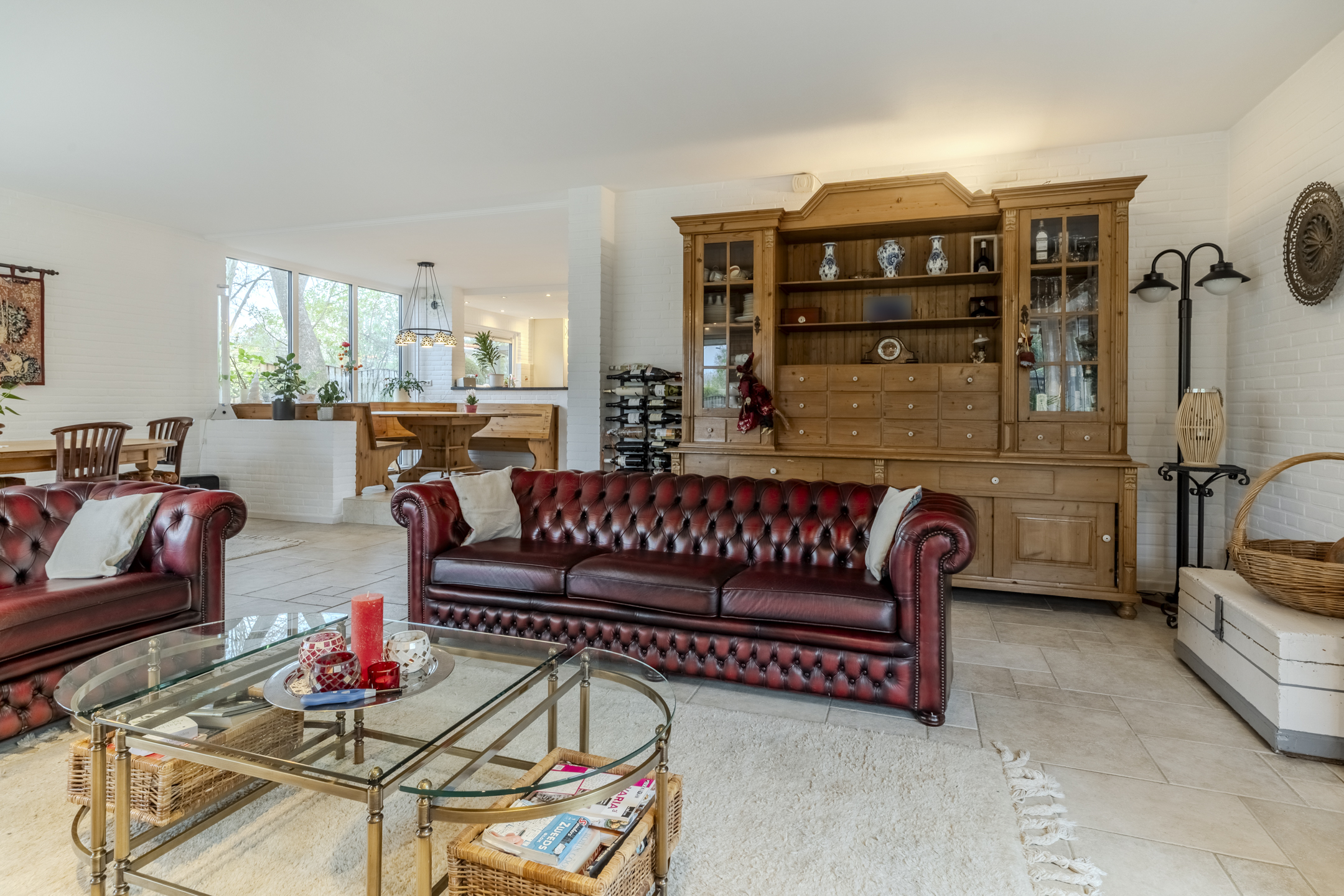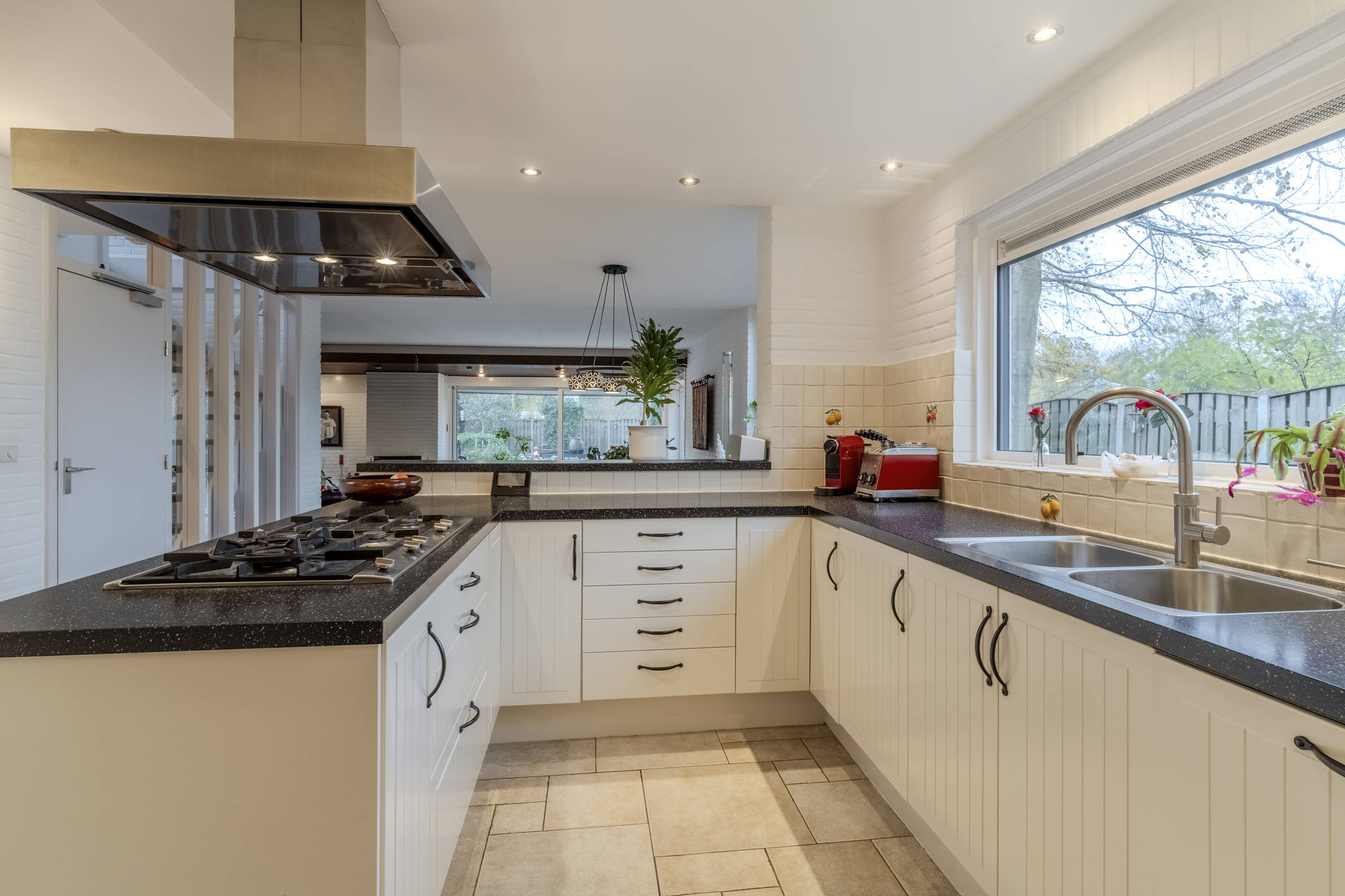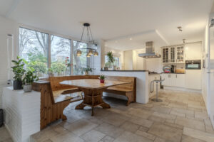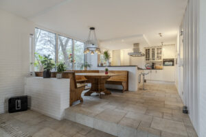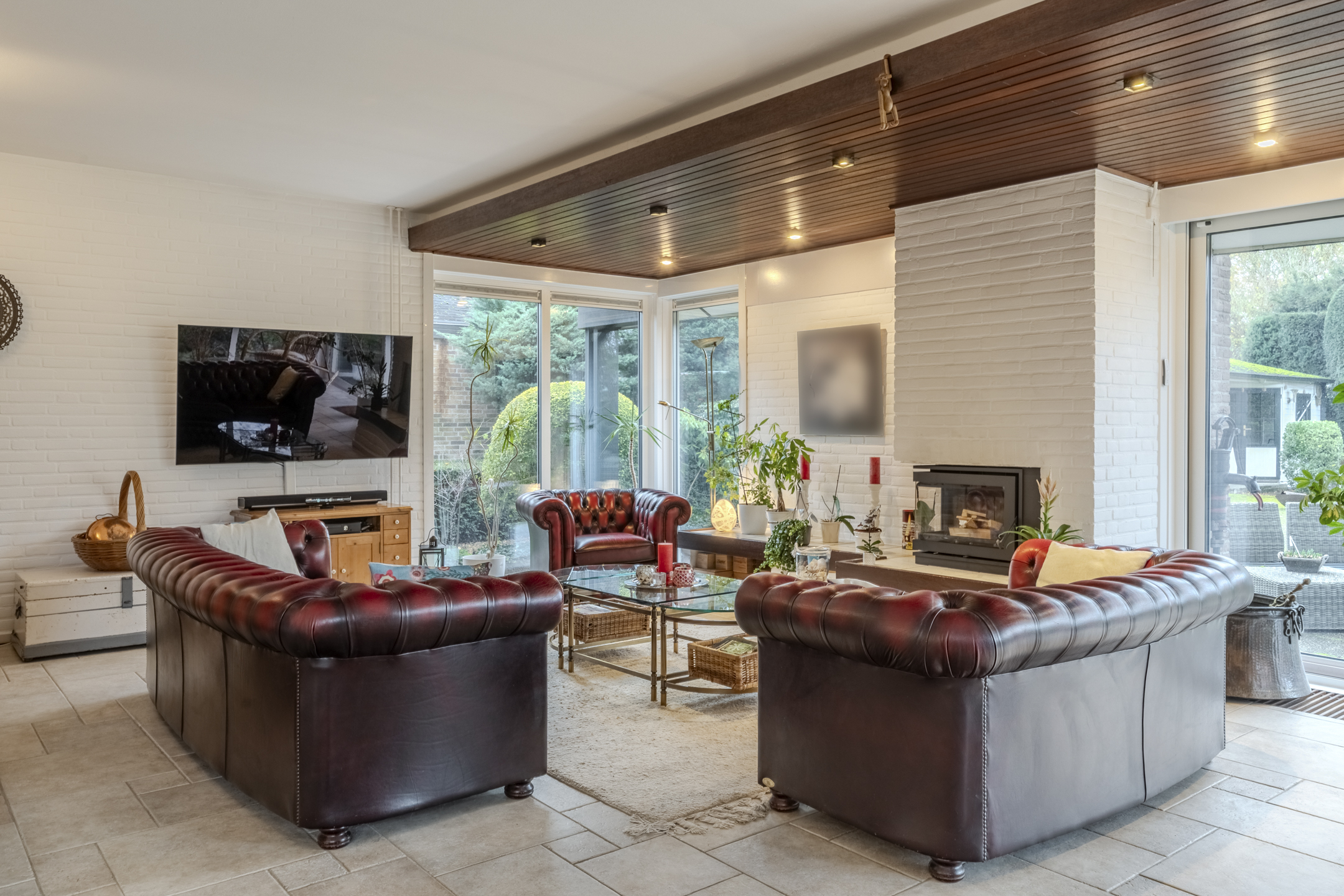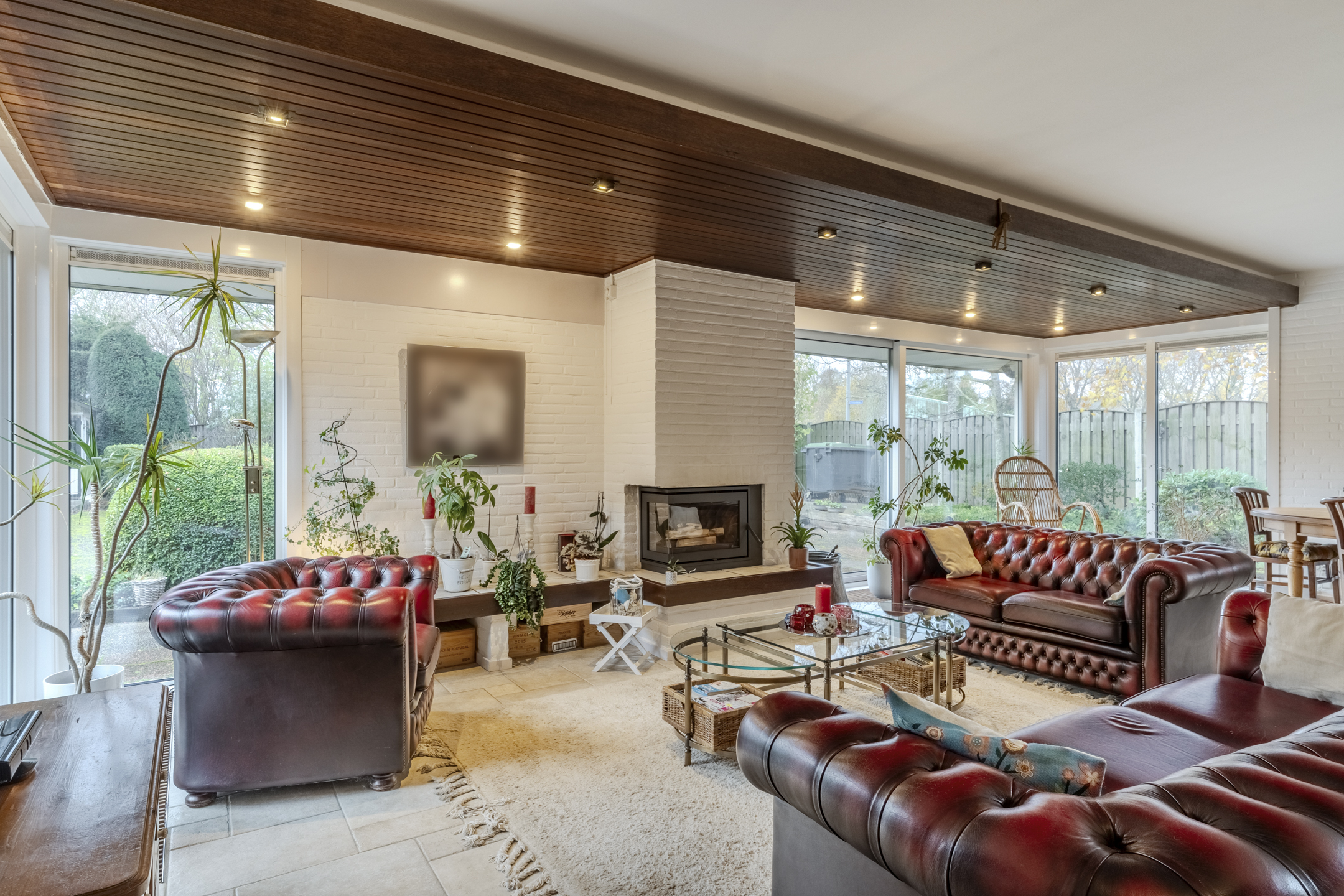 Entree/ontvangsthal met tegelvloer, meterkast (vernieuwd, 3x25A), licht betegelde toiletruimte, trappartij naar de eerste verdieping en toegang tot de op de begane grond gelegen slaapkamer met volledig betegelde doucheruimte en-suite (momenteel in gebruik als werkkamer met archiefruimte). Riante living (ca. 74m²) voorzien van tegelvloer met vloerverwarming, schuifpui naar de achtertuin, een sfeervolle houtgestookte inzethaard (2024), indirecte plafond verlichting en een half-open keuken met een keukeninrichting in U-opstelling met veel kastruimte en de navolgende inbouwapparatuur te weten: gaskookplaat, rvs-afzuigkap, grote koelkast, combi-magnetron, vaatwasmachine en een Quooker. Vanuit de keuken is er een prettig direct contact met de rest van de living.