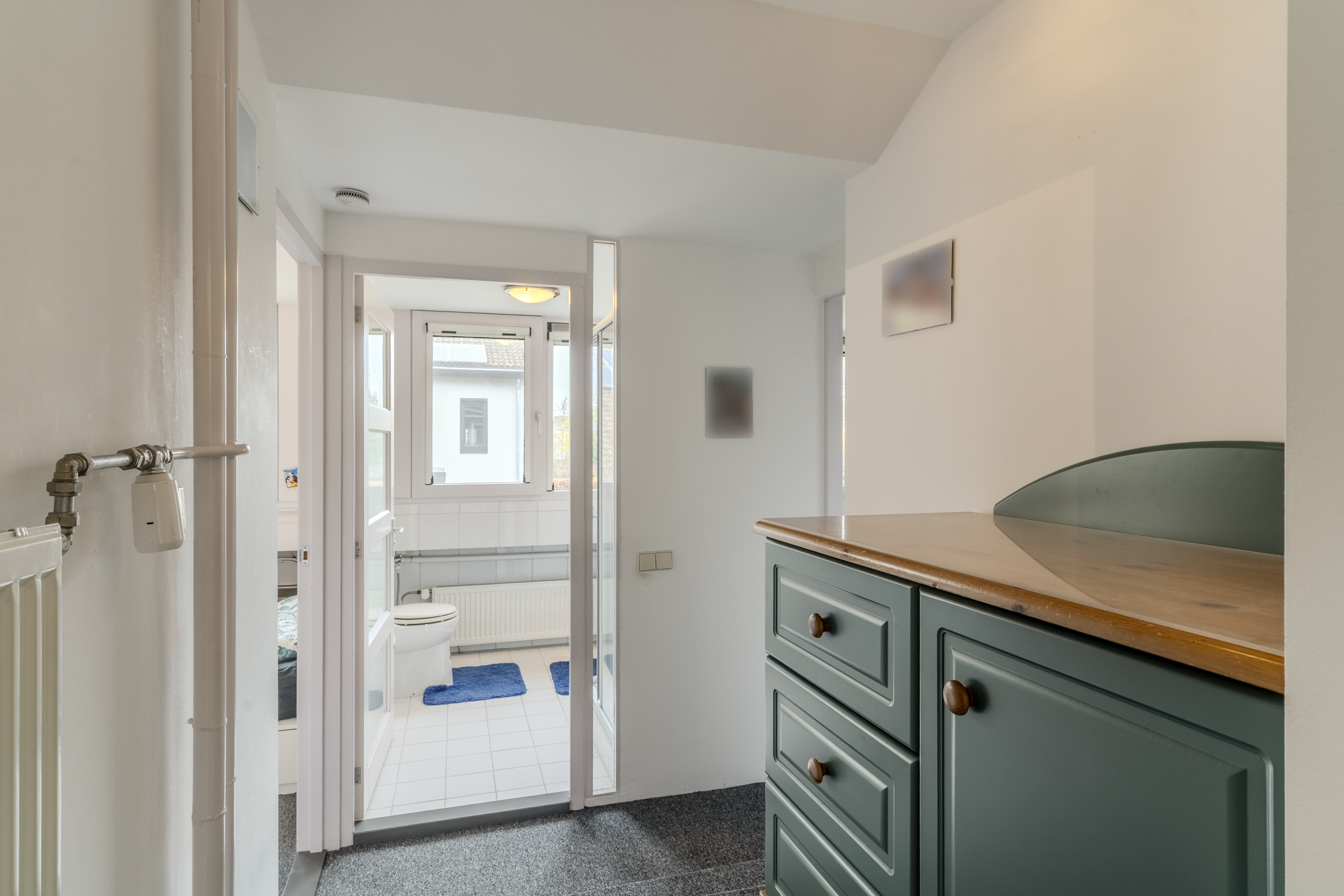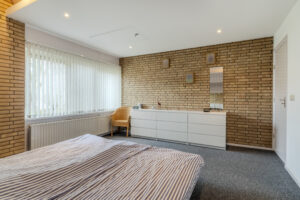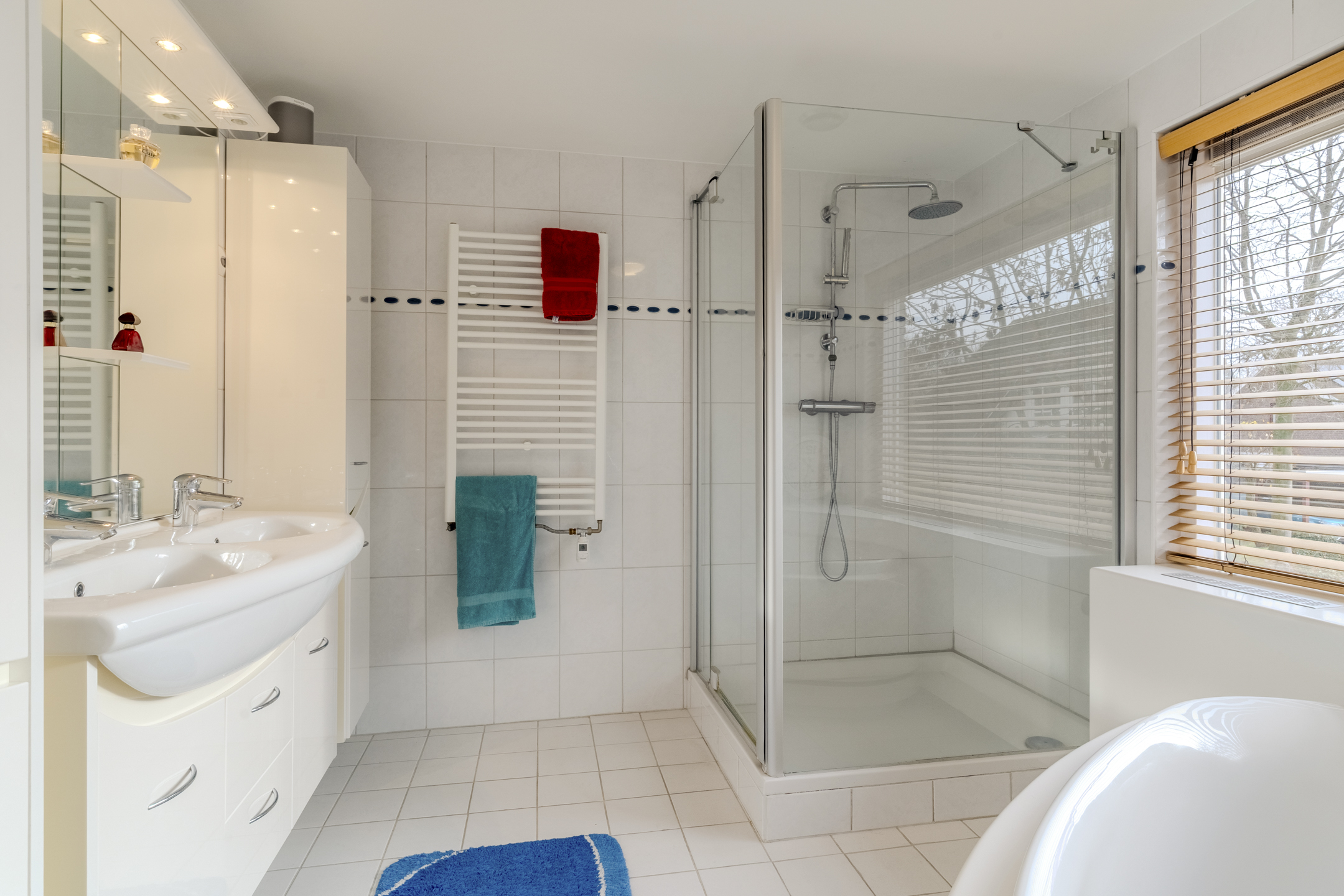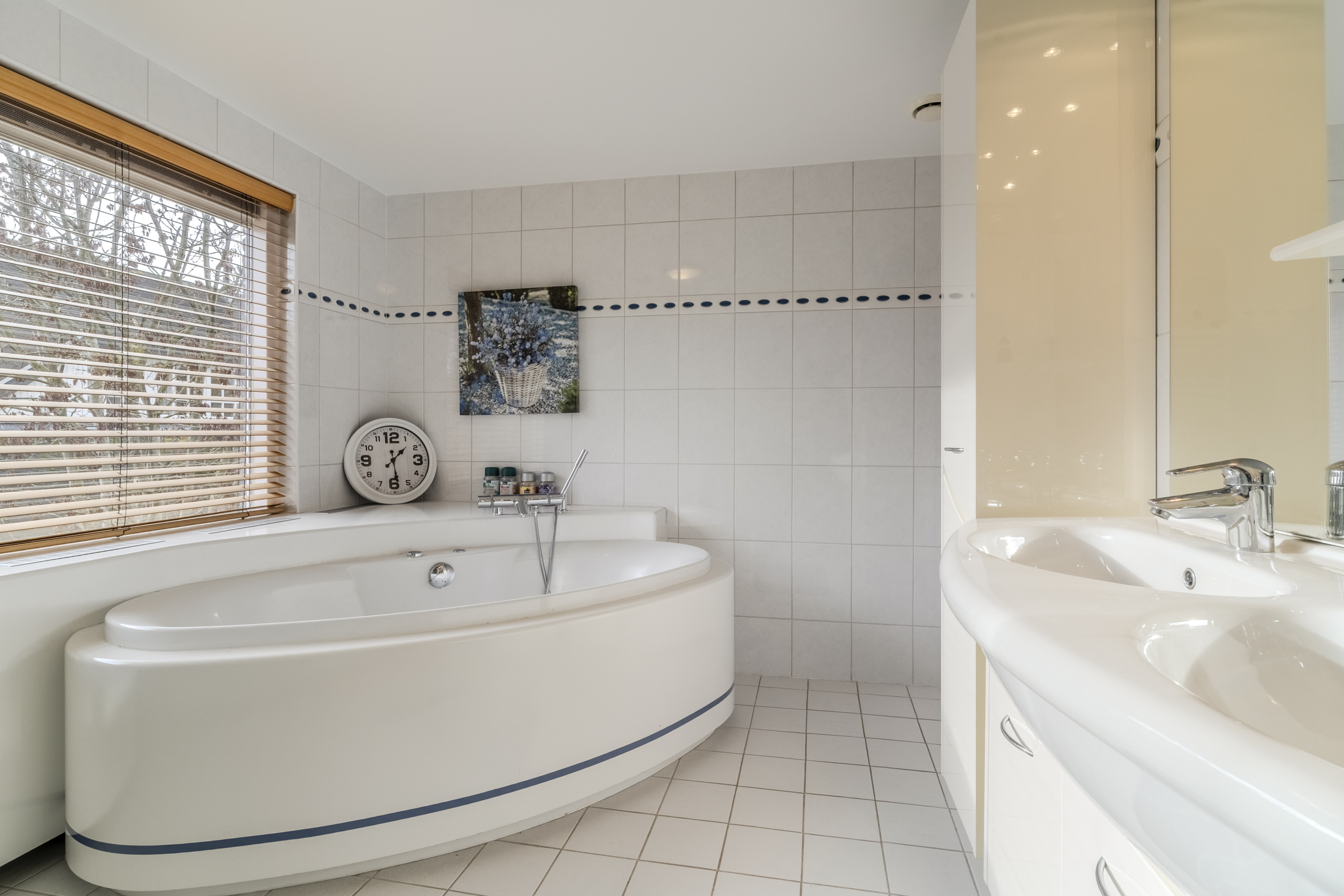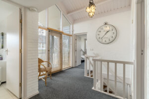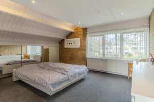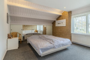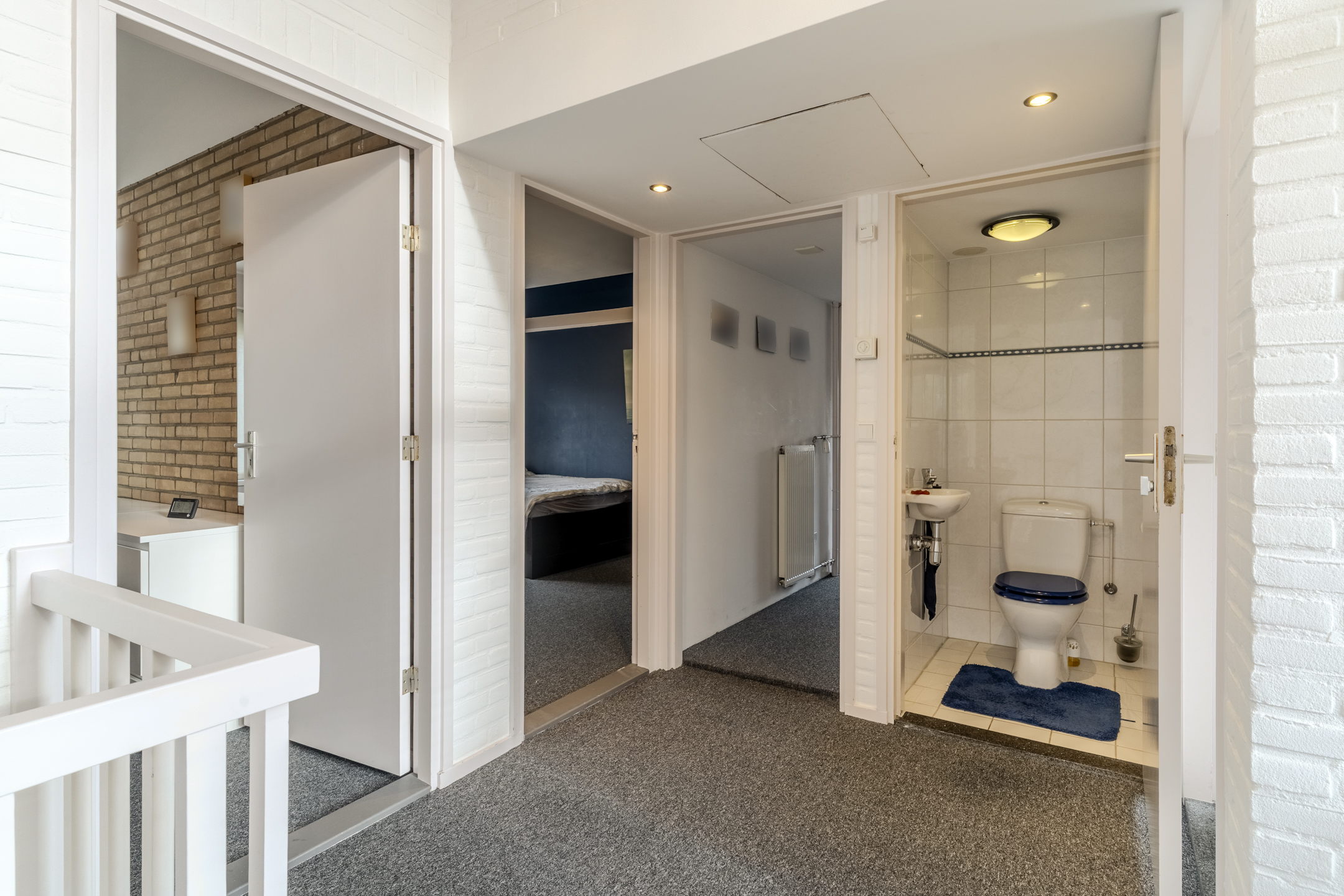 Overloop met aparte 2e toiletruimte, zicht tot in de nok, luik naar bergvliering (1), toegang tot de 5 slaapkamers en de twee badkamers. De indeling is als volgt: riante hoofdslaapkamer (ca. 20m²). Deze kamer is voorzien van een grote bergruimte, tripple glas en een luik met vlizotrap naar de bovengelegen bergvliering (2), slaapkamer (ca. 14m²) met dakkapel aan de achtertuinzijde, slaapkamer (ca. 14m²) met tripple glas en luik met vlizotrap naar bovengelegen bergvliering (3), slaapkamer (ca. 13m²) met grote dakkapel, slaapkamer (ca. 7m²) met dakkapel. Badkamer (ca. 9m²) welke is ingericht met een ligbad/whirlpool, aparte douchecabine en een dubbele vaste wastafel in een wandmeubel. Tweede badkamer met douchecabine, vaste wastafel en een derde toilet (Sanibroyeur).