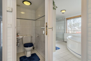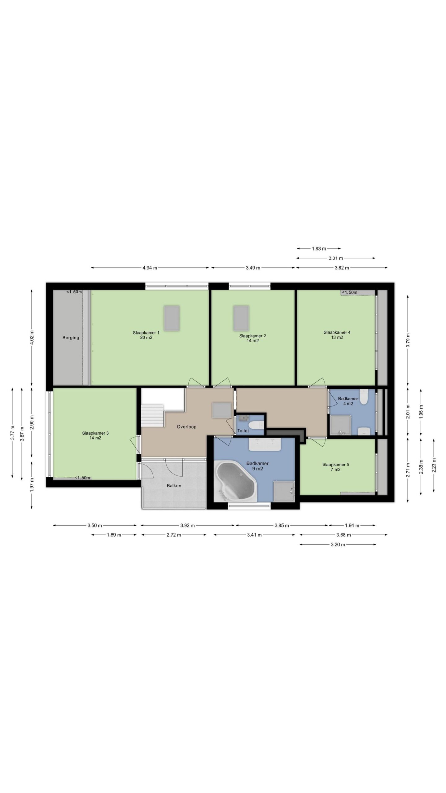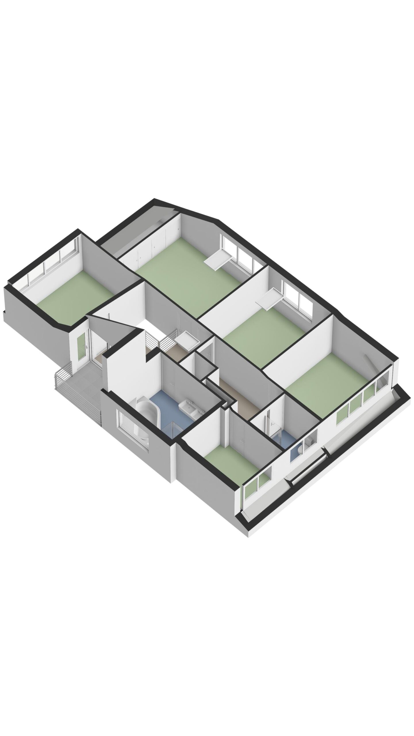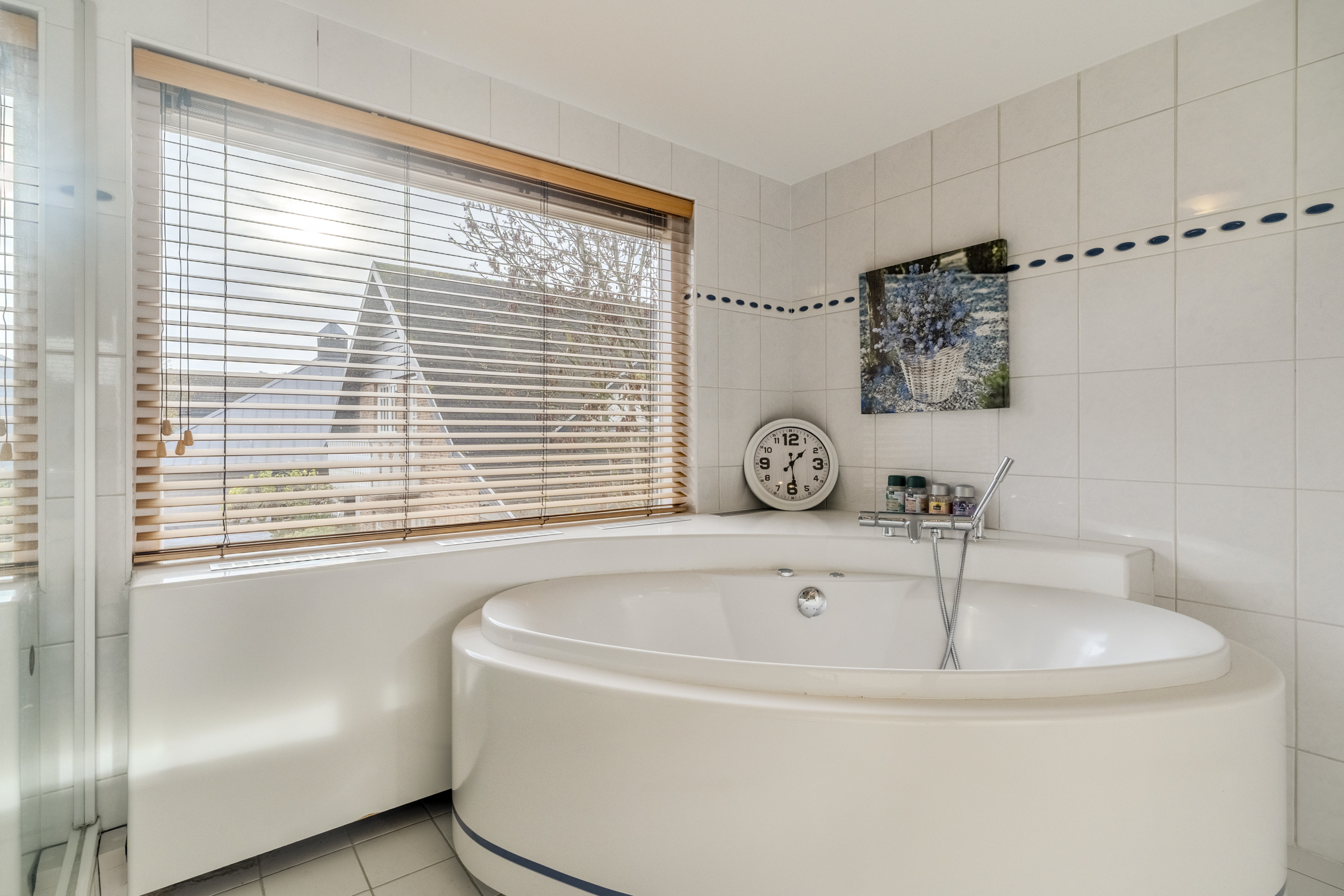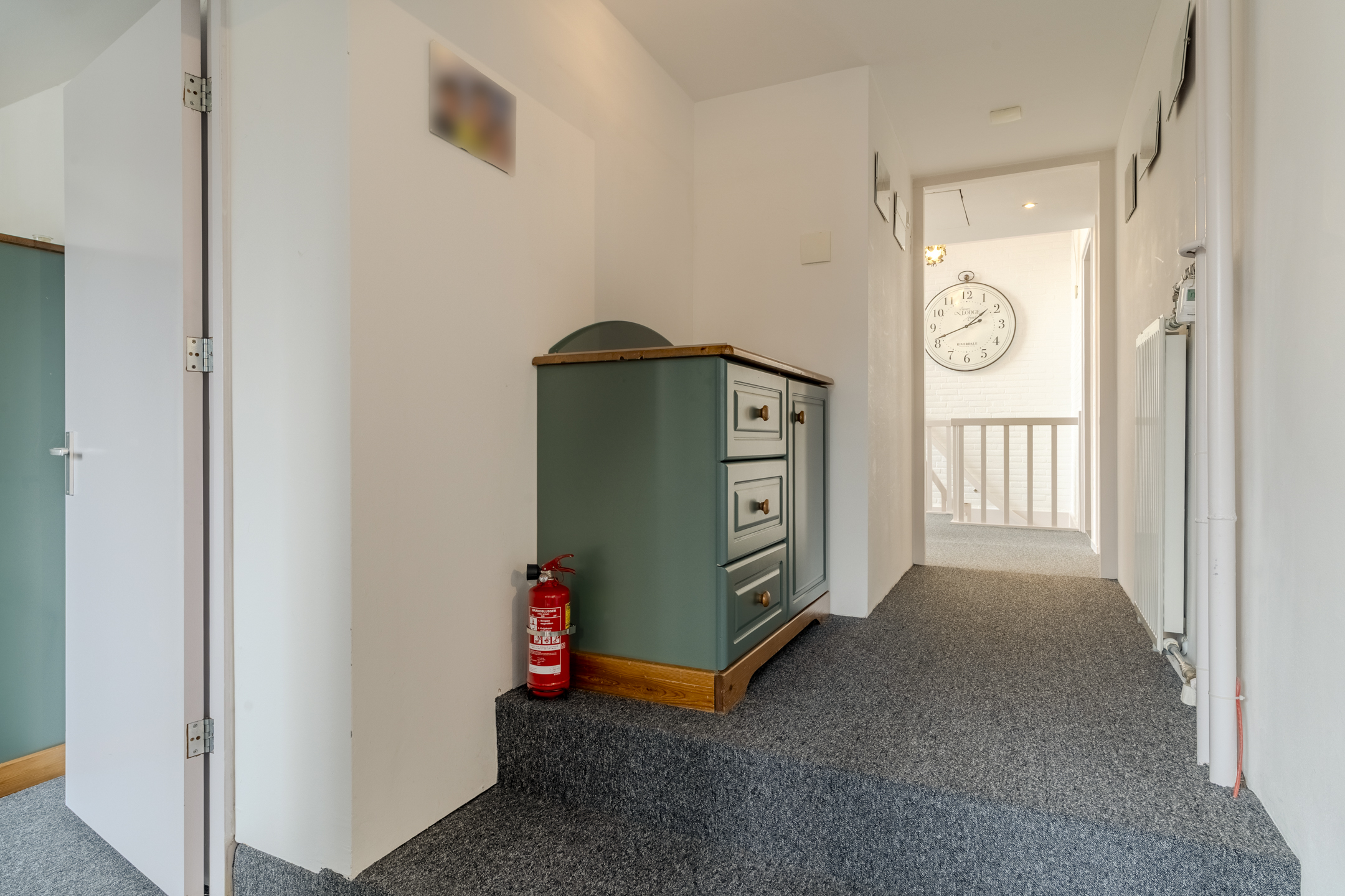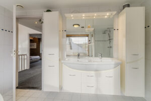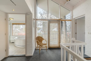 Overloop met aparte 2e toiletruimte, zicht tot in de nok, luik naar bergvliering (1), toegang tot de 5 slaapkamers en de twee badkamers. De indeling is als volgt: riante hoofdslaapkamer (ca. 20m²). Deze kamer is voorzien van een grote bergruimte, tripple glas en een luik met vlizotrap naar de bovengelegen bergvliering (2), slaapkamer (ca. 14m²) met dakkapel aan de achtertuinzijde, slaapkamer (ca. 14m²) met tripple glas en luik met vlizotrap naar bovengelegen bergvliering (3), slaapkamer (ca. 13m²) met grote dakkapel, slaapkamer (ca. 7m²) met dakkapel. Badkamer (ca. 9m²) welke is ingericht met een ligbad/whirlpool, aparte douchecabine en een dubbele vaste wastafel in een wandmeubel. Tweede badkamer met douchecabine, vaste wastafel en een derde toilet (Sanibroyeur).