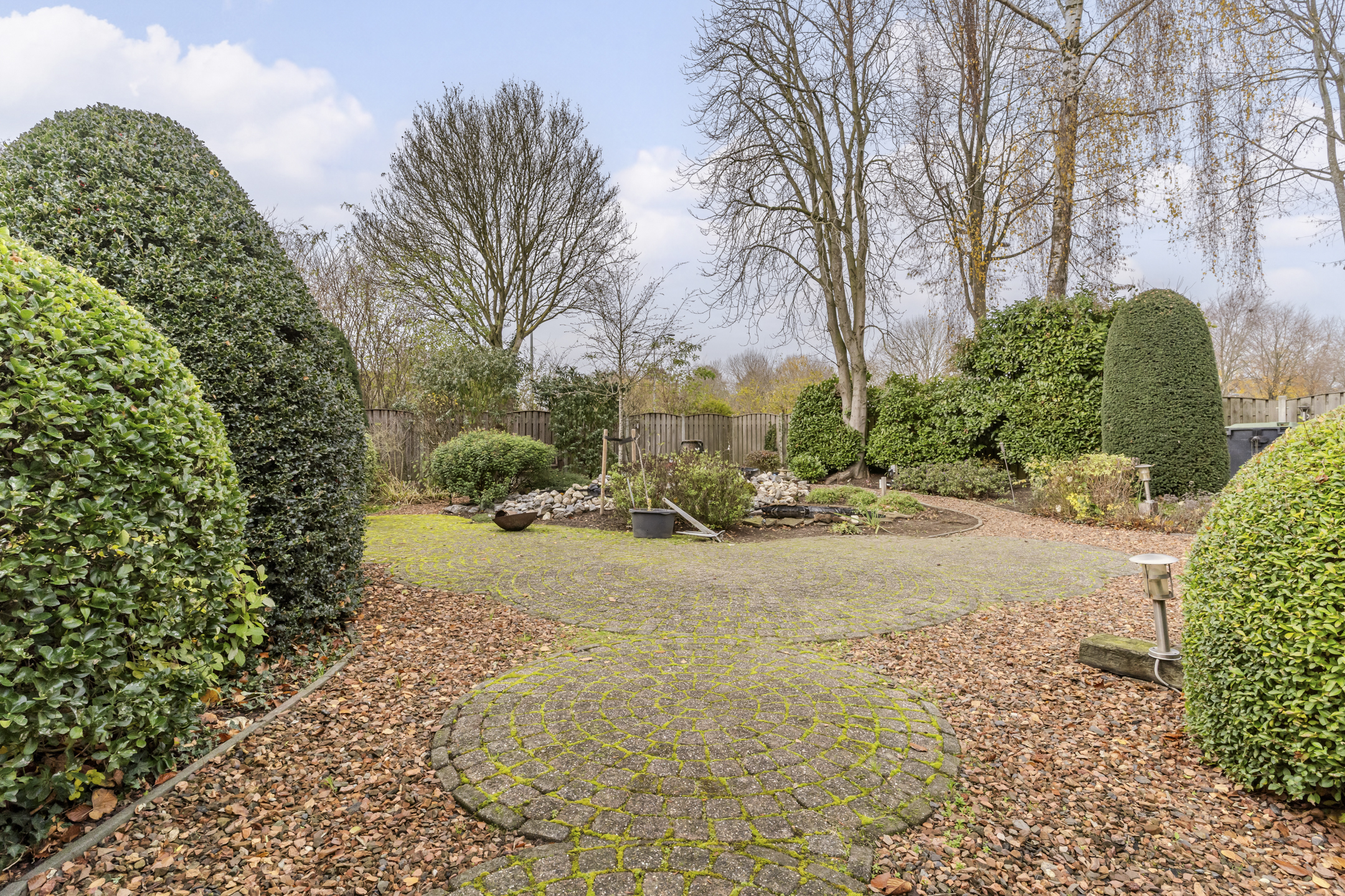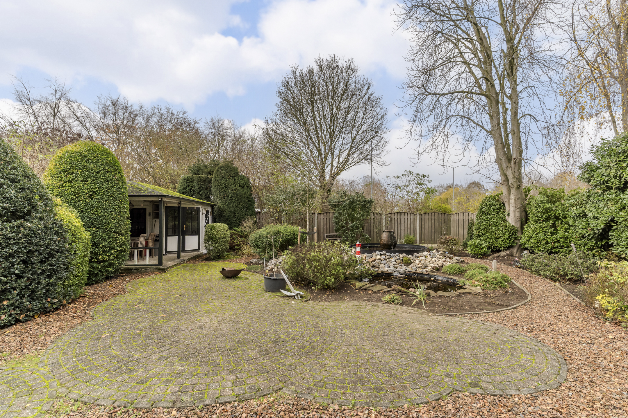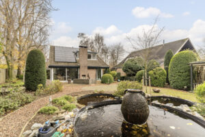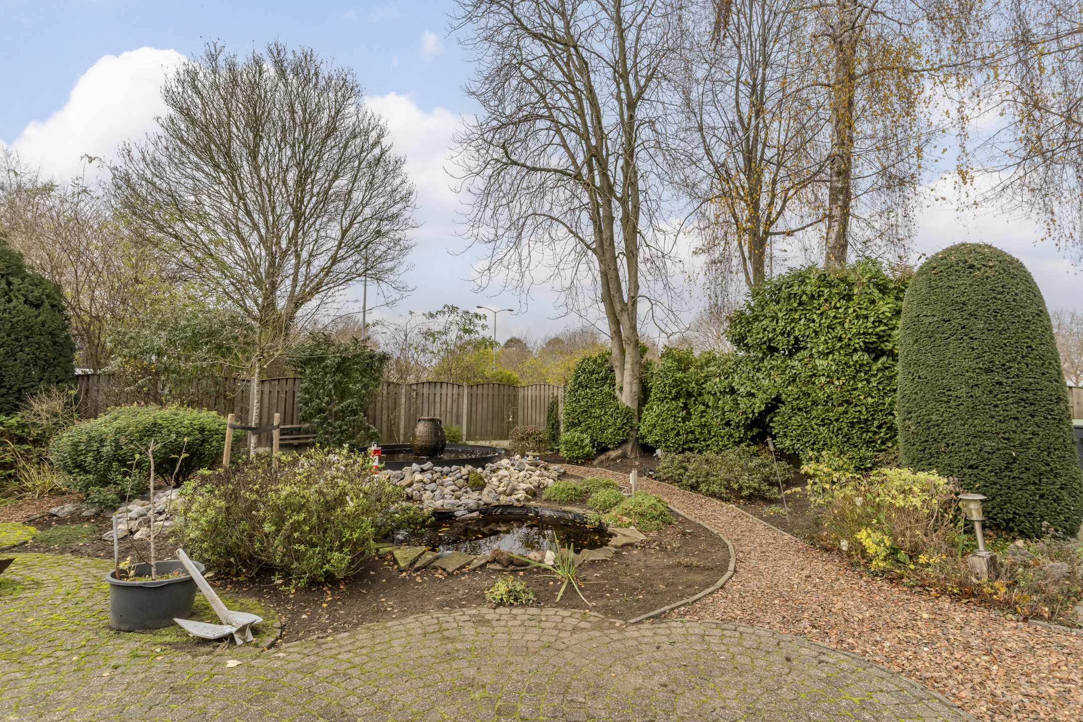 Ruime rondom de woning gesitueerde tuin welke is aangelegd met diverse terrassen, volwassen beplanting, vijver en een houten terrasoverkapping met berging. De tuin is op het westen gelegen en biedt heel veel privacy. Aan de voorzijde is er volop parkeergelegenheid op eigen terrein.
