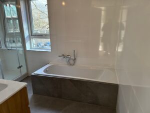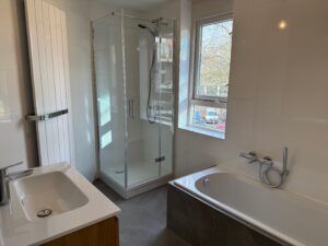 Entree/hal met meterkast, video-intercom installatie, deels licht betegelde toiletruimte met fontein. Slaapkamer 1 (ca. 3,77x2,08m), ruim opgezette recent geplaatste (2025) luxe badkamer met prettige daglichtinval welke is ingericht met een ligbad, aparte douchecabine en een vaste wastafel in een wandmeubel. Grote hoofdslaapkamer (ca. 14m²).