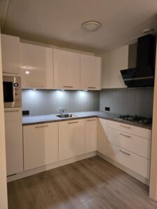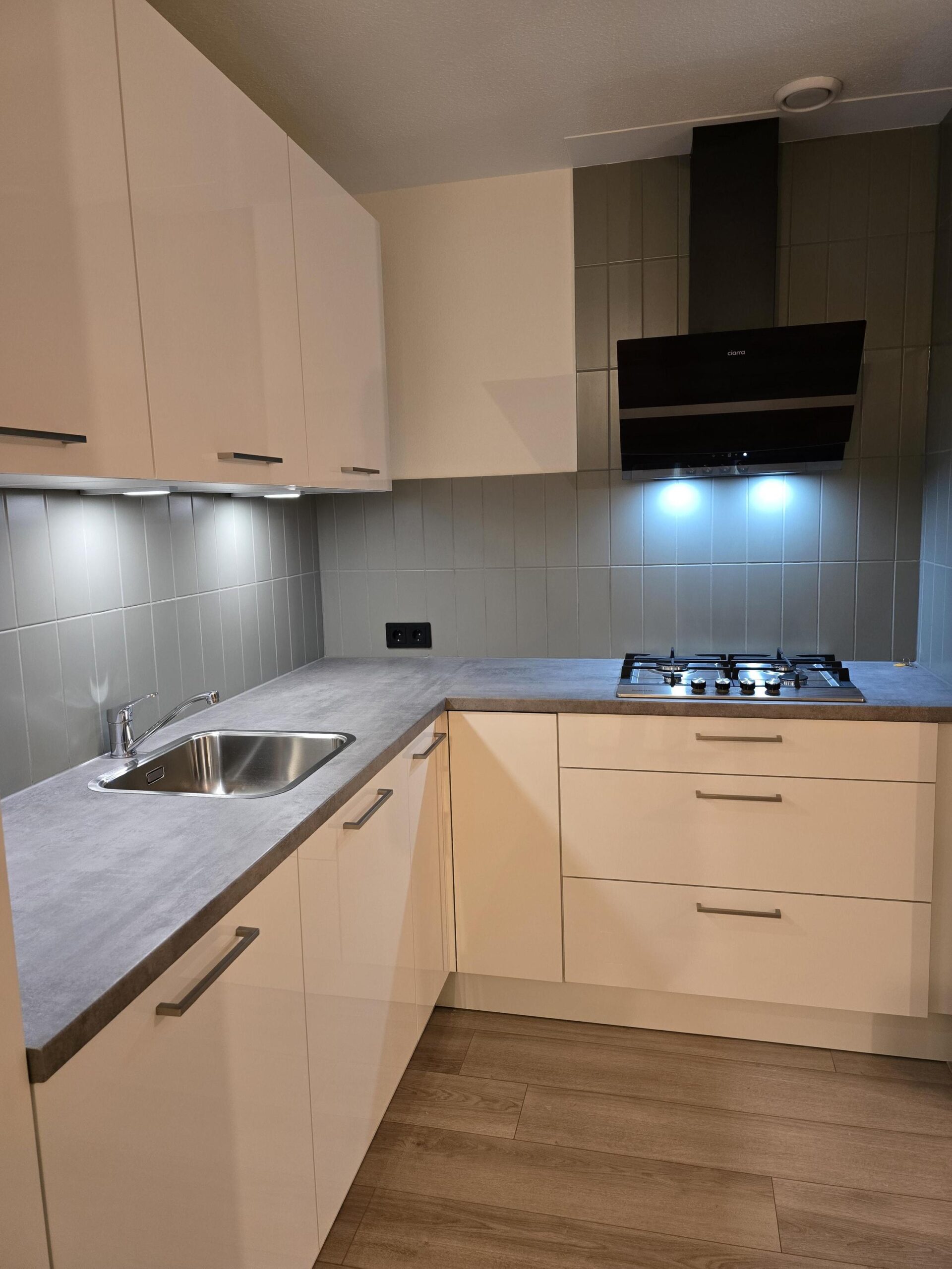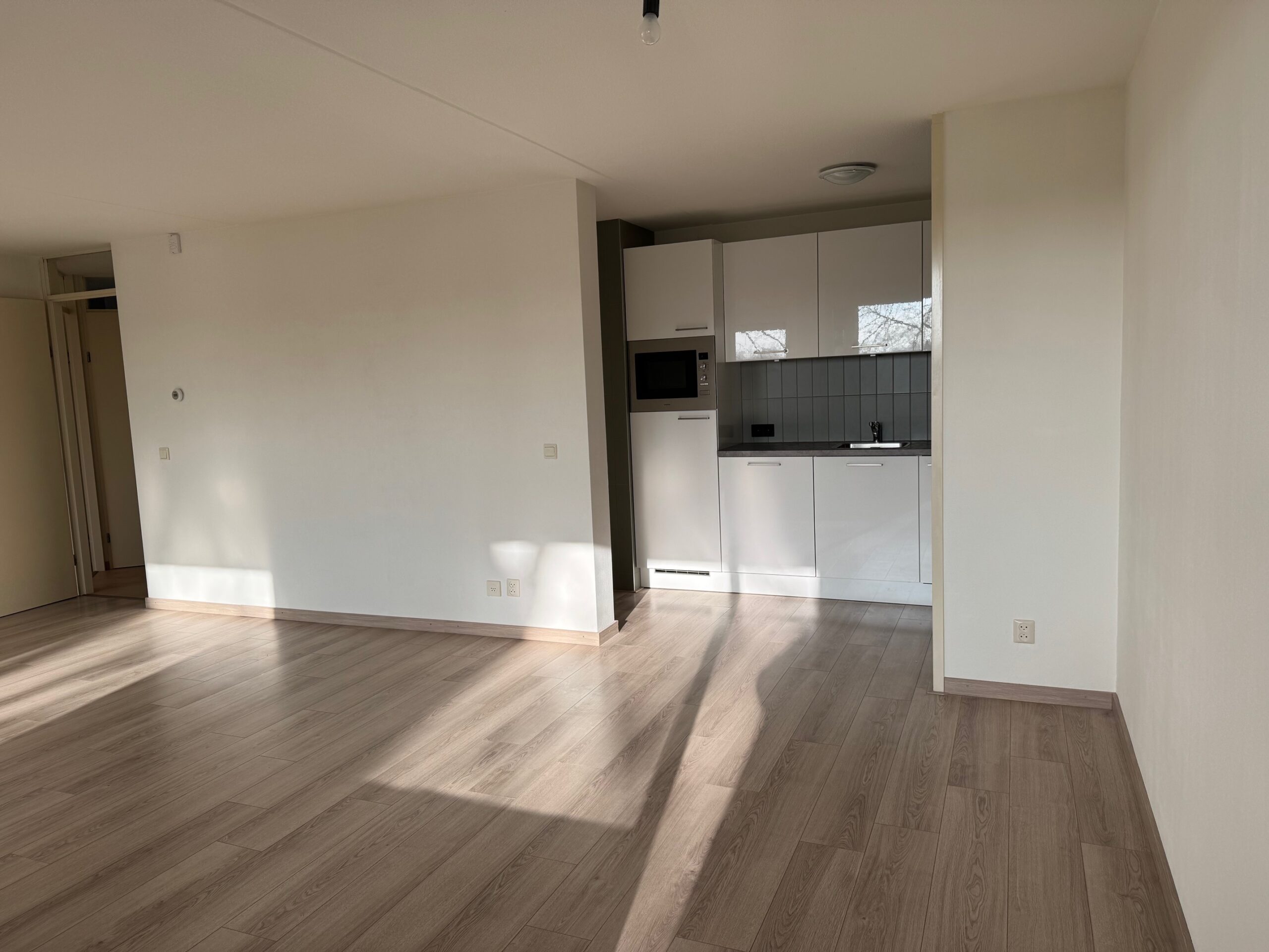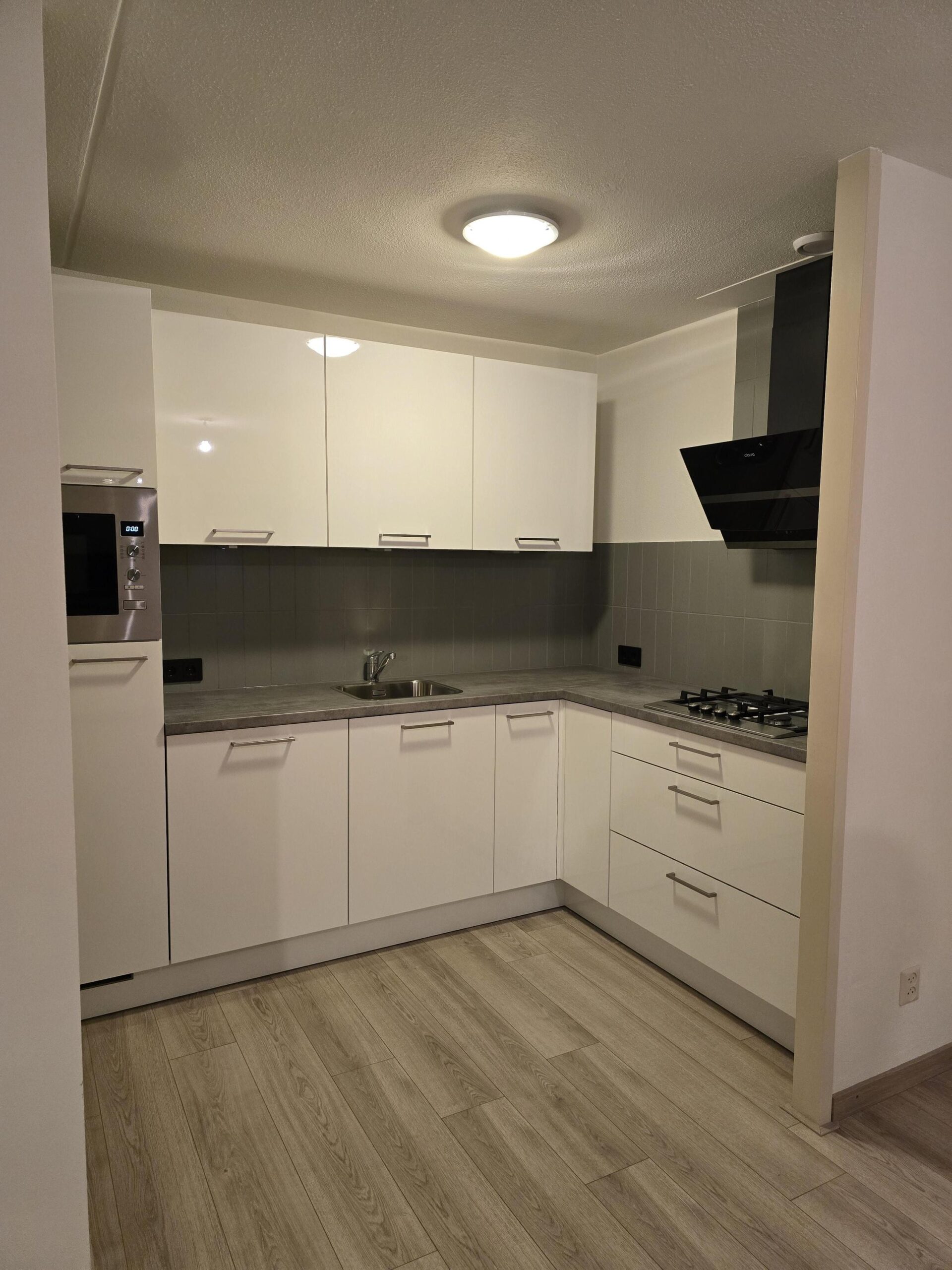 Ruime living voorzien van half-open keuken welke is ingericht met een recent (2025) geplaatste luxe in hoogglans uitgevoerde keukeninrichting met diverse kastruimte en de navolgende inbouwapparatuur te weten: 4-pits gaskookplaat, combi-magnetron, recirculatie afzuigkap, koelkast en een vaatwasmachine. Praktische bijkeuken met opstelplaats van de CV-combiketel (Remeha Avanta ACE28C CW4, oktober 2022), de unit voor de mechanische ventilatie (vernieuwd in 2025) en de aansluitingen ten behoeve van de wasapparatuur. Vanuit de living is er toegang tot het ruime (ca. 6m²) op het zuiden gelegen overdekte balkon. De hal, slaapkamers, woonkamer en keuken zijn allen voorzien van een hoogwaardige laminaatvloer.