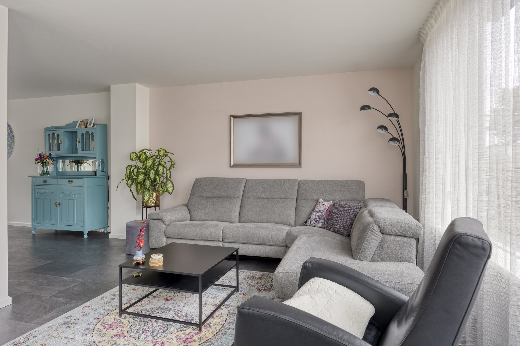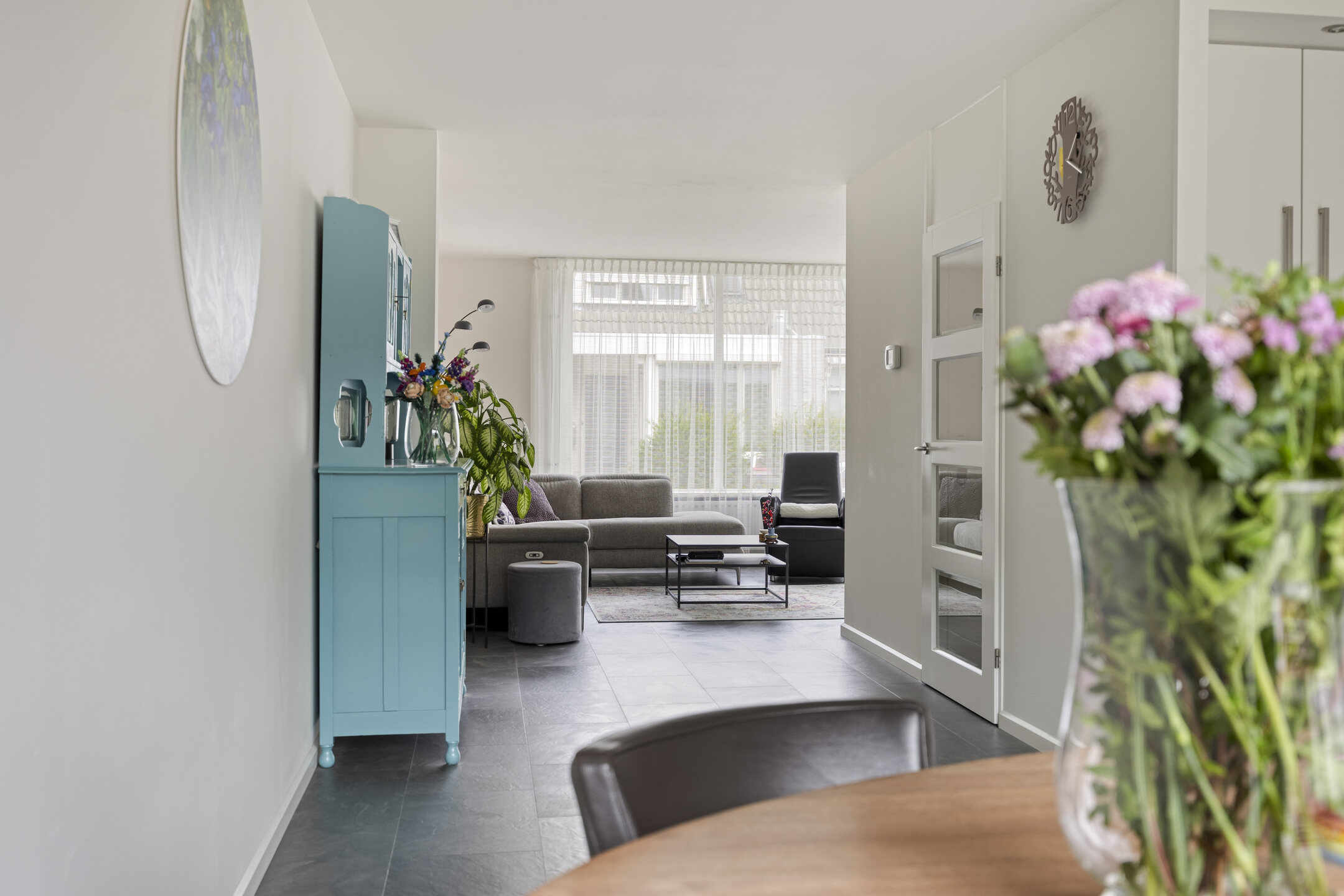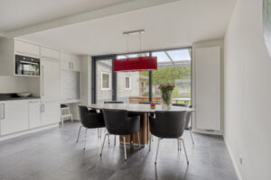 Grote U-vormige living (ca. 48m²) voorzien van een fraaie laminaatvloer en een woon/eetkeuken aan de tuinzijde met keukeninrichting in hoekopstelling voorzien van diverse inbouwapparatuur te weten: inductie-kookplaat, koel/vriescombinatie, vaatwasmachine, koelkast,