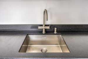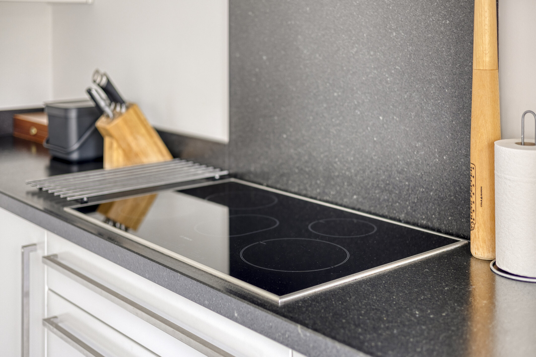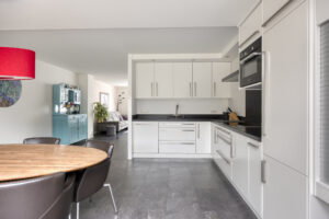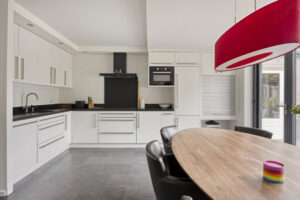 combi-oven/magnetron en een afzuigschouw. Het geheel is voorzien van diverse kastruimte en is afgewerkt met een fraai natuurstenen werkblad! Vanuit de keuken is er door middel van een loopdeur in een vaste glas-pui toegang tot het aan de achterzijde van de woning gelegen overdekt terras.