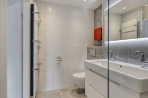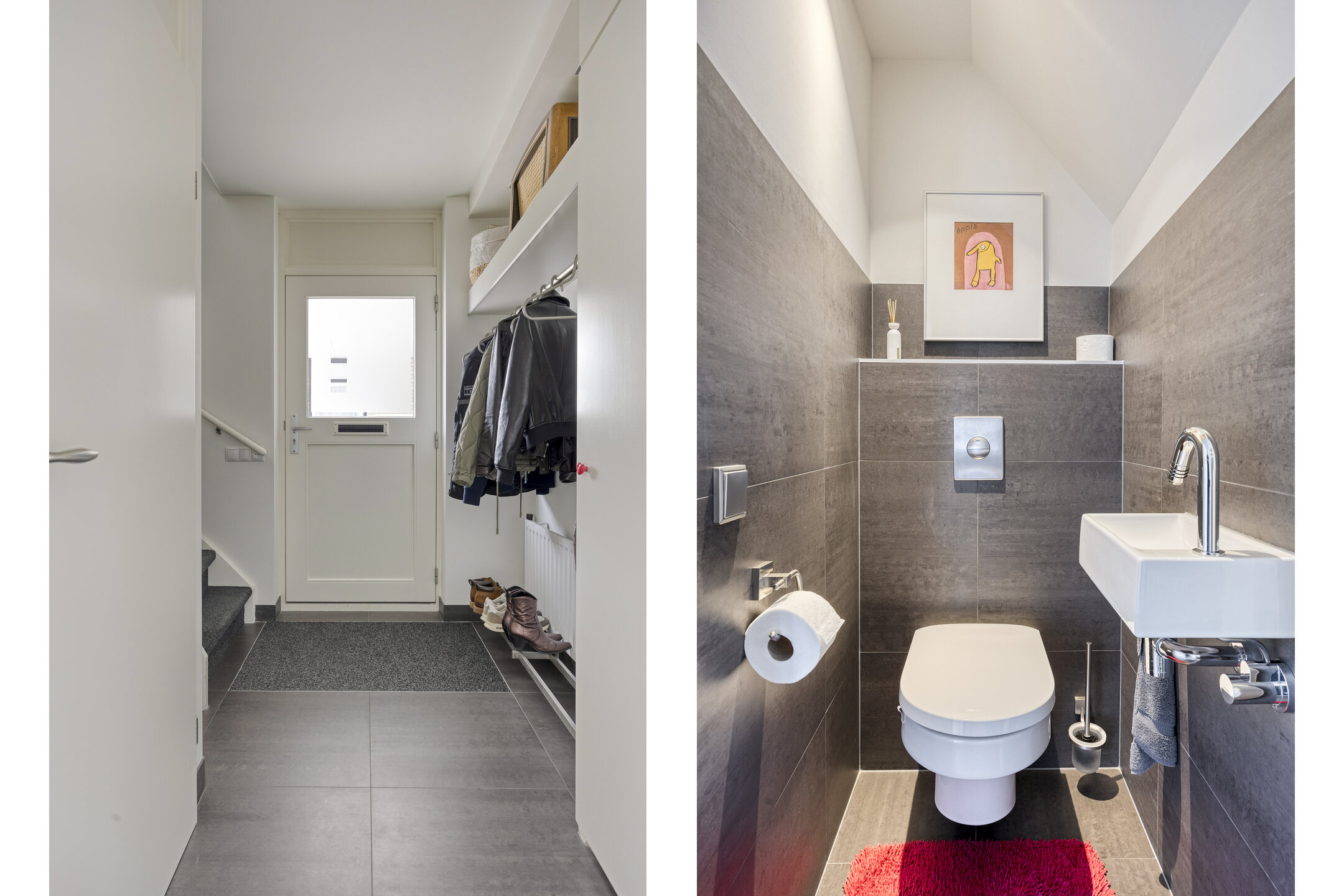 Zij/entree, hal met trapopgang naar de eerste verdieping, trapkast, meterkast en de luxe afgewerkte toiletruimte met een vrijhangend closet en een fonteintje.
