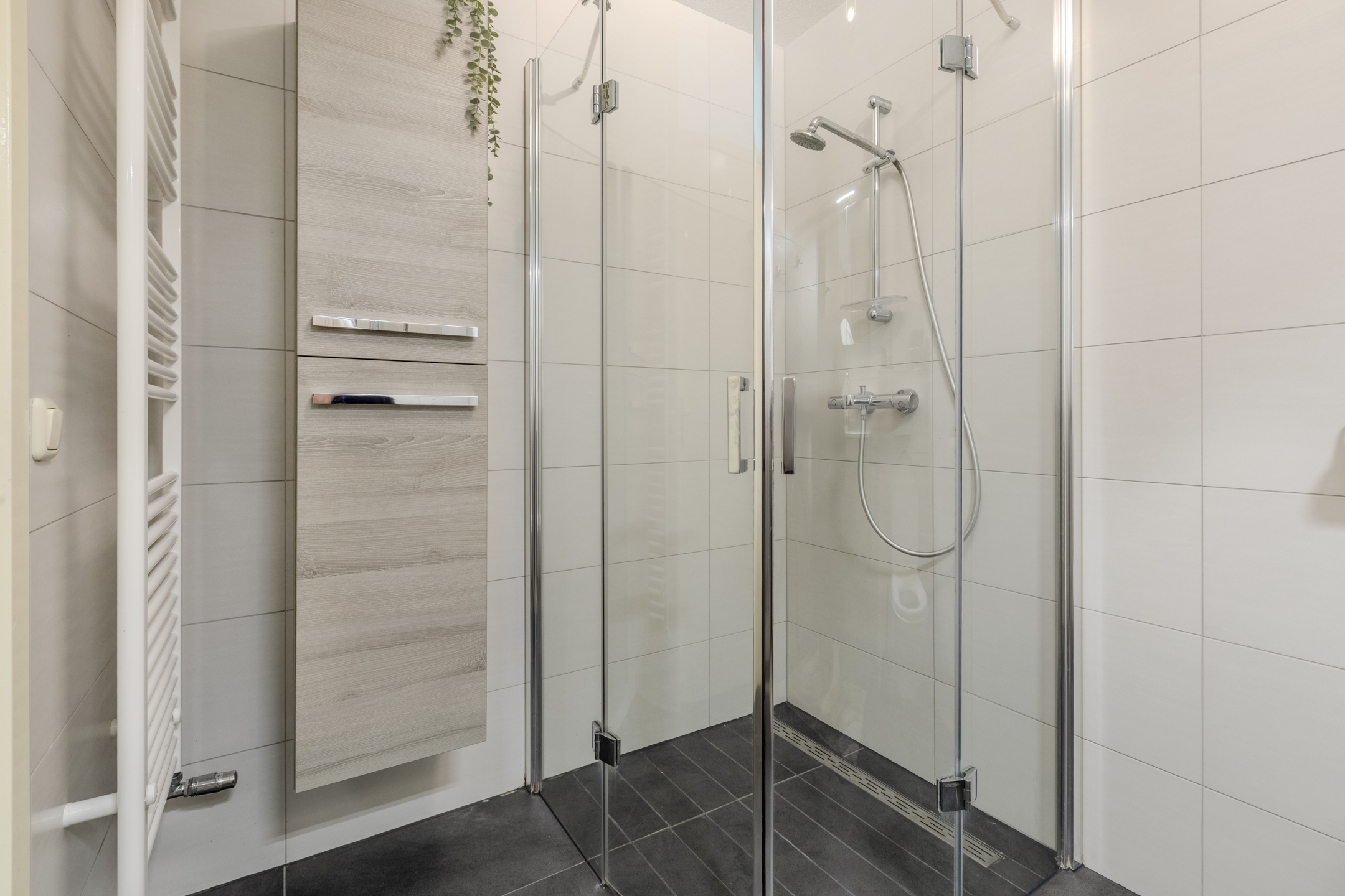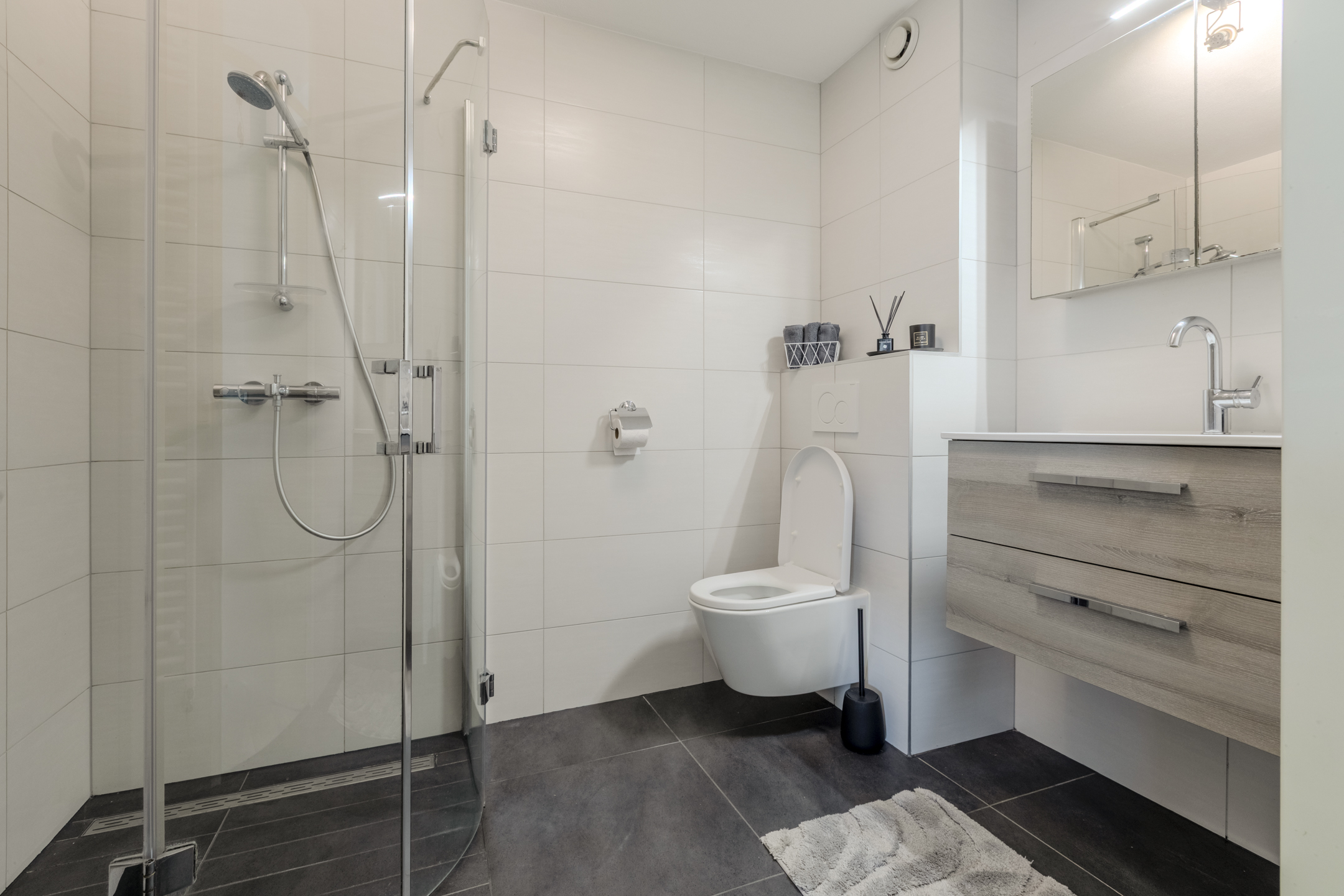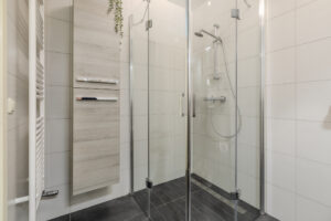 De slaapkamers en de royale overloop zijn voorzien van een fraaie laminaatvloer. Luxe afgewerkte en compleet ingerichte badkamer welke is voorzien van een inloopdouche met glaswanden, tweede vrijhangend closet en vaste wastafel in een wandmeubel.