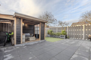 Leuk aangelegde en verzorgde achtertuin met een fraaie overkapping. Hier kan ’s avonds tot laat van de zon worden genoten. De tuin is voorzien van een sierbestraat terras, een kunstgrasgazon, zonwering aan de achtergevel en een poort naar de openbaren weg. In de tuin bevindt zich ook nog een buitenkraantje.