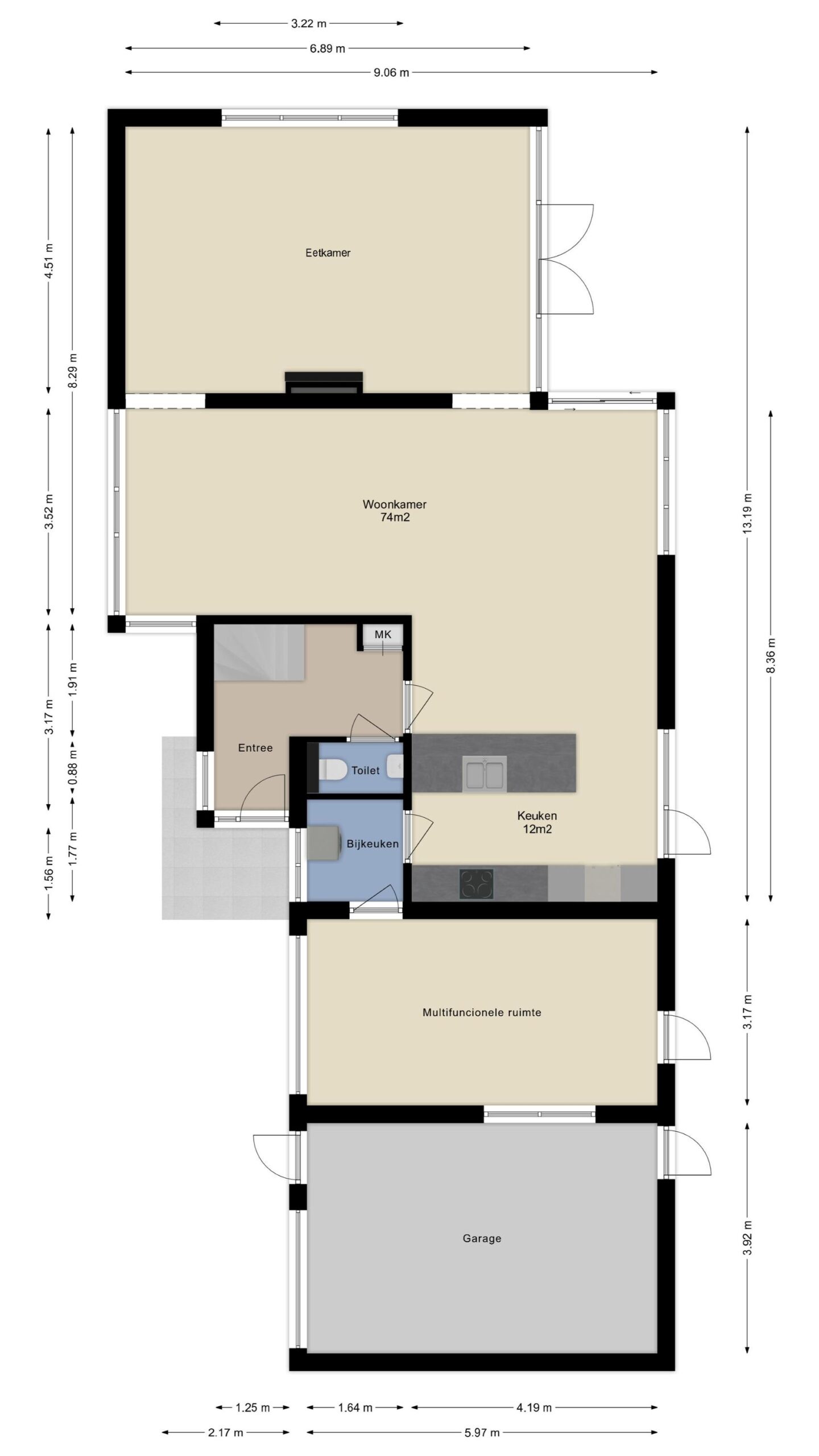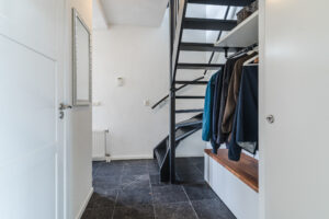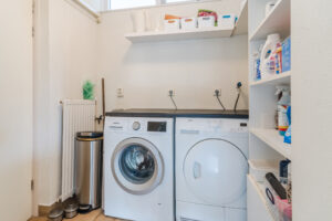 Praktische bijkeuken met aansluitingen ten behoeve van de wasapparatuur en toegang tot de voormalige garage welke nu als multifunctionele ruimte in gebruik is. Vanuit deze multifunctionele ruimte is er middels een loopdeur toegang tot de achtertuin.