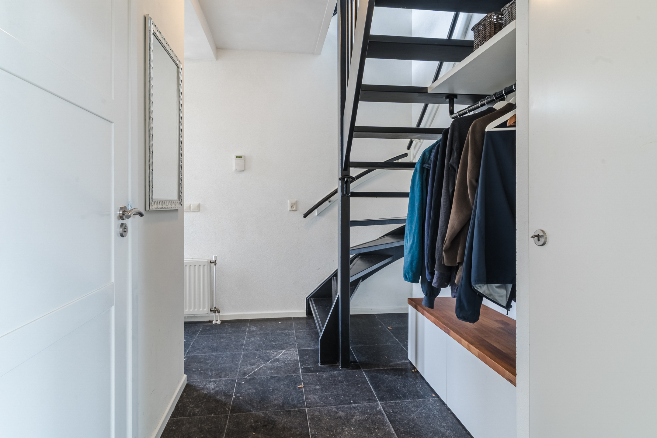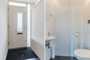 Entree/hal met natuurstenen vloer en trapopgang naar de eerste verdieping, meterkast en geheel betegelde toiletruimte met vrij hangend closet en fontein.