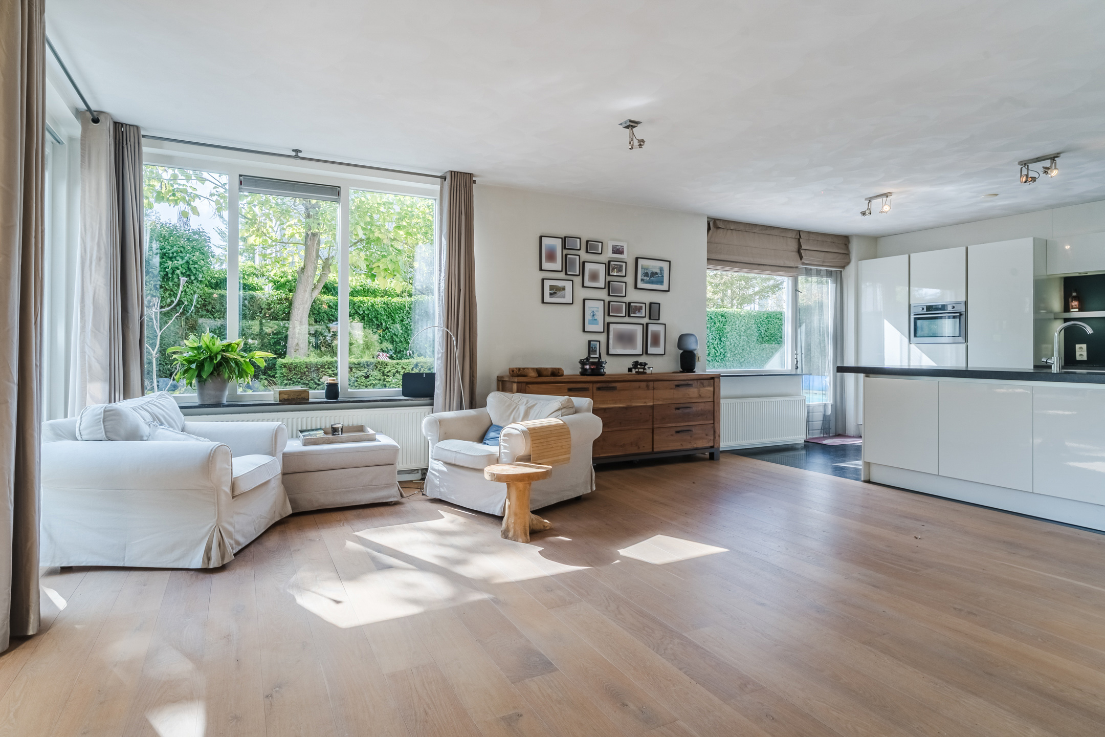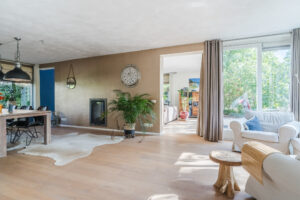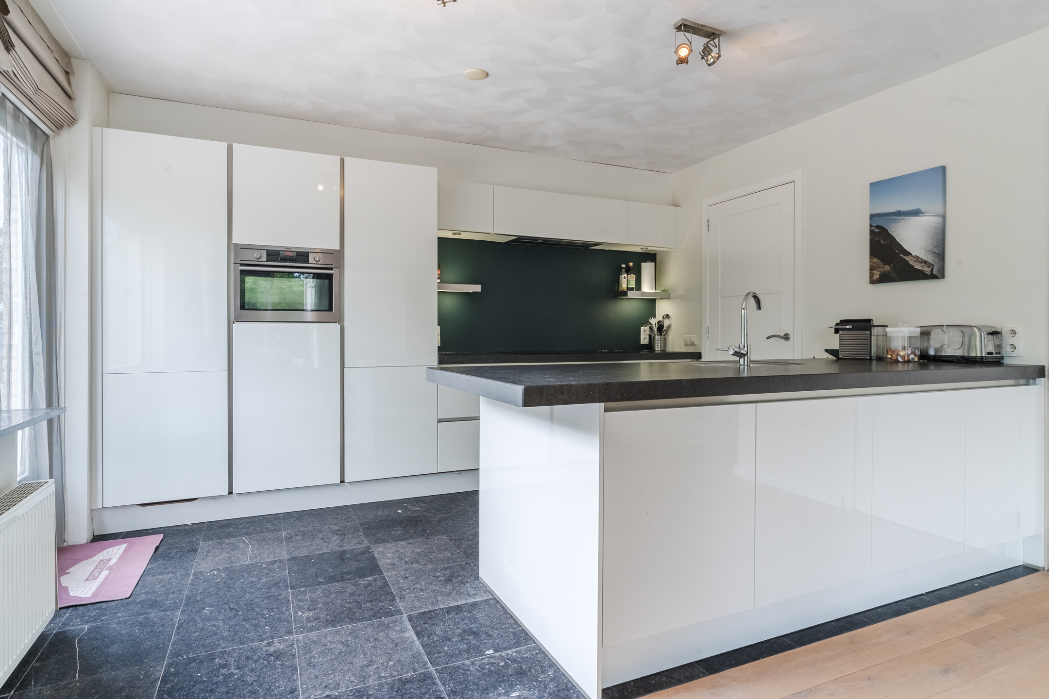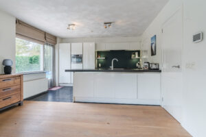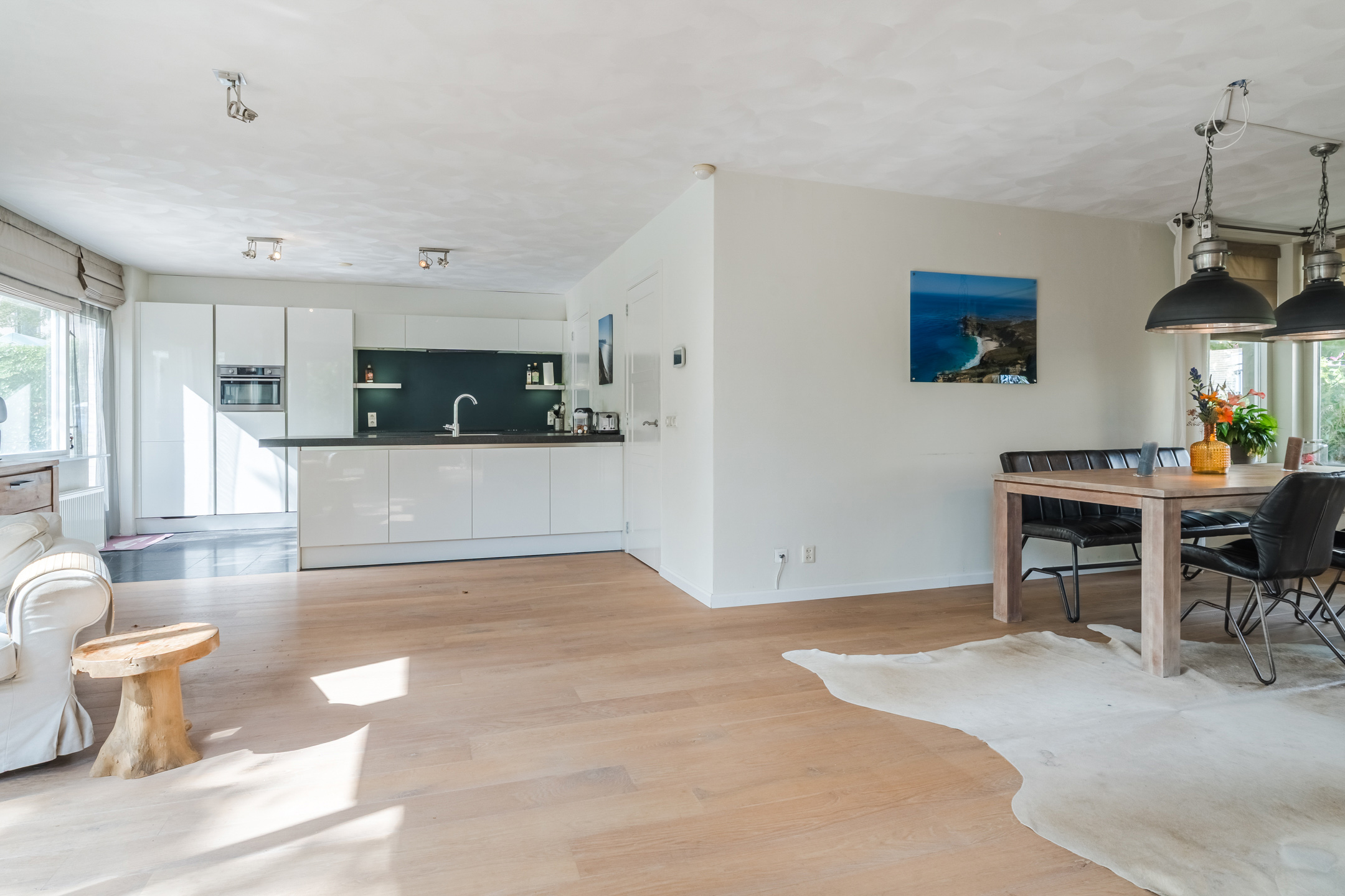Ruime speels ingedeelde en uitgebouwde living van ca. 86m² met gashaard, massief eikenhouten vloer, schuifpui en openslaande tuindeuren naar de tuin en een half open keuken voorzien van een lichte keukeninrichting (ca. 2013) met werk/spoeleiland en diverse inbouwapparatuur te weten: 6-pits inductiekookplaat, afzuiging, combi-magnetron, vaatwasmachine en een koel/vries combinatie. Het geheel is afgewerkt met een fraai werkblad.