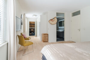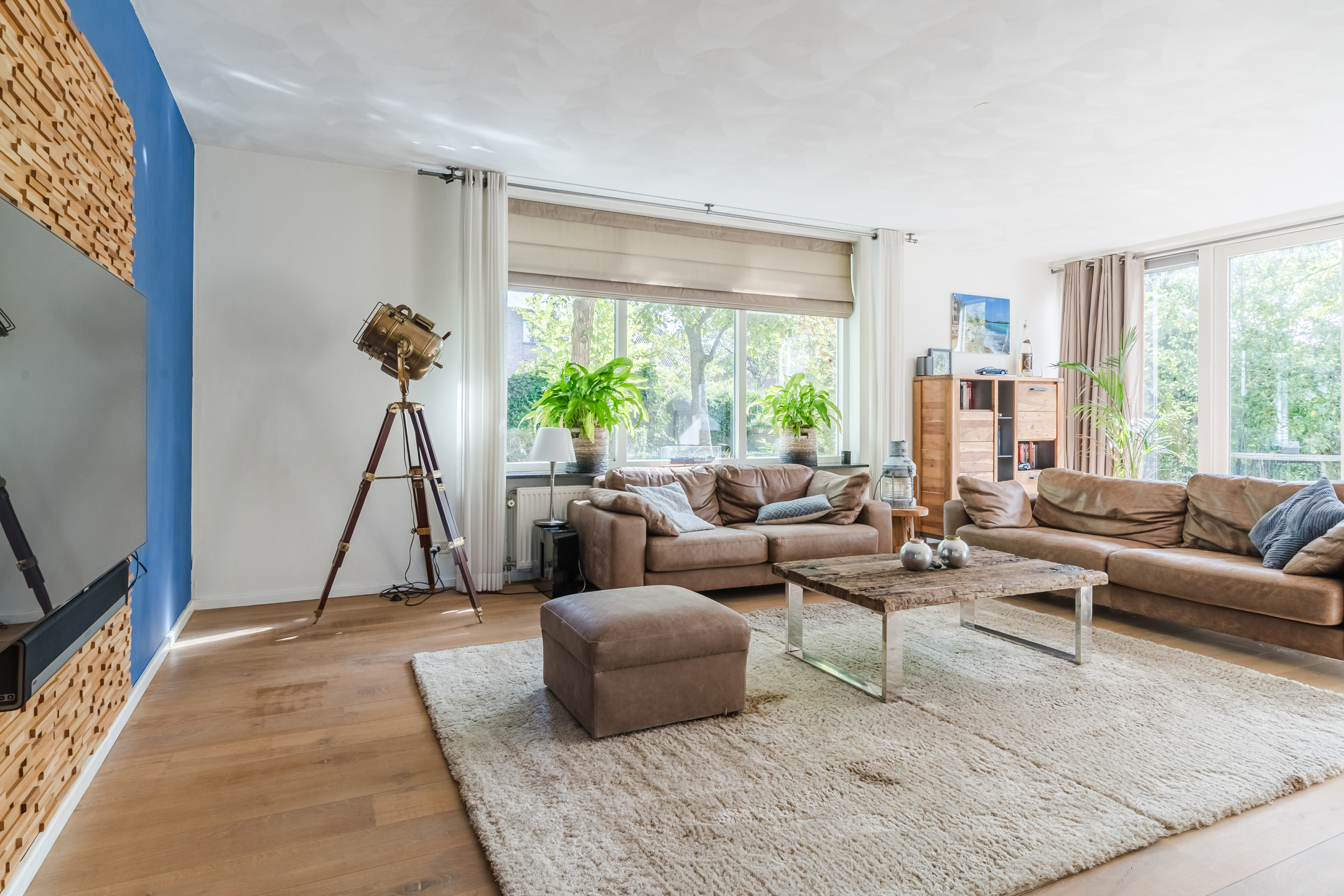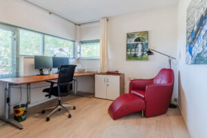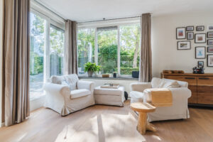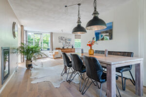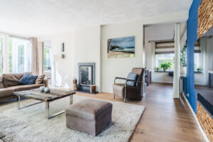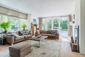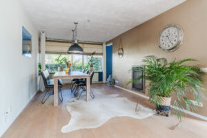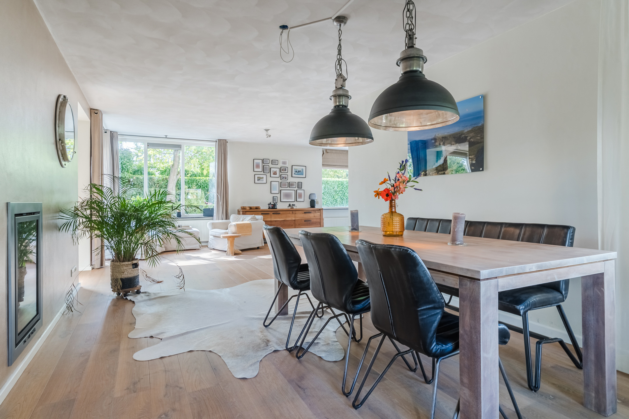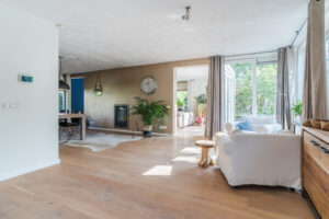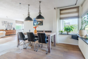 Ruime speels ingedeelde en uitgebouwde living van ca. 86m² met gashaard, massief eikenhouten vloer, schuifpui en openslaande tuindeuren naar de tuin en een half open keuken voorzien van een lichte keukeninrichting (ca. 2013) met werk/spoeleiland en diverse inbouwapparatuur te weten: 6-pits inductiekookplaat, afzuiging, combi-magnetron, vaatwasmachine en een koel/vries combinatie. Het geheel is afgewerkt met een fraai werkblad.