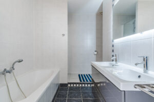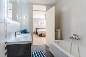 Overloop, licht betegelde (1e) badkamer met douchecabine, vaste wastafel in meubel en een tweede vrij hangend closet, slaapkamer ca. 12m², royale hoofdslaapkamer ca. 27m² met eigen (2e) badkamer en suite voorzien van ligbad, aparte douchecabine, een derde vrijhangend closet en een dubbele vaste wastafel in meubel. De hoofdslaapkamer biedt toegang tot een royale inloop-bergruimte.