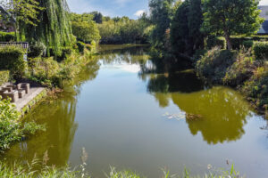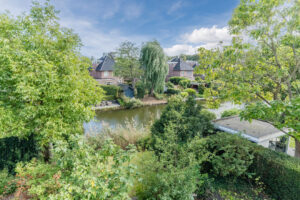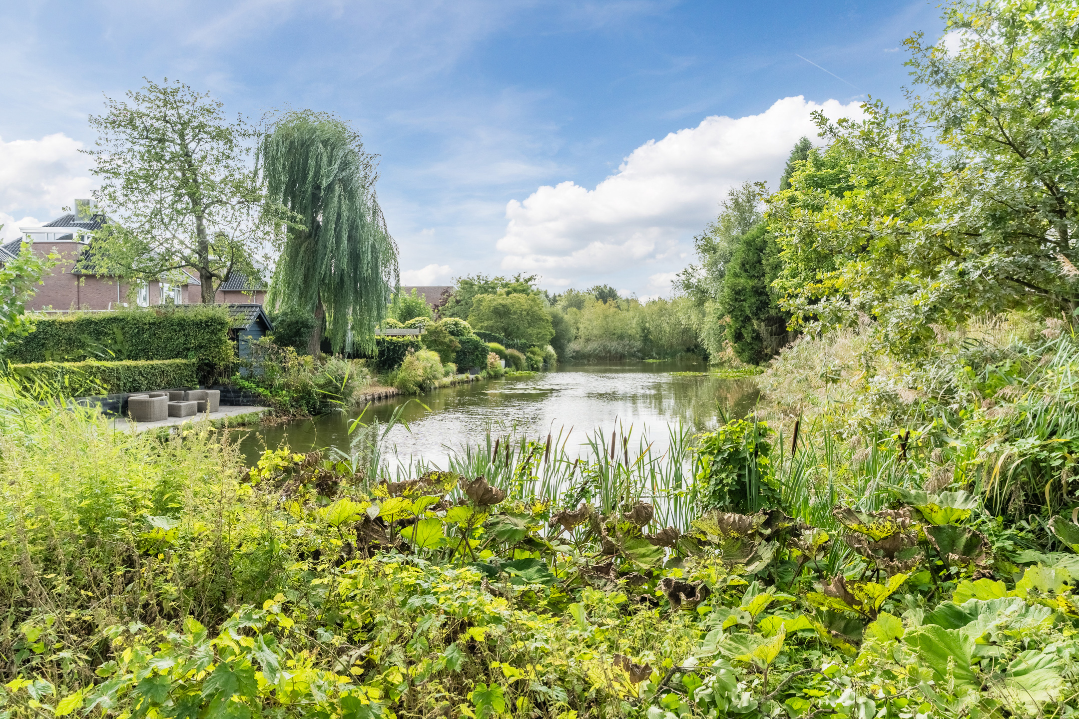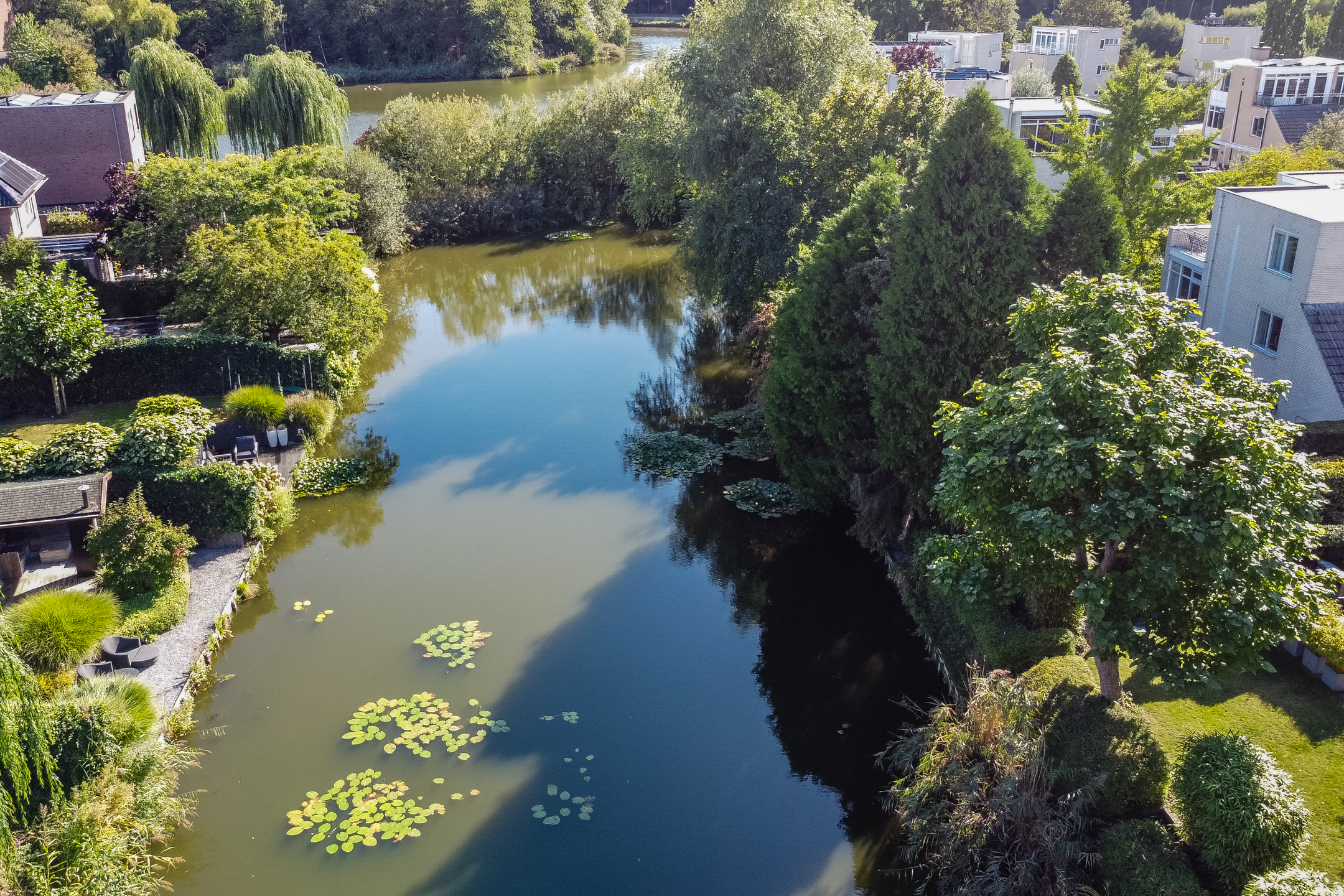 Prachtige aan het water gelegen vrije tuin met enorm veel privacy. In de tuin is op de zuidzijde het verwarmde zwembad gepositioneerd.