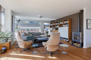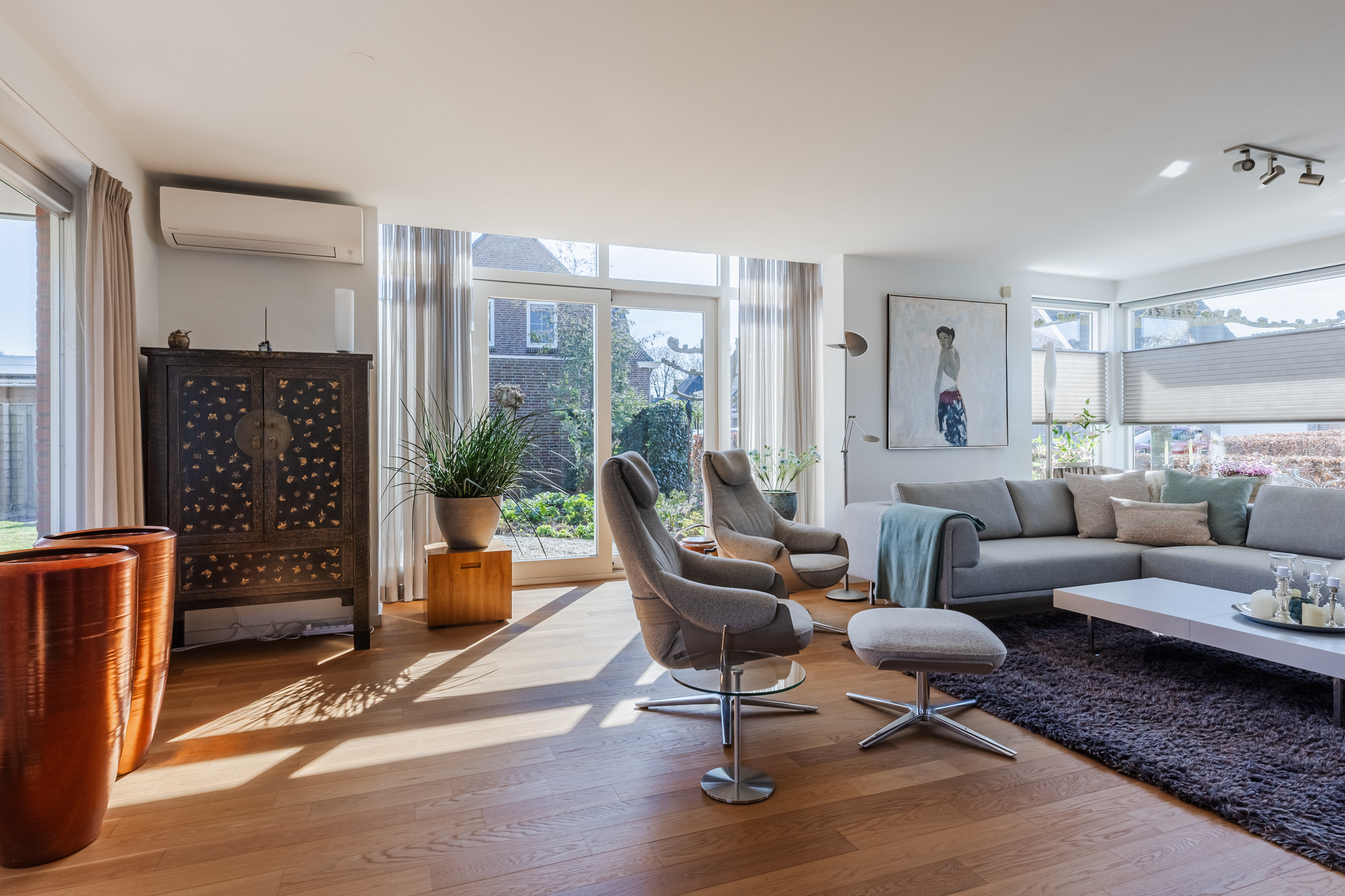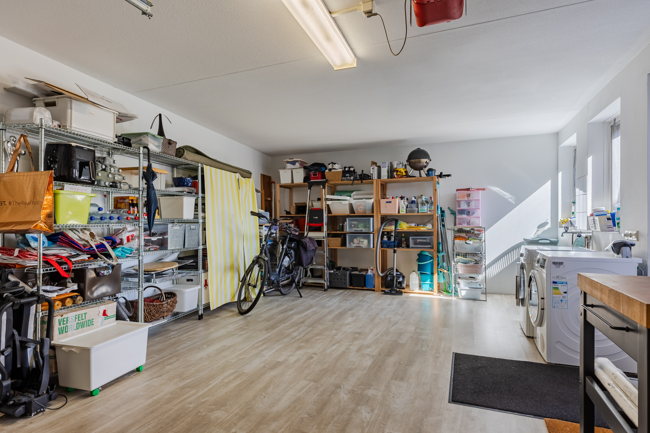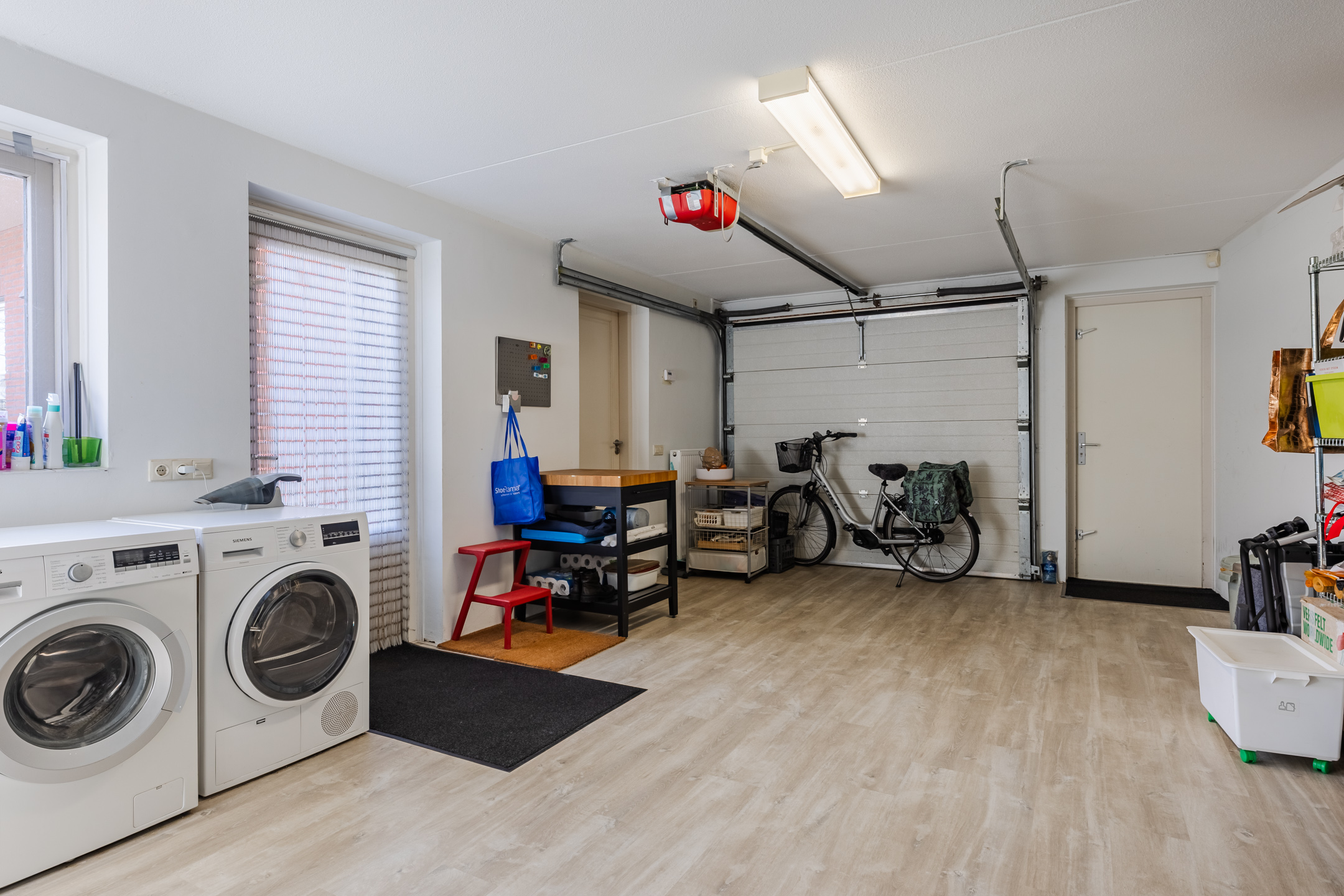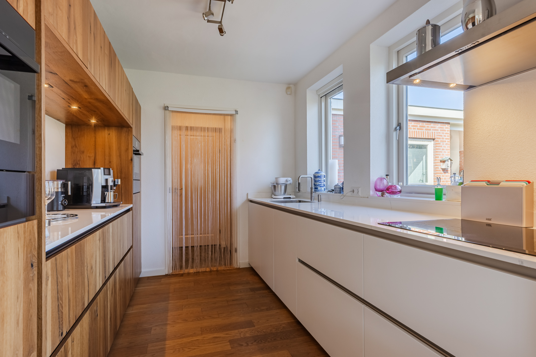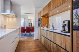 De eerder vermelde hal biedt u toegang tot de riante L-vormige woonkamer die voorzien is van de doorlopende eikenhouten vloer. De woonkamer met een zit- en een eetgedeelte is voorzien van airconditioning. In het zitgedeelte bevindt zich een sfeervolle gesloten houtkachel van Harrie Leenders en een schuifpui met elektrisch zonnescreen die toegang geeft tot de tuin. Het eetgedeelte is voorzien van een loopdeur naar een overdekt terras en geeft toegang tot de keuken. De grote raampartijen tot aan het maaiveld zorgen voor een optimale lichtinval in deze kamer. De complete en luxe Next 125 keuken is in 2021 geïnstalleerd en is voorzien van de volgende inbouwapparatuur: een Siemens inductiekookplaat, afzuigkap en vaatwasmachine en een Miele koelkast, combi-oven/magnetron en een combi-stoomoven met vacumeerlade, een warmhoudlade en een Quooker kraan. Vanuit de keuken komt u in een tussenportaal/bijkeuken met aan weerszijden vaste kastruimte en de omvormer ten behoeve van de zonnepanelen. Vervolgens komt u in de inpandige, geïsoleerde garage van ca. 32m² voorzien van een op afstand bedienbare sectionaal garagedeur, loopdeur naar de oprit en een loopdeur naar de achtertuin. De garage is voorzien van grote ramen aan de tuinzijde en er zijn aansluitpunten ten behoeve van de wasapparatuur.
