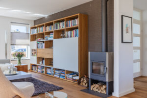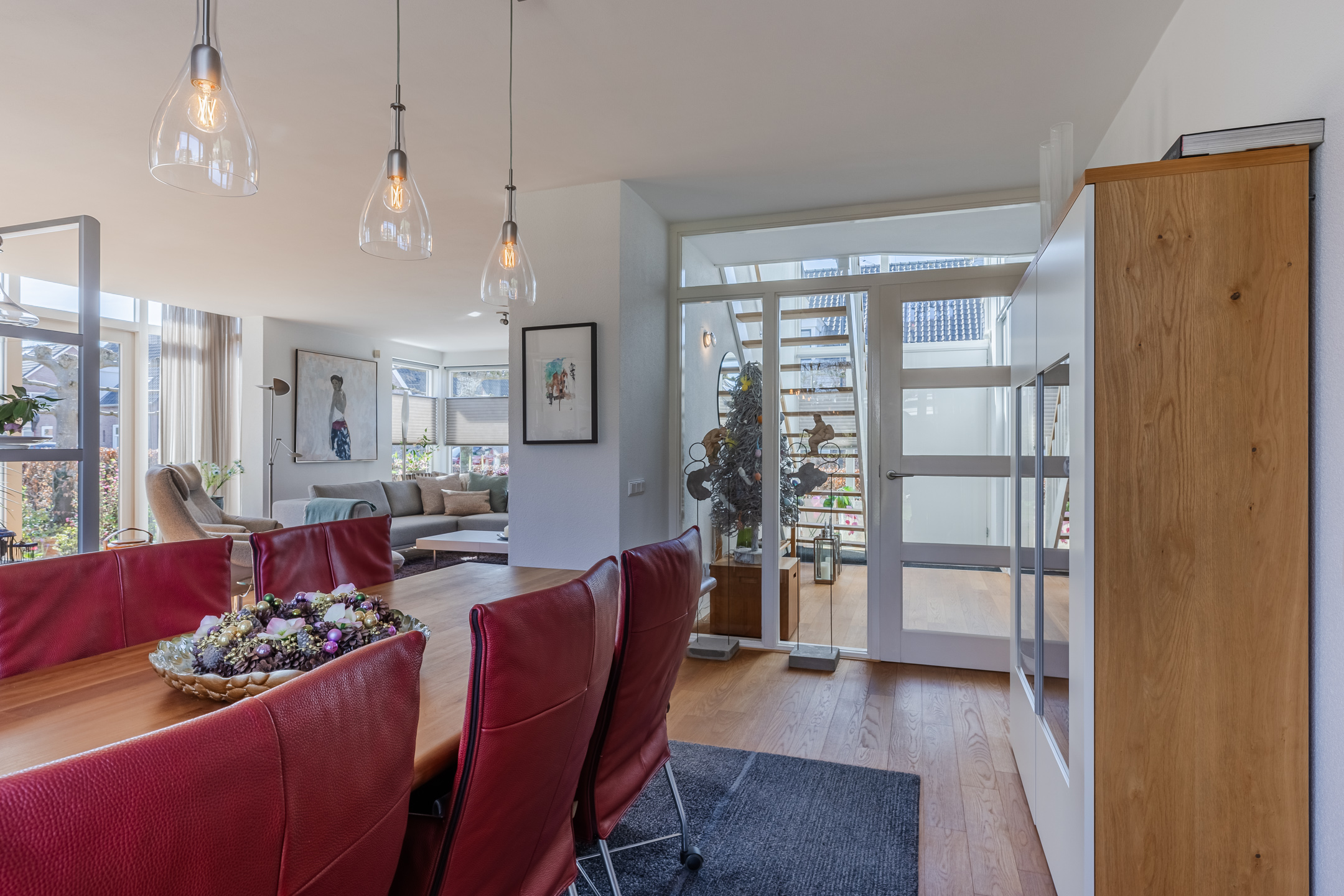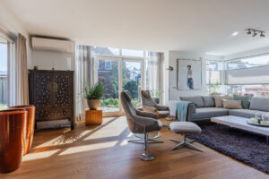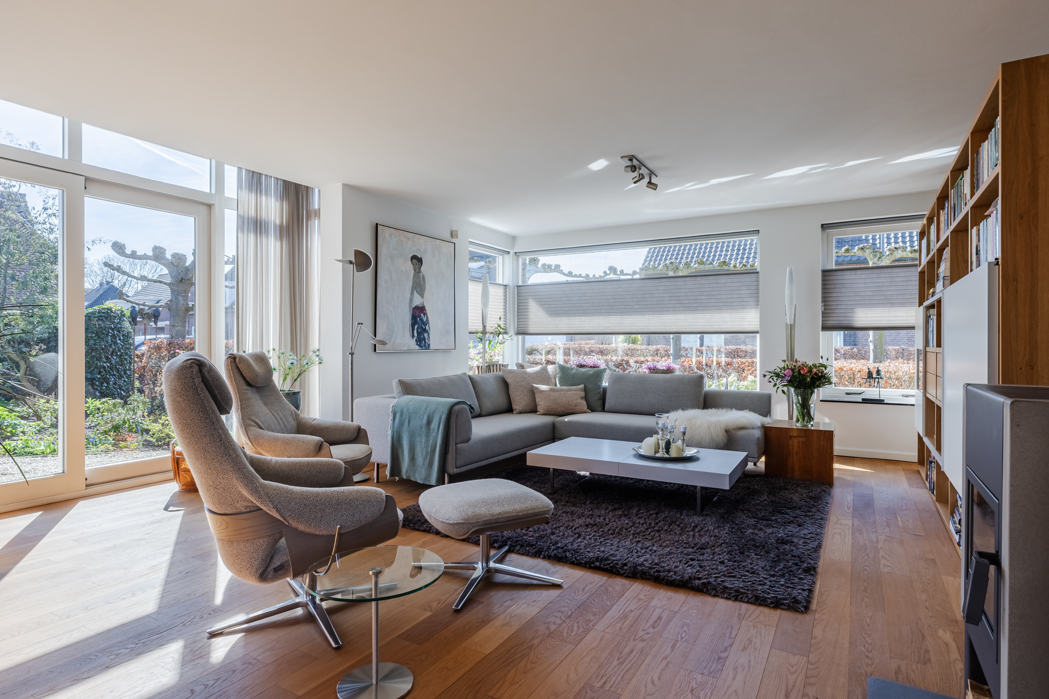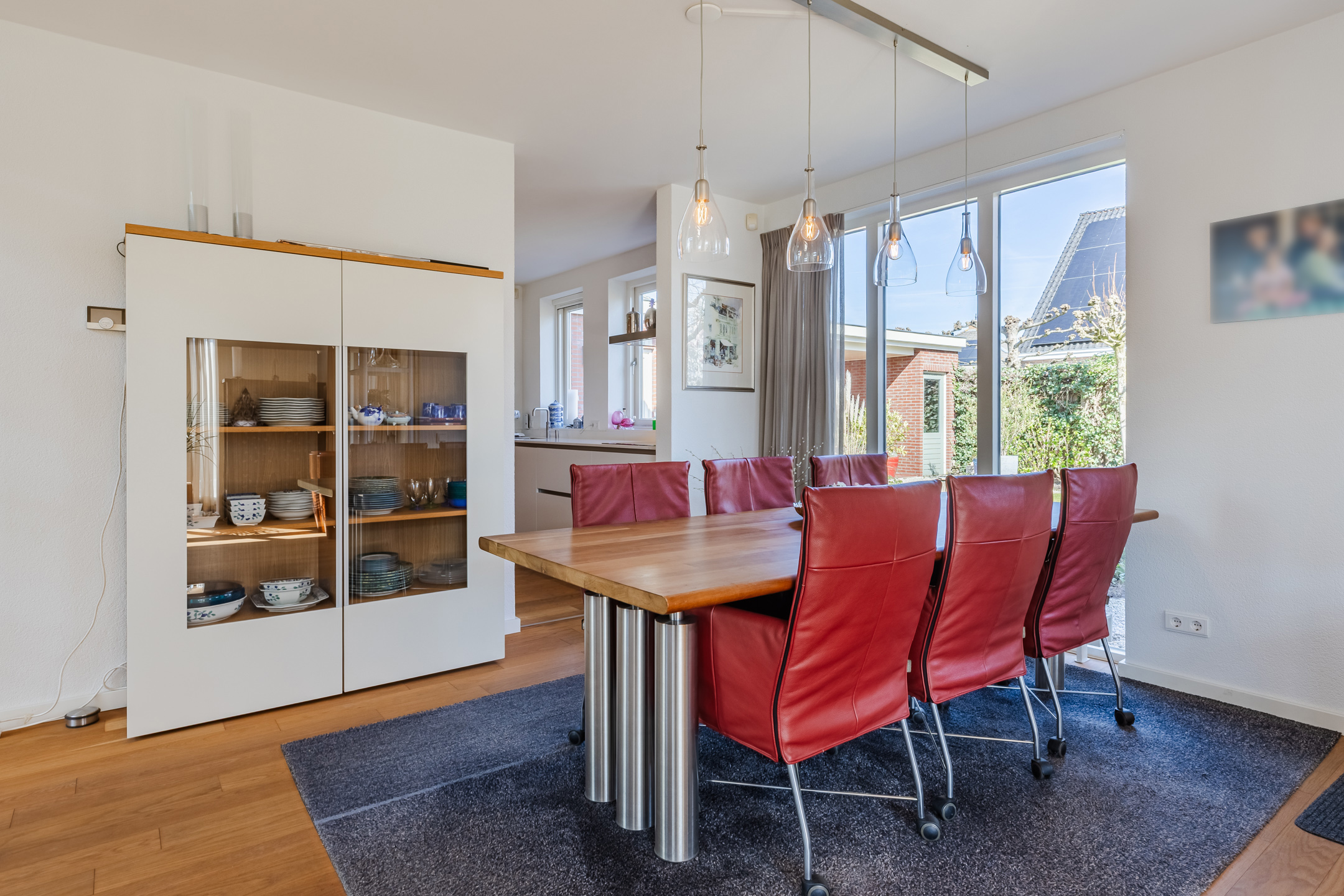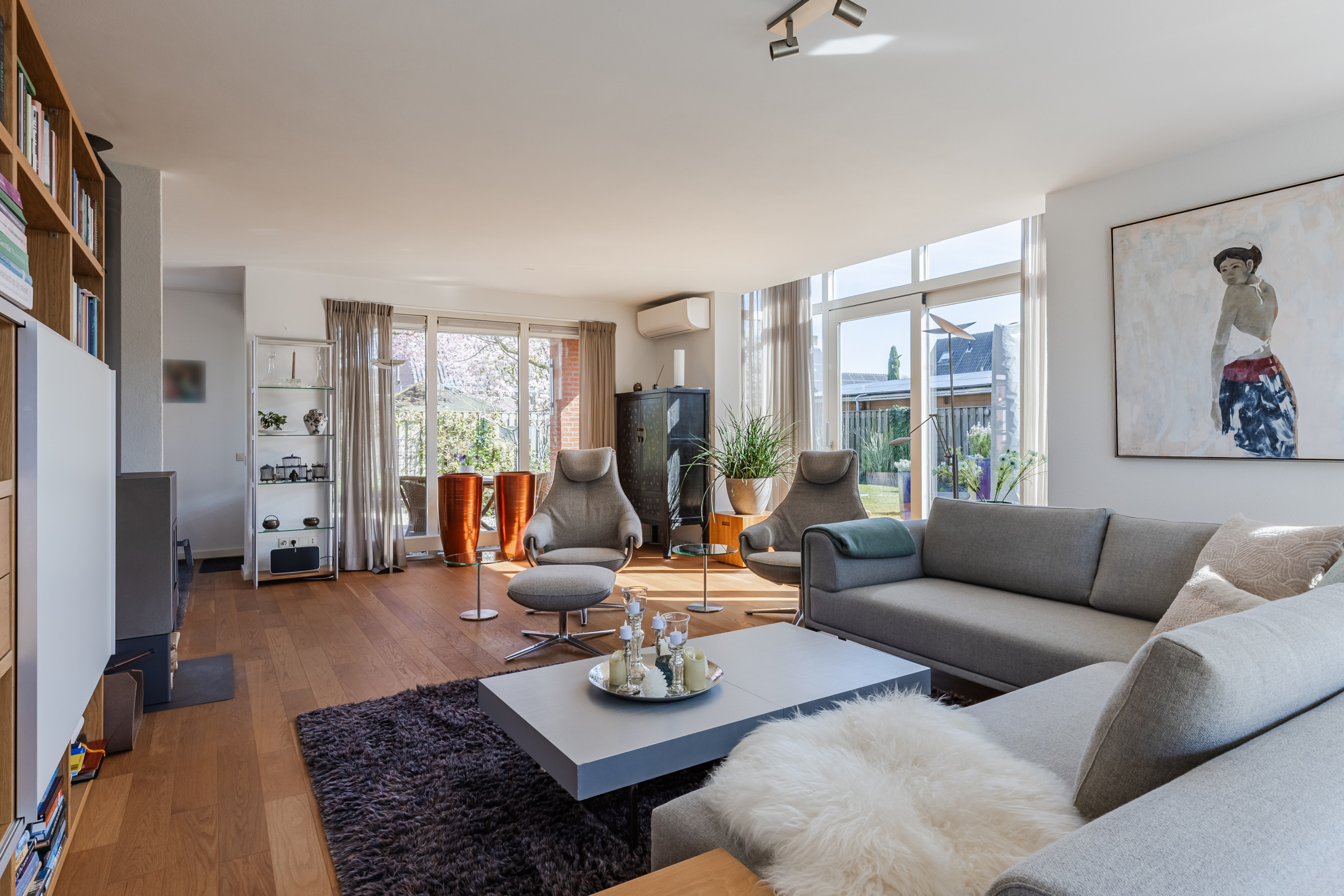 De eerder vermelde hal biedt u toegang tot de riante L-vormige woonkamer die voorzien is van de doorlopende eikenhouten vloer. De woonkamer met een zit- en een eetgedeelte is voorzien van airconditioning. In het zitgedeelte bevindt zich een sfeervolle gesloten houtkachel van Harrie Leenders en een schuifpui met elektrisch zonnescreen die toegang geeft tot de tuin. Het eetgedeelte is voorzien van een loopdeur naar een overdekt terras en geeft toegang tot de keuken. De grote raampartijen tot aan het maaiveld zorgen voor een optimale lichtinval in deze kamer. De complete en luxe Next 125 keuken is in 2021 geïnstalleerd en is voorzien van de volgende inbouwapparatuur: een Siemens inductiekookplaat, afzuigkap en vaatwasmachine en een Miele koelkast, combi-oven/magnetron en een combi-stoomoven met vacumeerlade, een warmhoudlade en een Quooker kraan. Vanuit de keuken komt u in een tussenportaal/bijkeuken met aan weerszijden vaste kastruimte en de omvormer ten behoeve van de zonnepanelen. Vervolgens komt u in de inpandige, geïsoleerde garage van ca. 32m² voorzien van een op afstand bedienbare sectionaal garagedeur, loopdeur naar de oprit en een loopdeur naar de achtertuin. De garage is voorzien van grote ramen aan de tuinzijde en er zijn aansluitpunten ten behoeve van de wasapparatuur.