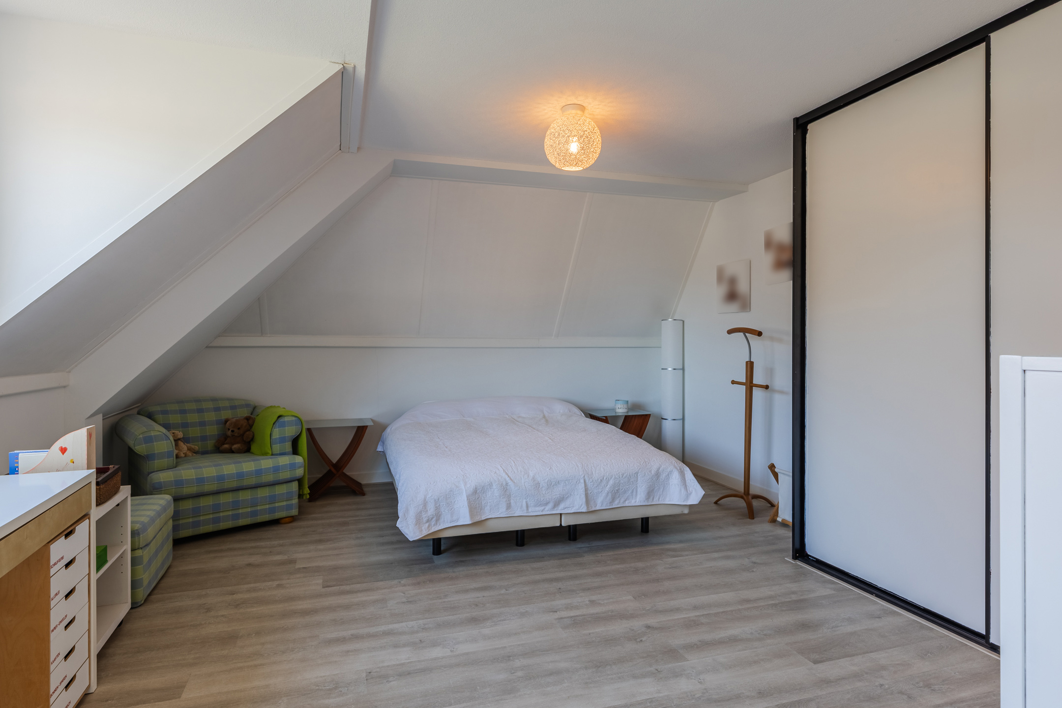 - Slaapkamer 3 van ca. 20m², gesitueerd aan de achterzijde van de woning, voorzien van een dakkapel en een vaste kast.