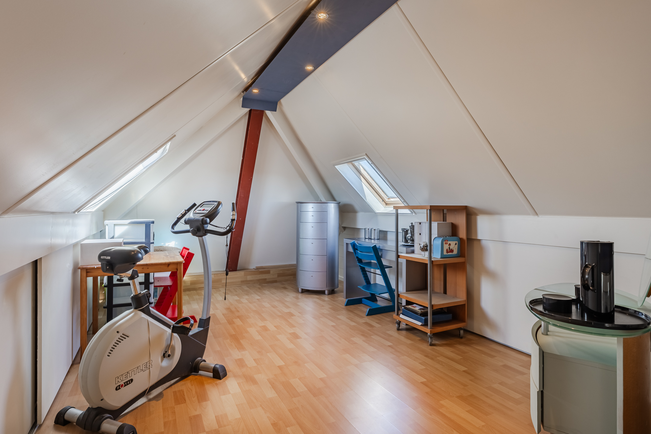 Middels een vaste trap is (zolder)kamer 6 van ca. 13m² bereikbaar, voorzien van twee Velux dakramen met zonwering aan weerszijden, alsmede schuifwanden met bergruimte aan beide zijden, waarvan 1 met opstelling van de mechanische afzuigunit. De kamer is voorzien van een laminaatvloer en diverse inbouwspots. Tevens heeft u toegang tot een berging met de opstelplaats van de HR CV-combiketel (Remeha, bwj. 2016).