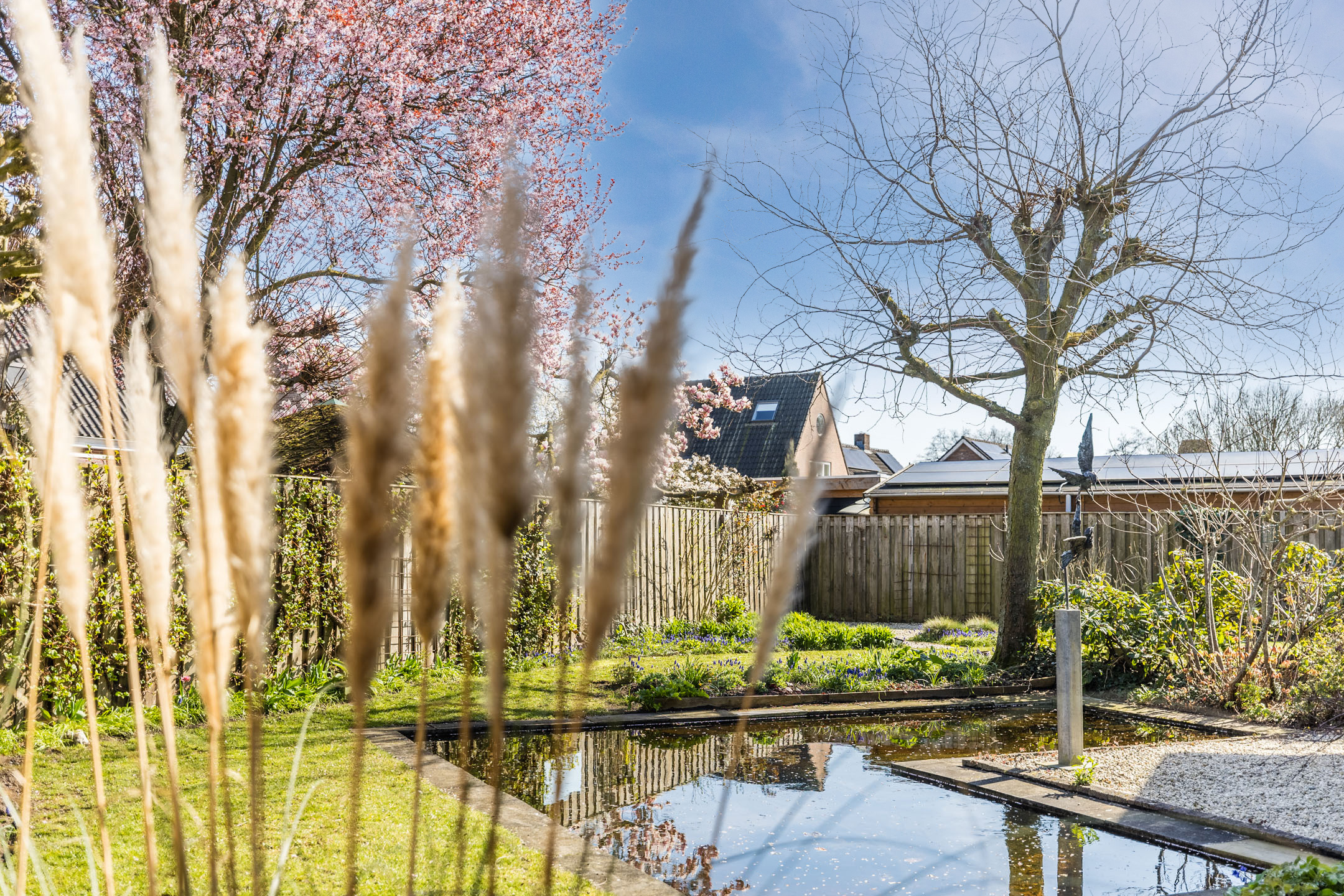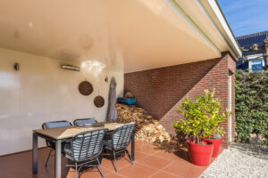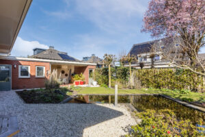 Werkelijk schitterend aangelegde voor-, achter- en zijtuin voorzien van diverse terrassen, volwassen beplanting, speels vormgegeven vijverpartij die recent voorzien is van een nieuwe pompinstallatie, grasgazon en achter de garage is een sfeervolle, beschutte overkapping gecreëerd van hoogwaardige kwaliteit met verlichting en verwarming. Achter de overkapping is een gang met toegang naar een achtergelegen praktische berging van ca. 9m² ten behoeve van bijvoorbeeld tuingereedschap, welke voorzien is van elektra.