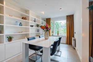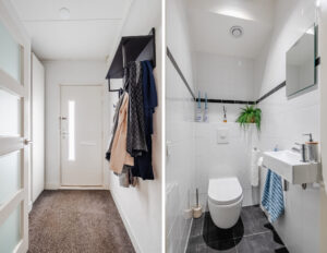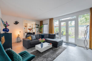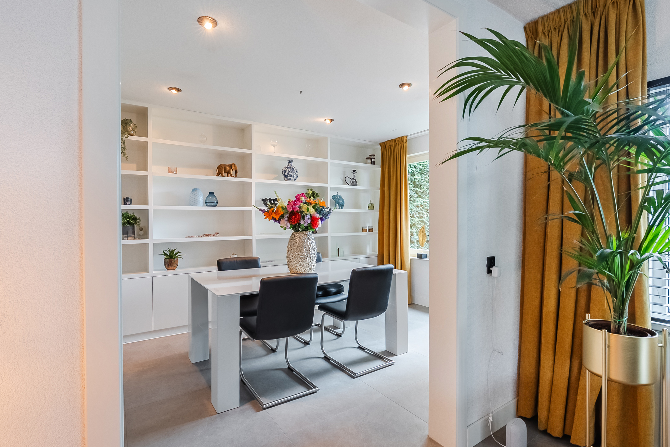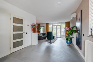 Entree/hal met toegang tot de vernieuwde meterkast, de volledig betegelde toiletruimte met vrijhangend closet en fonteintje en de trapopgang naar de eerste verdieping. Vanuit de hal komt u in de ruime living welke is voorzien van een fraaie tegelvloer, dubbele openslaande deuren naar de achtertuin, airconditioning (voor warme en koude lucht) en een sfeervolle eetkamer welke toegang geeft tot de inpandig bereikbare garage. Indien gewenst is het mogelijk om de eetkamer en garage om te bouwen tot een slaap- en badkamer. U kunt er ook voor kiezen om alleen de eetkamer te veranderen in een speel-/werkkamer.