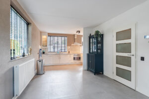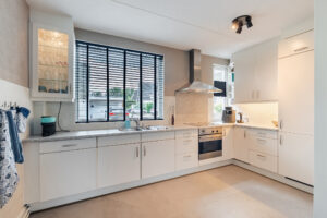 De keuken is aan de voorzijde van de woning gelegen en geplaatst in een hoekopstelling. Aan apparatuur is er een kookplaat, afzuigkap (uit 2022), oven, koel-vriescombinatie (uit 2025) en een vaatwasser (uit 2018) aanwezig. Het geheel is uitgevoerd in een neutrale kleurstelling. Boven het werkblad is een groot raam aanwezig waardoor de ruimte heerlijk licht is en u een prachtig zicht heeft op de voortuin/straatzijde.