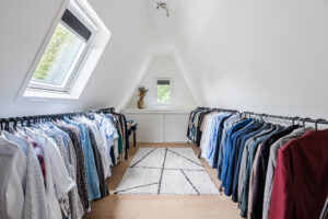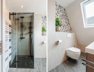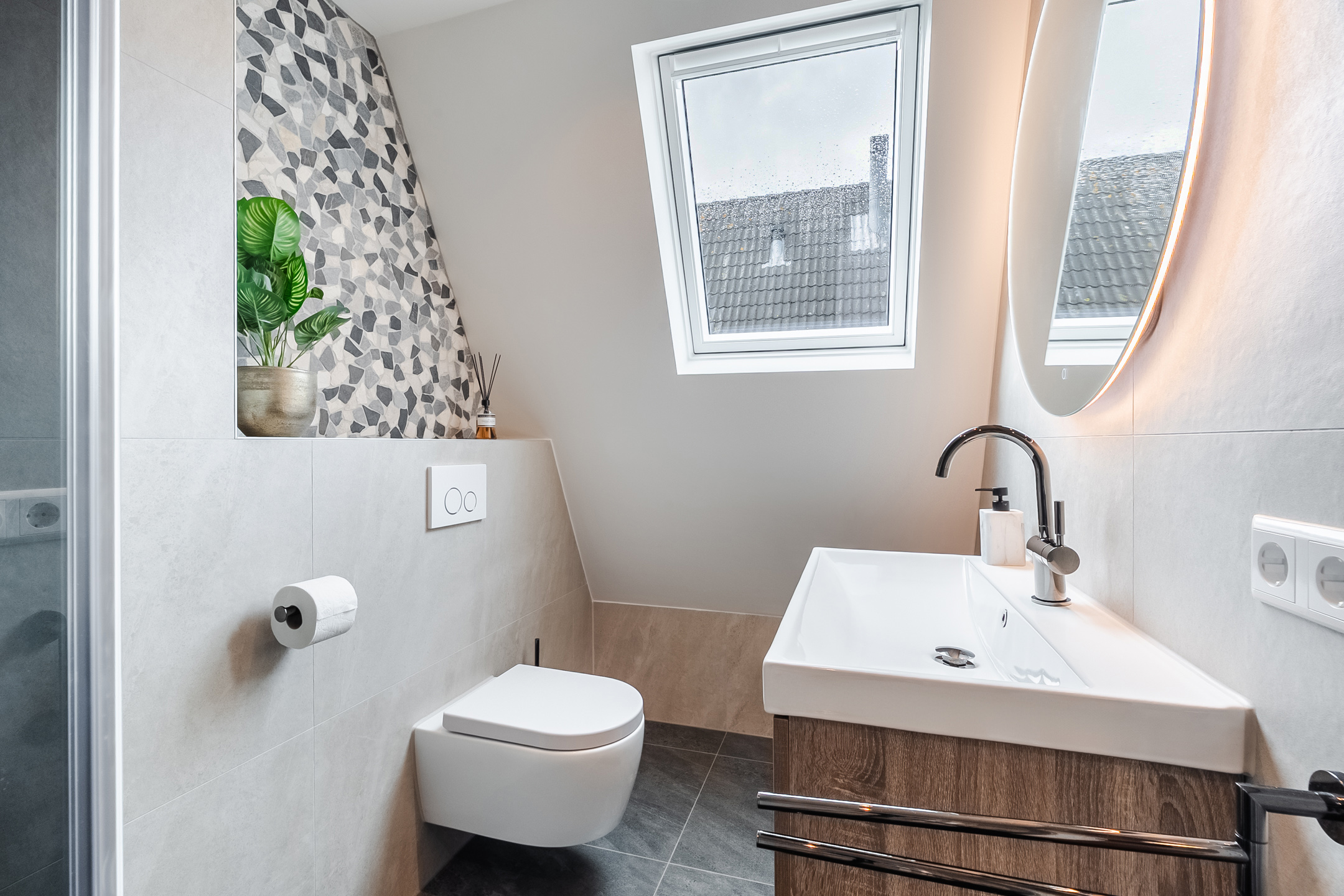 De luxe, volledig betegelde badkamer is vernieuwd in 2025 en beschikt over een douche, tweede vrijhangend closet en een wastafelmeubel. Het dakraam zorgt voor daglicht en natuurlijke ventilatie.