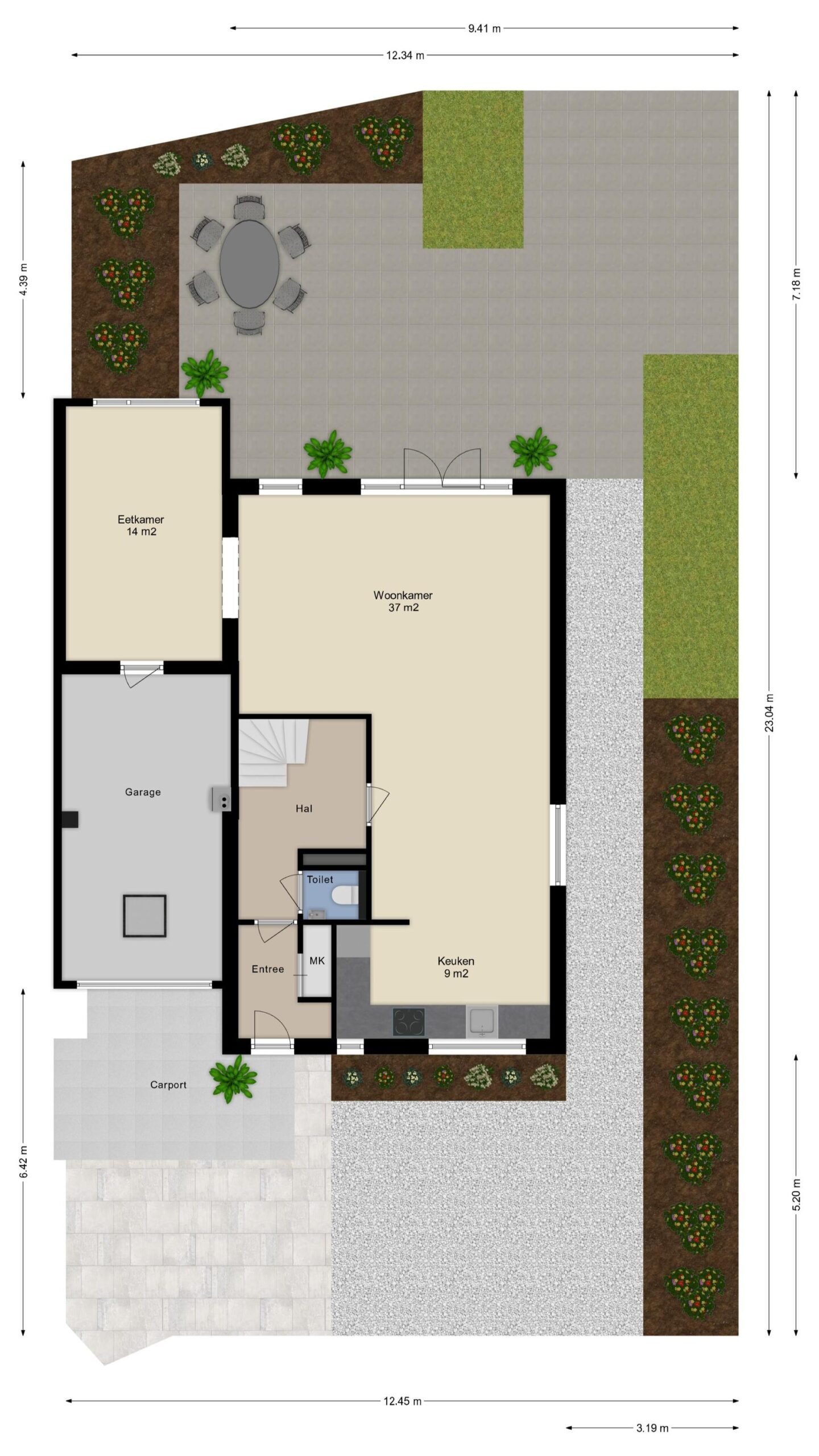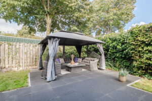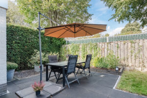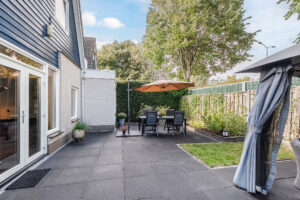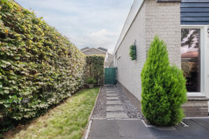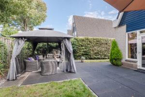 Zowel aan de voor-, zij- en achterkant van de woning is een fraai aangelegde tuin aanwezig. De voortuin bestaat uit een aangelegde border direct voor de woning met groene beplanting. Daarnaast ligt een oprit die u toegang verschaft tot de voordeur en de garage. Tevens loopt vanaf hier een pad langs de woning richting de achtertuin. De garage van ca. 16m² is toegankelijk vanaf de oprit middels een sectionaal garagedeur en via de eetkamer. In de garage is elektra aanwezig. De privacy biedende achtertuin is volledig omsloten en is net als de voortuin fraai aangelegd met tegels, gazon en diverse planten. U kunt hier het gehele voorjaar en de zomer genieten van de zon.