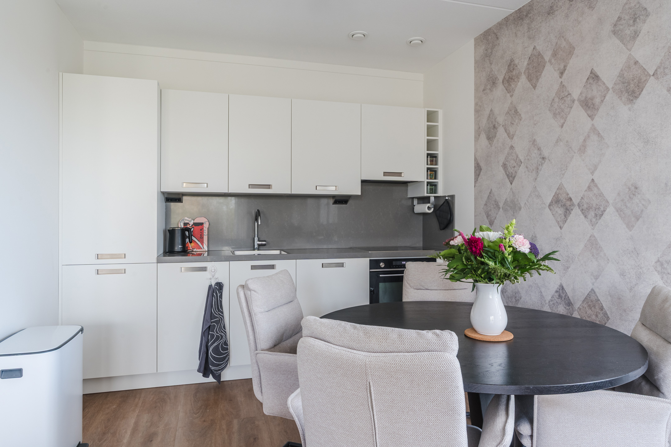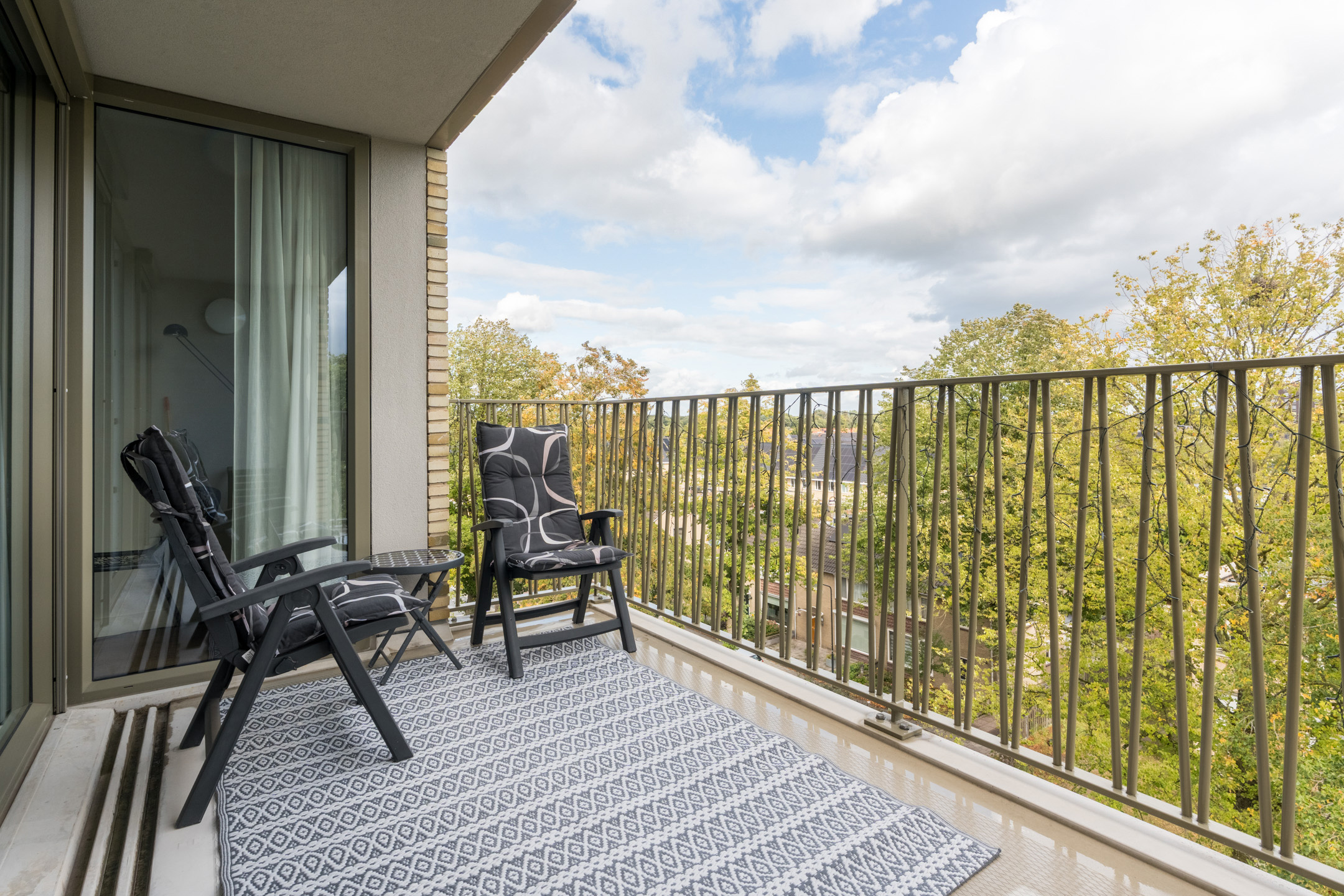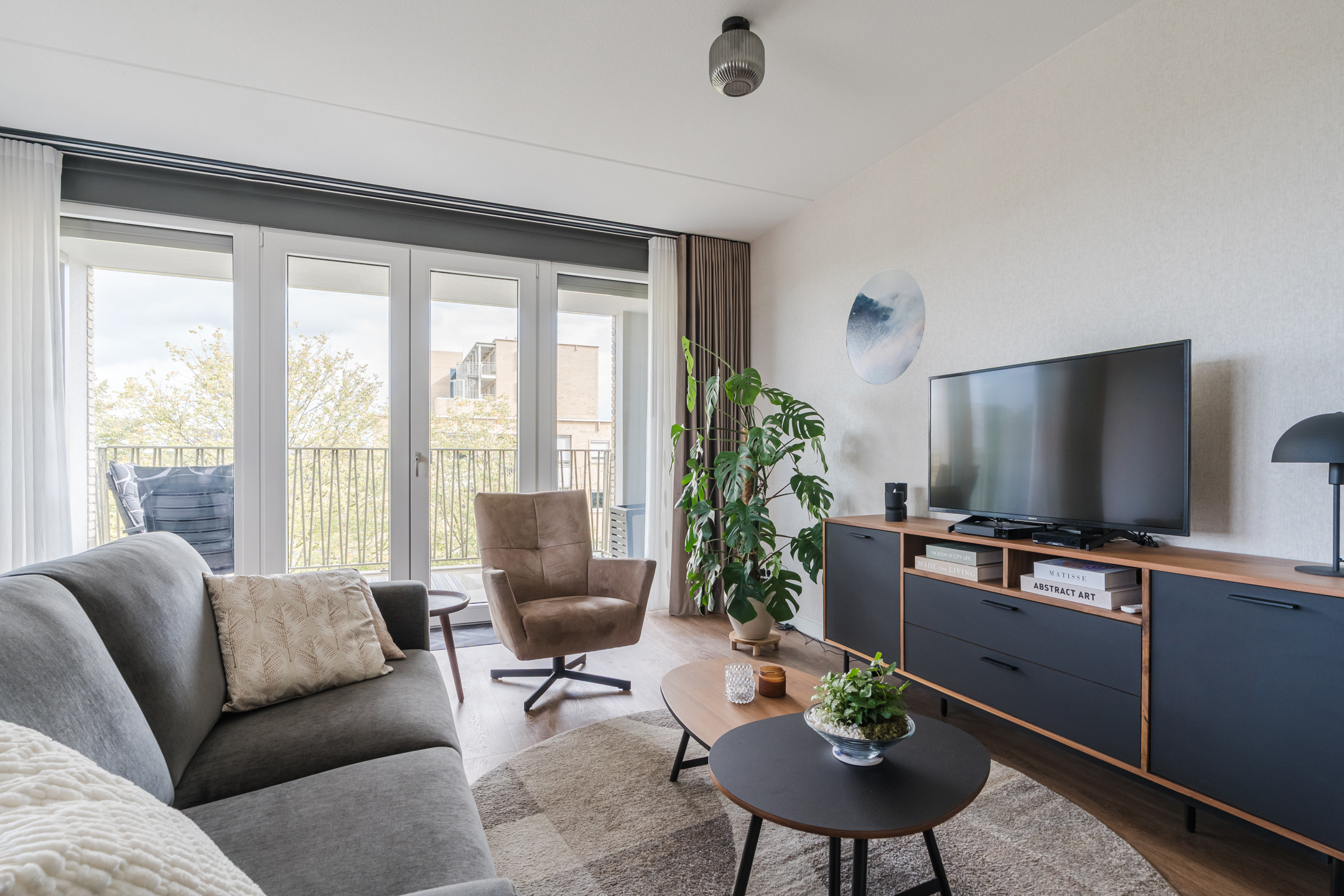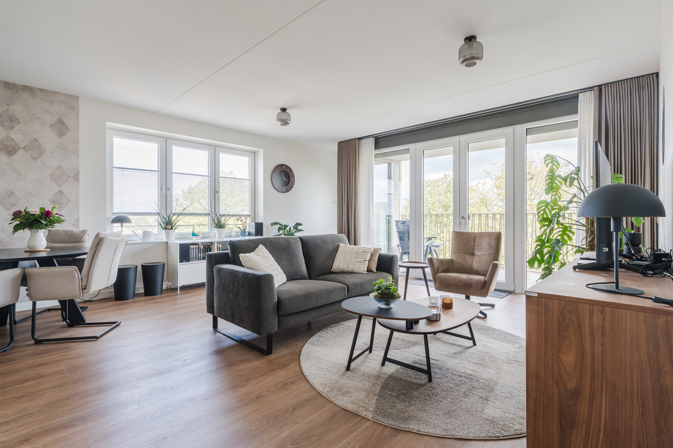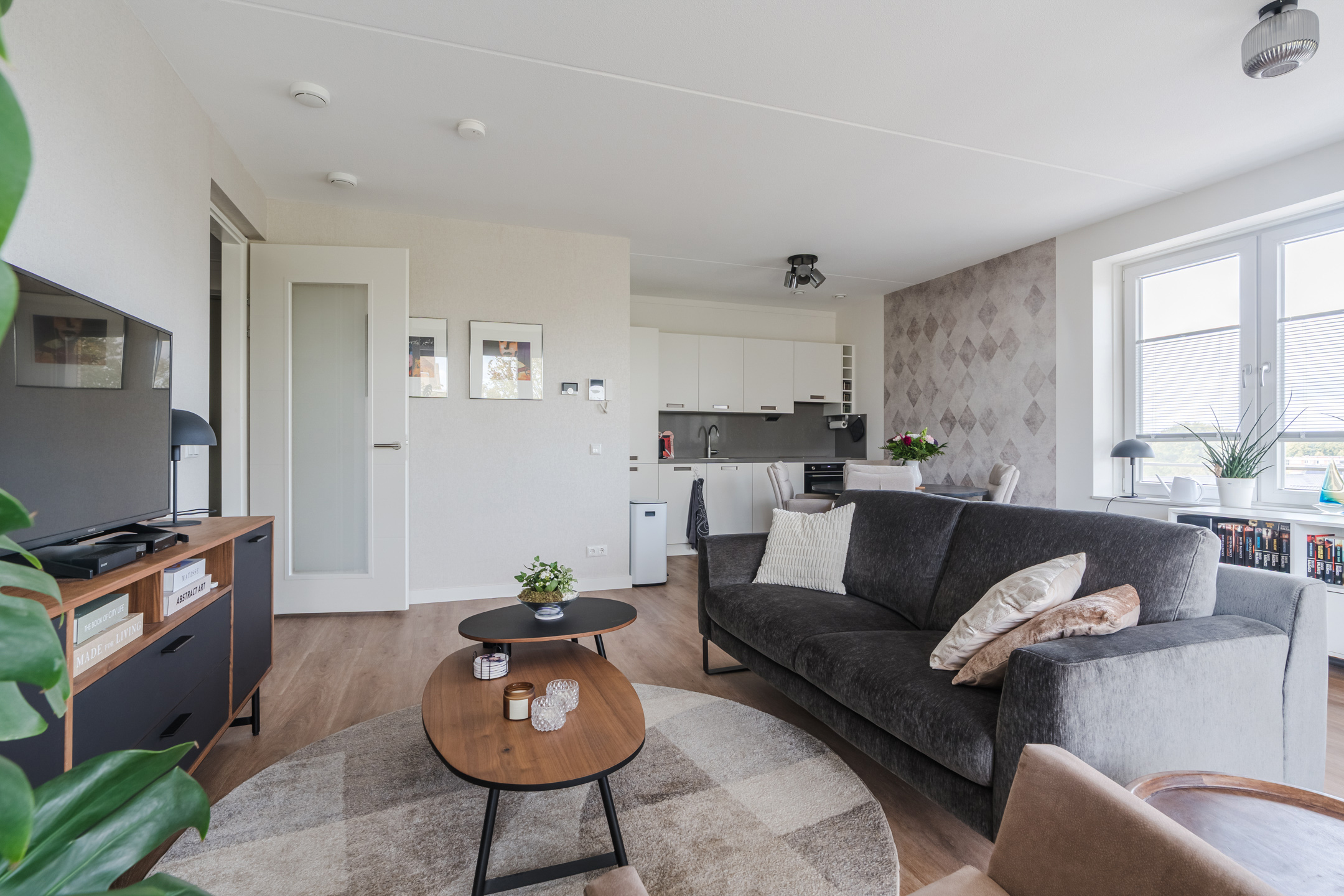 Ruime en lichte living van ca. 36m² met dubbele naar binnen openslaande deuren naar het ruime en zonnige op het zuid-oosten gesitueerde balkon, elektrische screens en een in lichte kleurstelling ingerichte keuken met diverse kastruimte en de navolgende inbouwapparatuur, te weten: een inductiekookplaat, afzuigkap, combi-oven/magnetron en een koel/vriescombinatie.