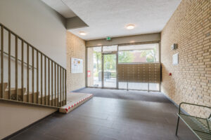 Entree/hal met video/bellentableau. Vanuit de hal is de lift te bereiken en het trappenhuis met toegang naar de parkeerplaatsen, bergingen en de appartementen.