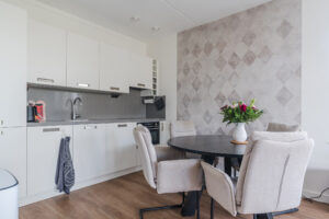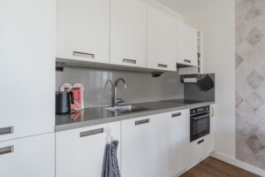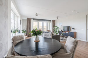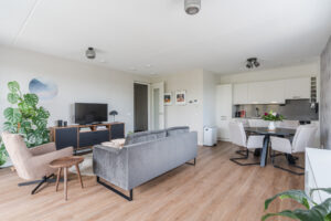 Ruime en lichte living van ca. 36m² met dubbele naar binnen openslaande deuren naar het ruime en zonnige op het zuid-oosten gesitueerde balkon, elektrische screens en een in lichte kleurstelling ingerichte keuken met diverse kastruimte en de navolgende inbouwapparatuur, te weten: een inductiekookplaat, afzuigkap, combi-oven/magnetron en een koel/vriescombinatie.
