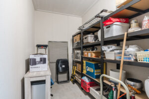Praktische berging/technische ruimte met de aansluitingen voor de wasapparatuur, de WTW (ventilatie)-unit en het warmtepompsysteem.
