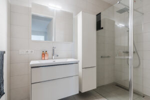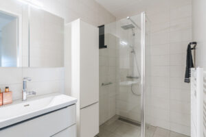 Een compleet licht betegelde toiletruimte met een vrij-hangend closet en fonteintje en een eveneens compleet licht betegelde, badkamer met een fraaie inloopdouche, wastafel in een wandmeubel, een handige badkamerkast en een designradiator.