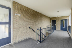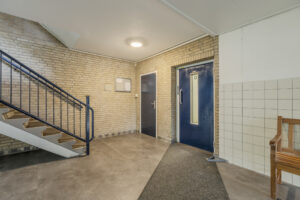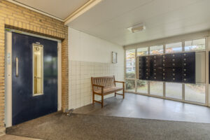 Centrale ruime en afgesloten ontvangsthal met brievenbussen en toegang tot de lift en het trappenhuis.