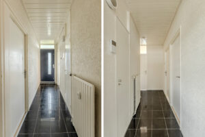 Ruime entree/hal voorzien van een tegelvloer, meterkast en toegang tot de keuken, badkamer, de slaapkamers, de woonkamer en het toilet met vrij hangend closet met fonteintje.