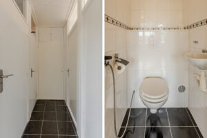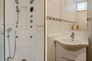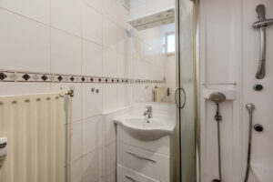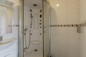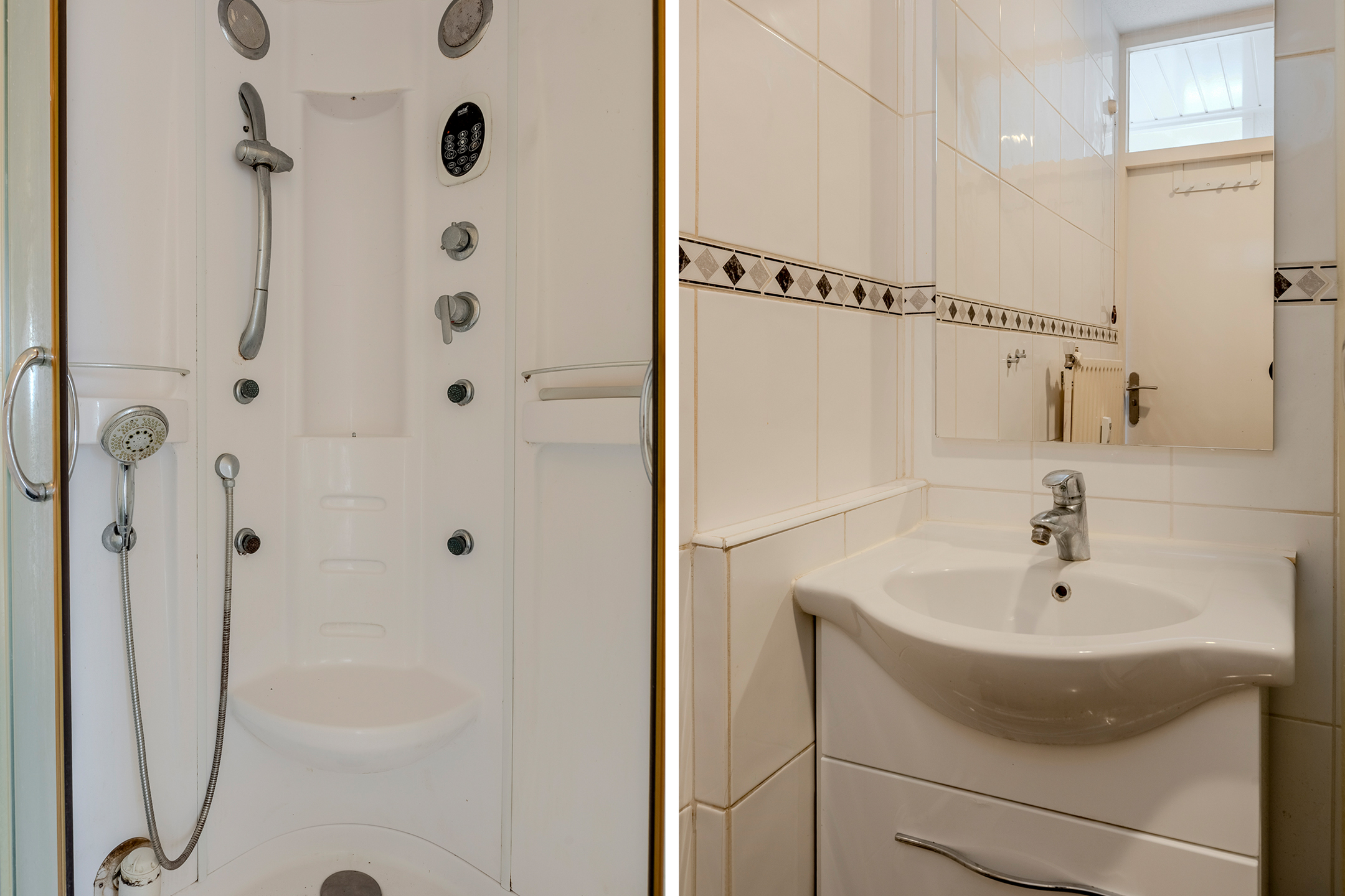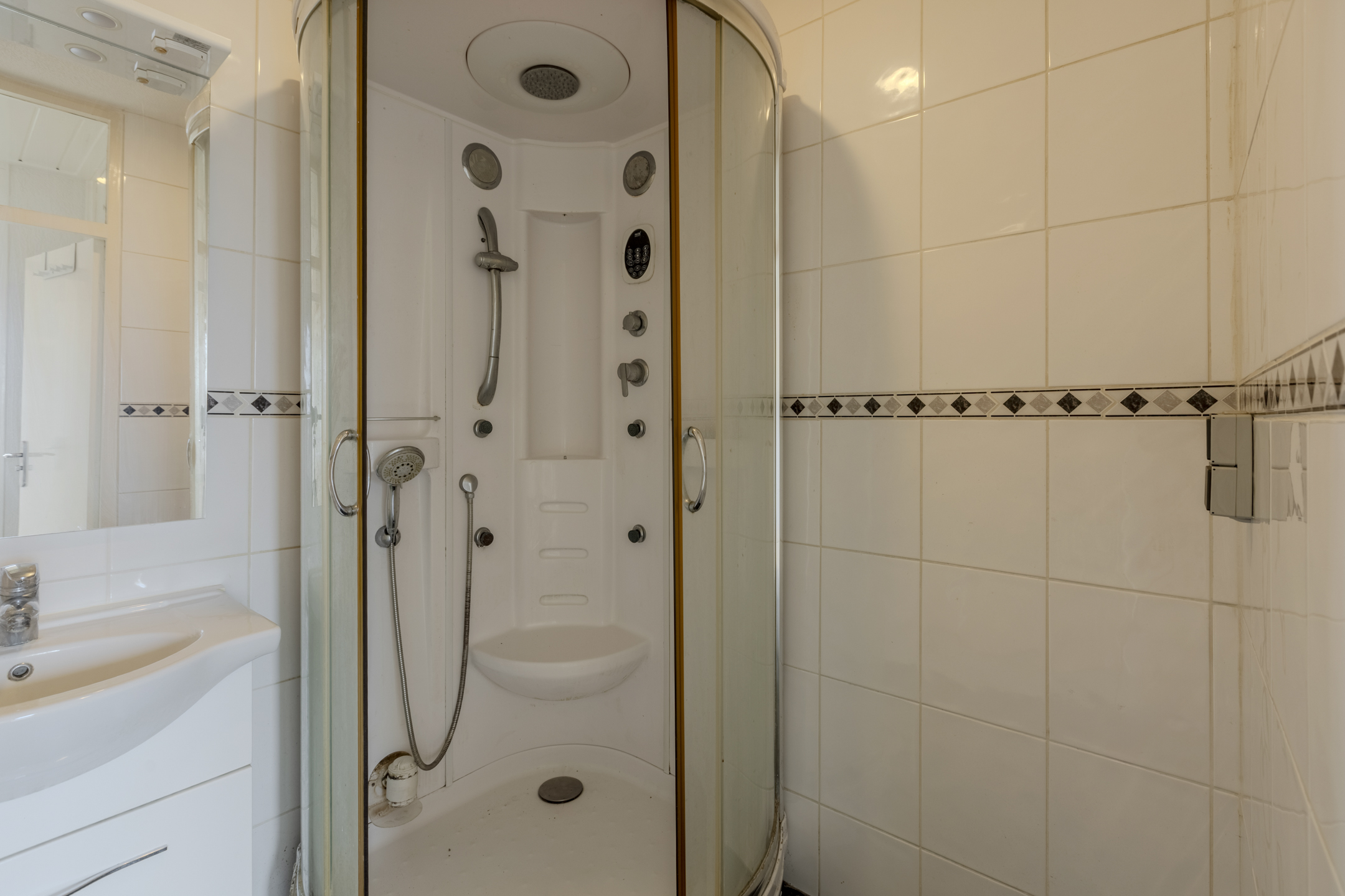 Volledig betegelde badkamer voorzien van een halfronde douchecabine, een vaste wastafel en aansluitingen ten behoeve van de wasapparatuur.