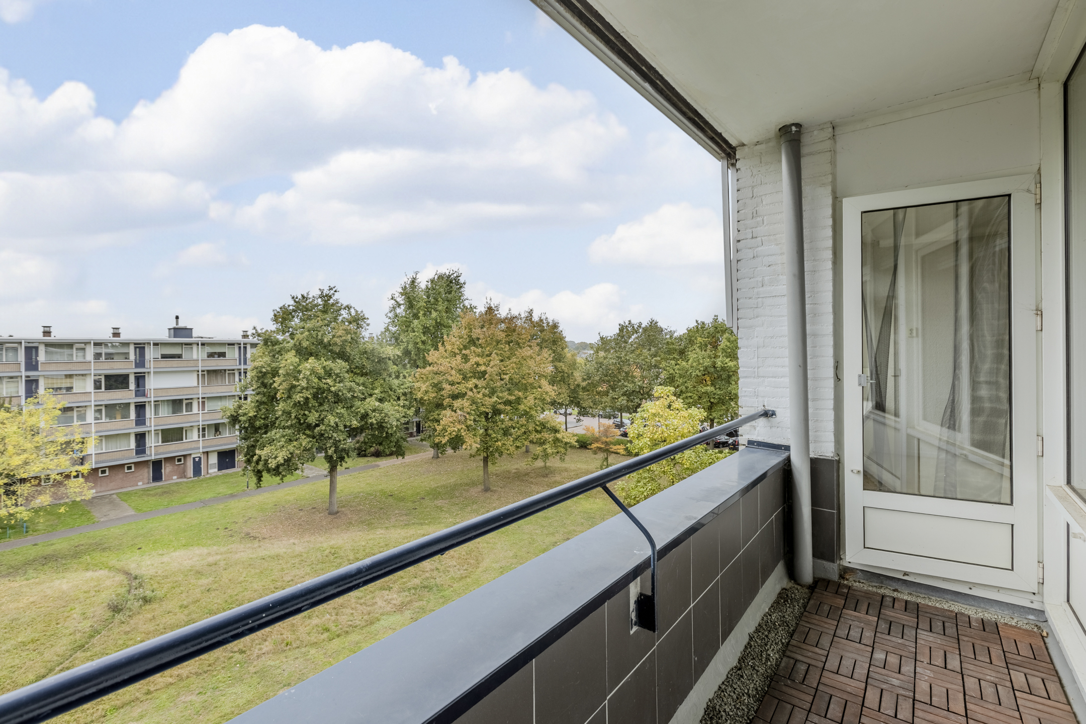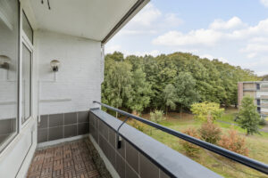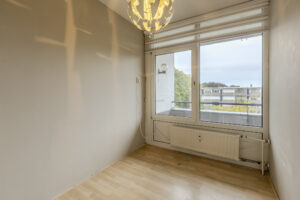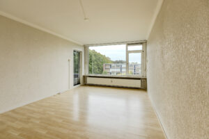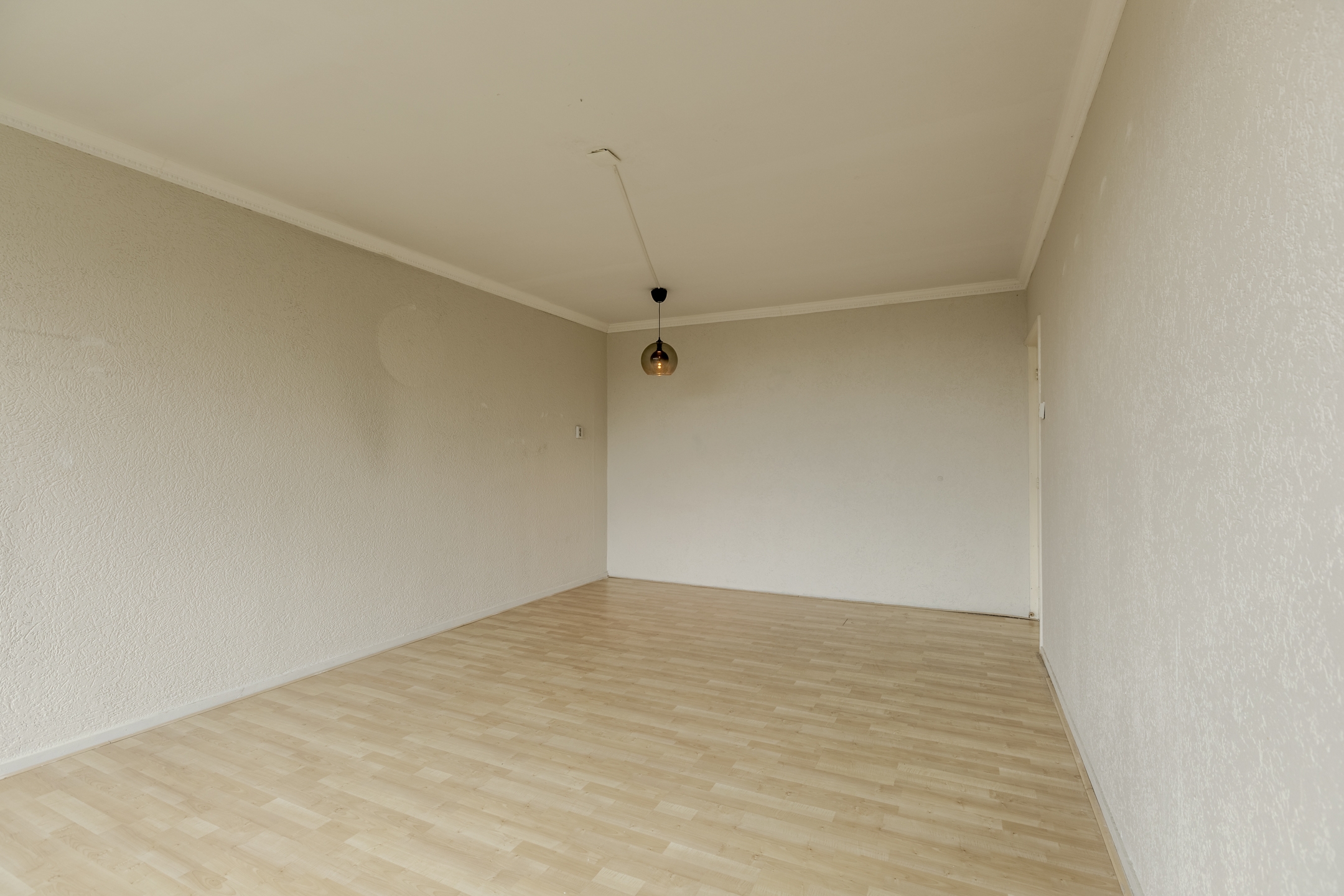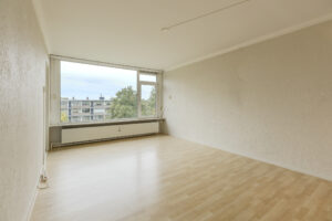 Vanuit de hal komt men in de lichte woonkamer (ca. 23 m²) met loopdeur naar het balkon. De kamer is voorzien van een laminaatvloer en kunststof kozijnen met draai-kiepraam en isolerende beglazing. Het balkon is geheel betegeld.
