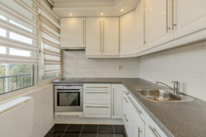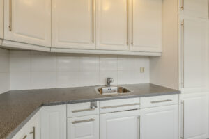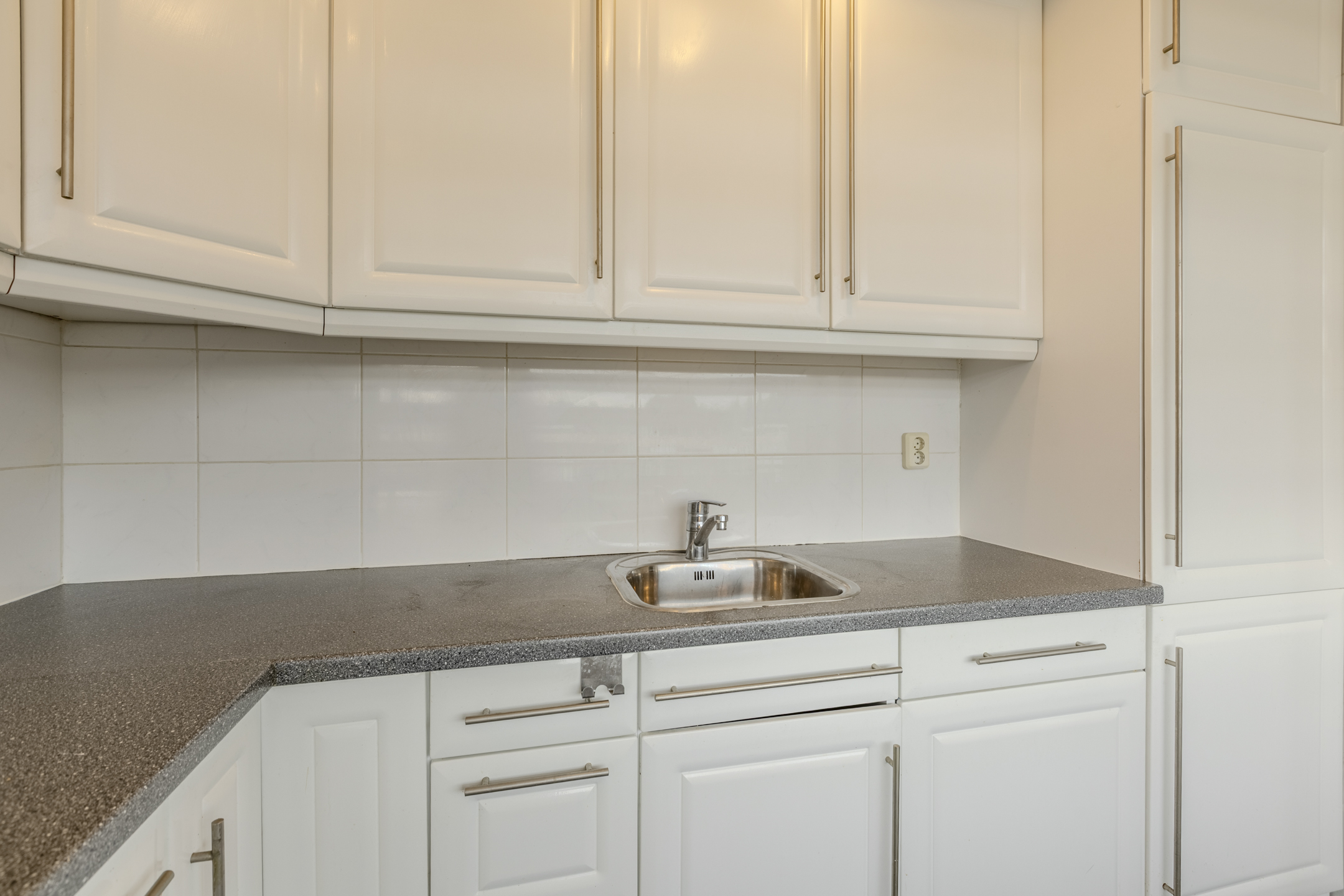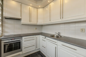 Dichte keuken gelegen aan de voorzijde (galerijzijde) van het appartement voorzien van lichte keukeninrichting met onder- en bovenkasten, keramische kookplaat, oven, afzuigkap, koel/vriescombinatie en een vaatwasmachine.