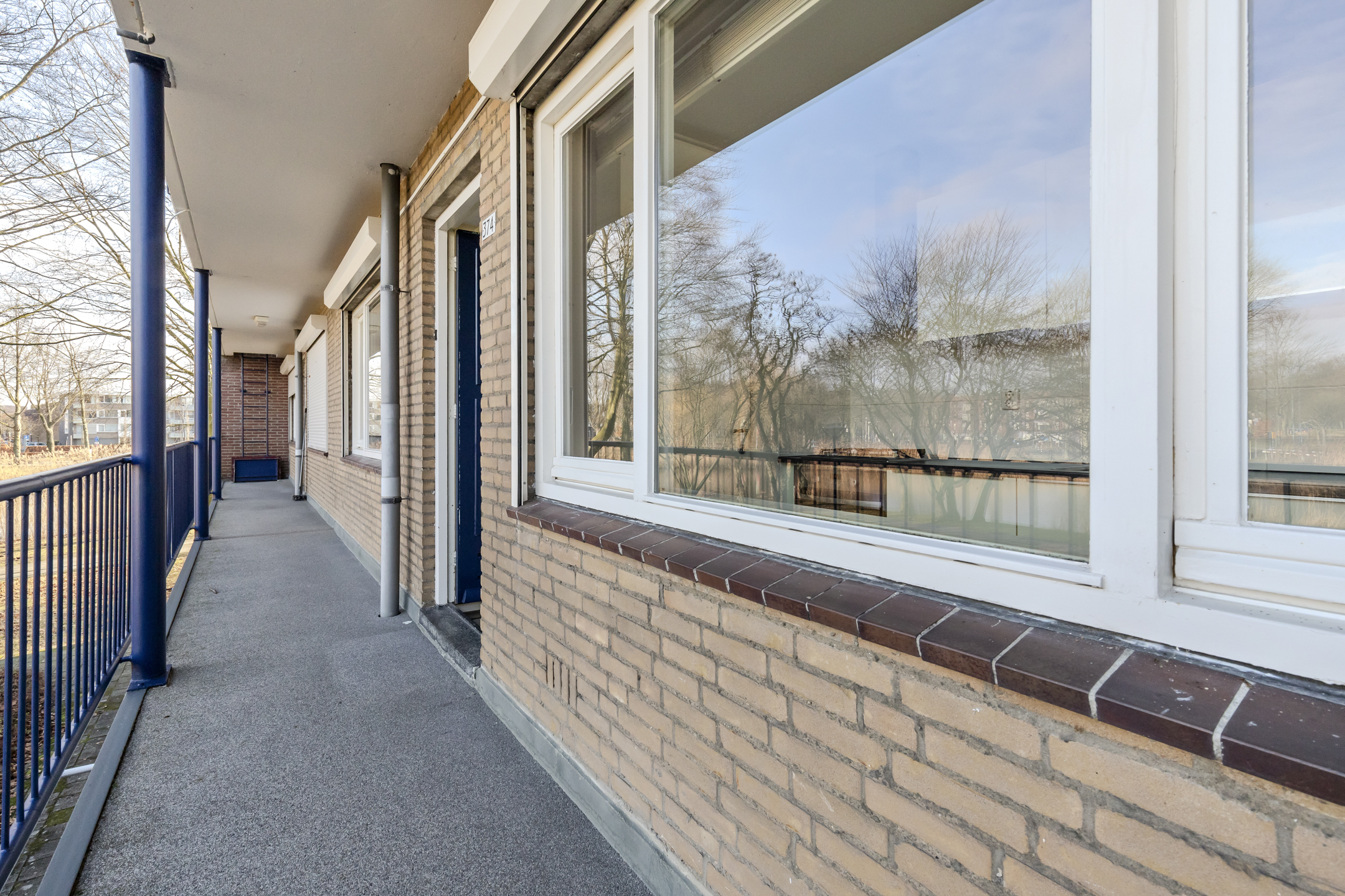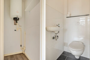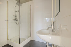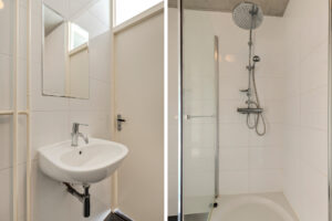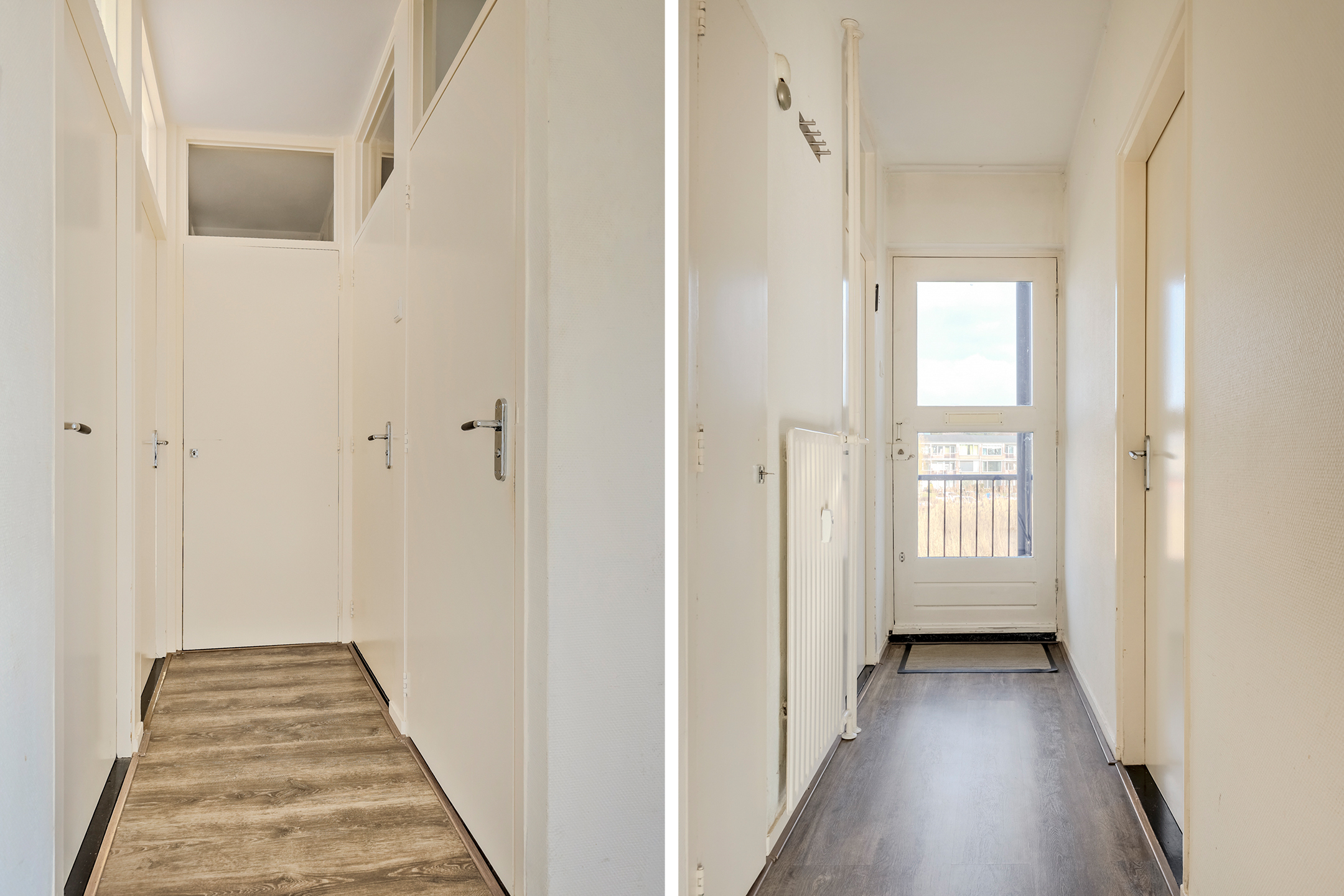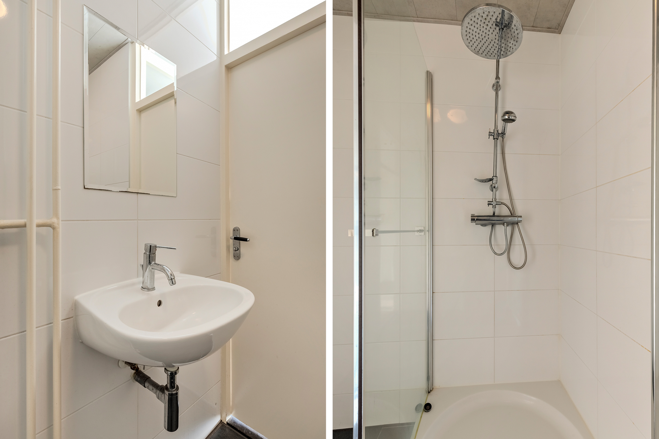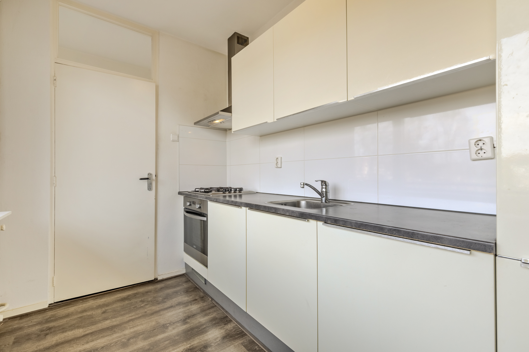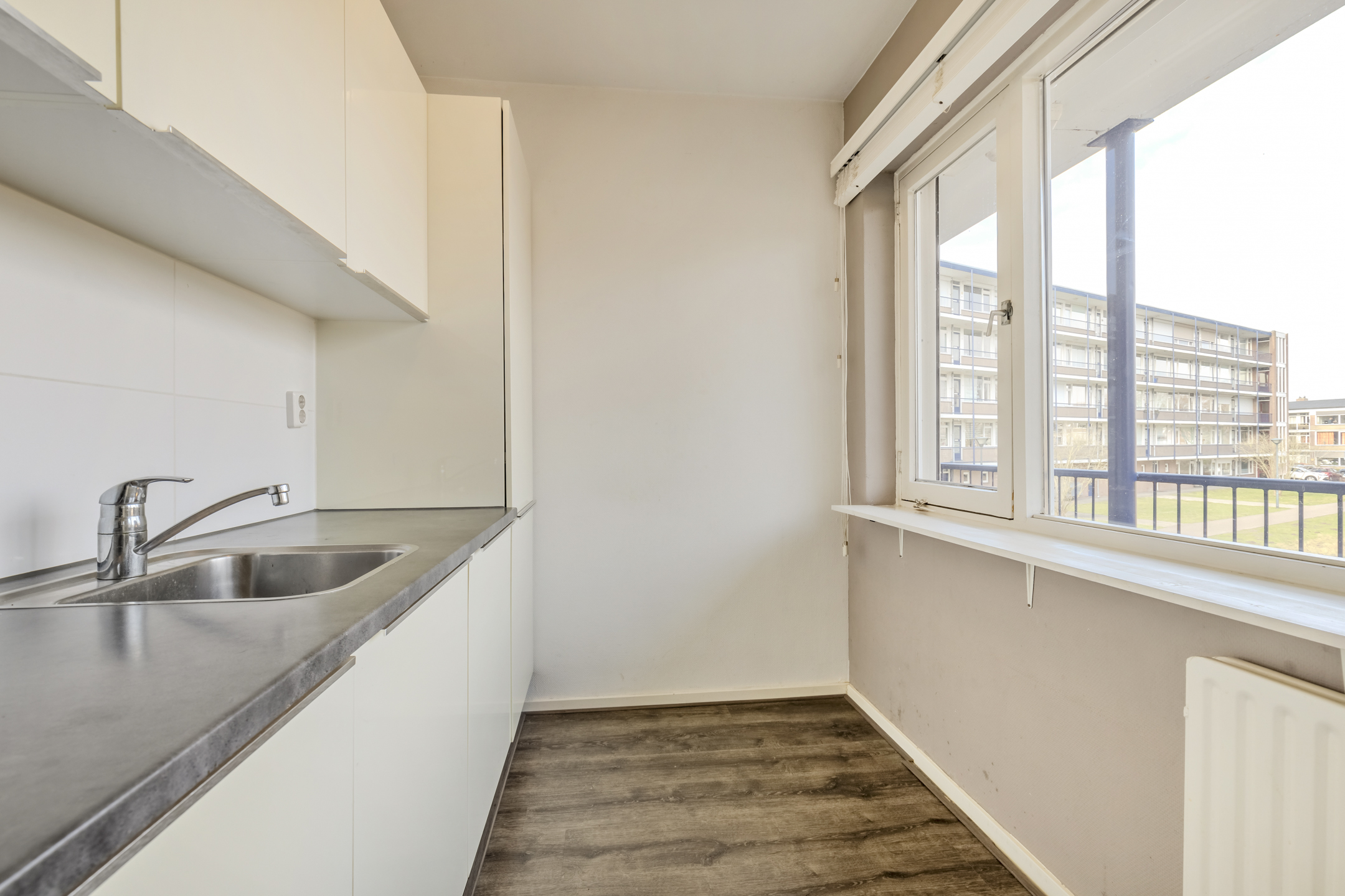 Aan de voorzijde van het appartement is de keuken gelegen. De moderne keuken is in rechte opstelling geplaatst met onder- en bovenkastjes. Aan apparatuur is het volgende aanwezig; 4-pits gaskookplaat, afzuigkap, oven, vaatwasmachine en een nieuwe koel-/vriescombinatie. Het grote raam aan de galerijzijde zorgt voor een aangenaam lichtinval. Het raam is voorzien van een elektrisch rolluik. De badkamer is volledig betegeld in een moderne kleurstelling en voorzien van een wastafel en douchecabine. Er is voldoende ruimte voor het plaatsen van een meubel. Het toilet is apart van de badkamer en bereikbaar vanuit de hal. De toiletruimte is deels betegeld en voorzien van een hangcloset en fontein.