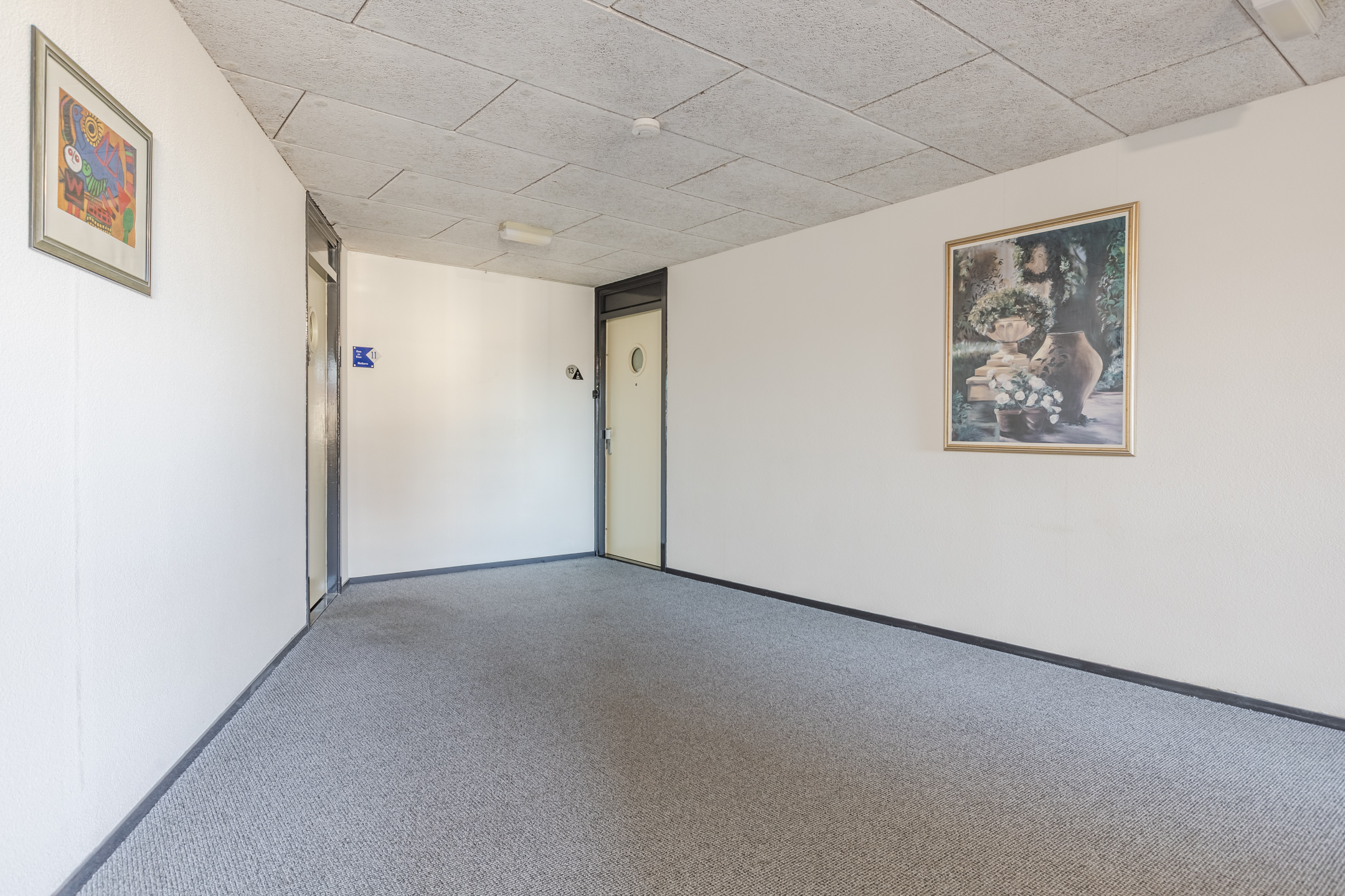 Afgesloten entree met intercominstallatie, ruime centrale hal met toegang tot de lift, de brievenbussen en de inpandige berging welke is voorzien van elektra.