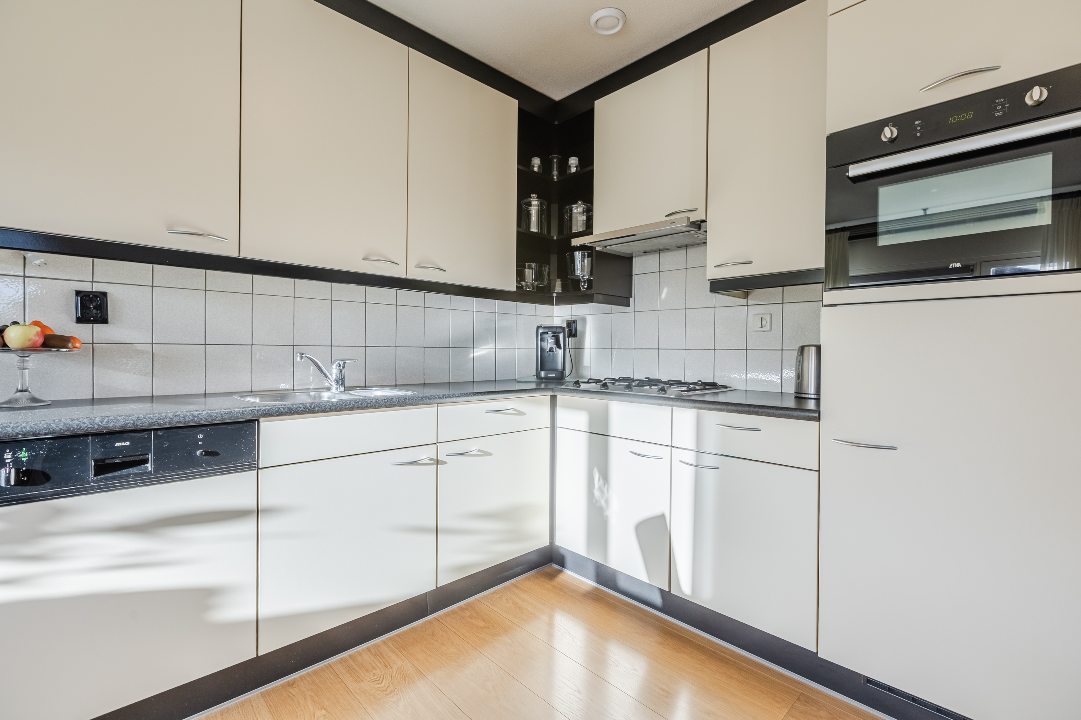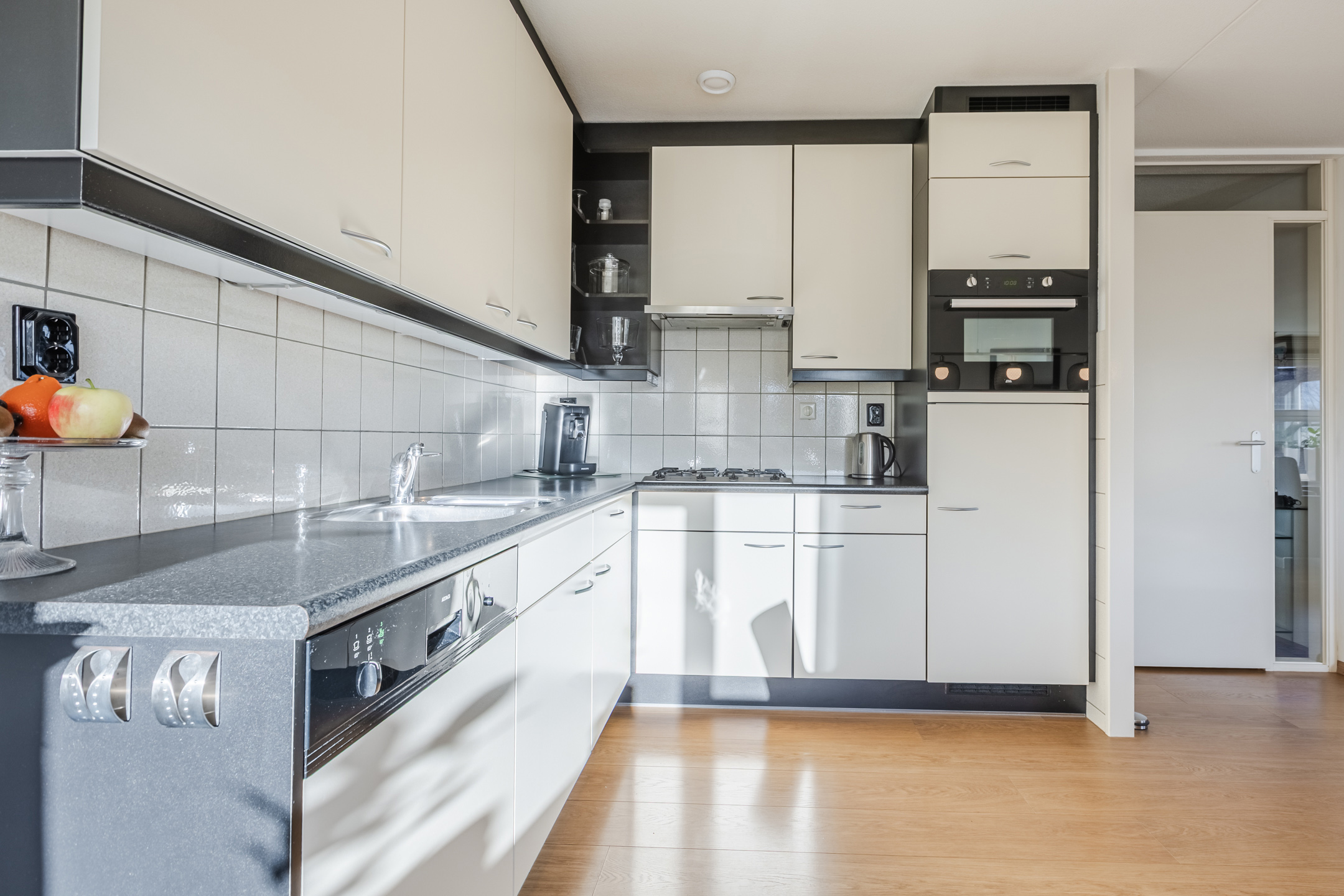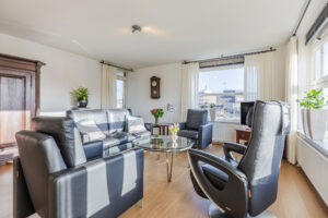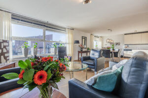 Entree met toegang tot de hal. Vanuit de hal zijn de andere vertrekken bereikbaar. Tevens treft u hier de intercominstallatie aan. De woonkamer met open keuken heeft een royale afmeting van maar liefst ca. 47m². Vanuit de woonkamer is via een loopdeur het balkon van ca. 10m² bereikbaar. De open keuken is voorzien van een keukeninrichting in hoekopstelling welke is voorzien van diverse inbouwapparatuur te weten; gaskookplaat, combi-magnetron, vlakscherm wasemkap, koelkast en een vaatwasmachine. Verder is er voldoende kastruimte beschikbaar.