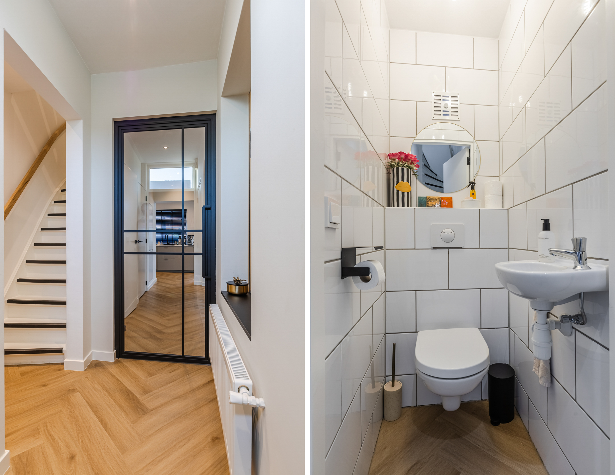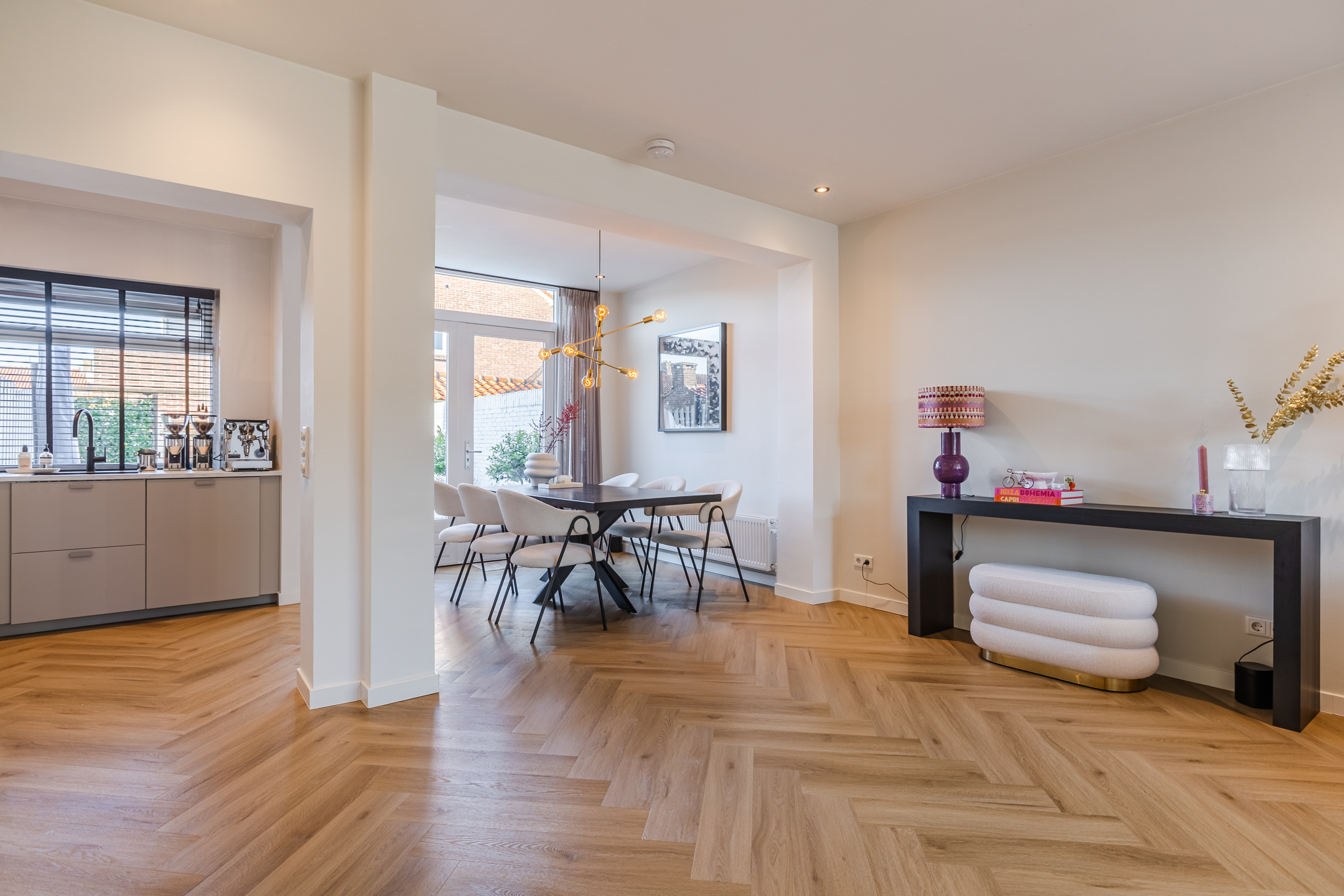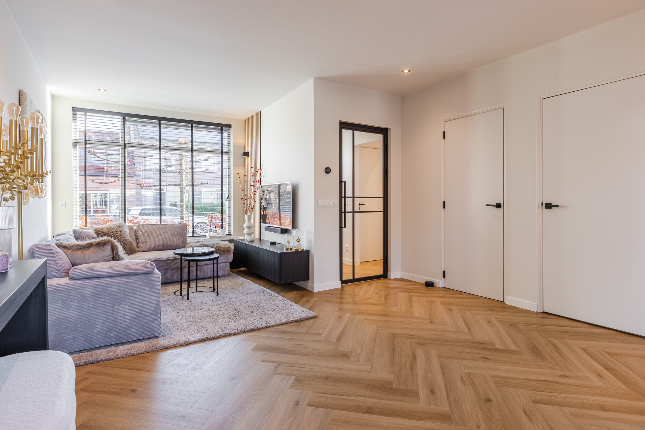 Entree/hal met trapopgang naar de eerste verdieping, meterkast (2013), geheel licht betegelde toiletruimte met een vrijhangend closet, een fontein en een zwart stalen 'glazen' deur naar de woonkamer. Sfeervolle living van maar liefst 38m² met praktische vaste bergkast, toegang tot de kelder en openslaande tuindeuren naar de op het zuid-westen gesitueerde achtertuin. Moderne, compleet vernieuwde keuken in hoekopstelling met de navolgende inbouwapparatuur te weten: inductie-kookplaat met geïntegreerde afzuiging, Quooker, combi-magnetron en een vaatwasmachine. Direct naast de keuken bevindt zich een vaste kast waarin op een slimme wijze de koelkast is geïntegreerd. De hal en living zijn voorzien van een hoogwaardige pvc-vloerafwerking in een visgraat motief.