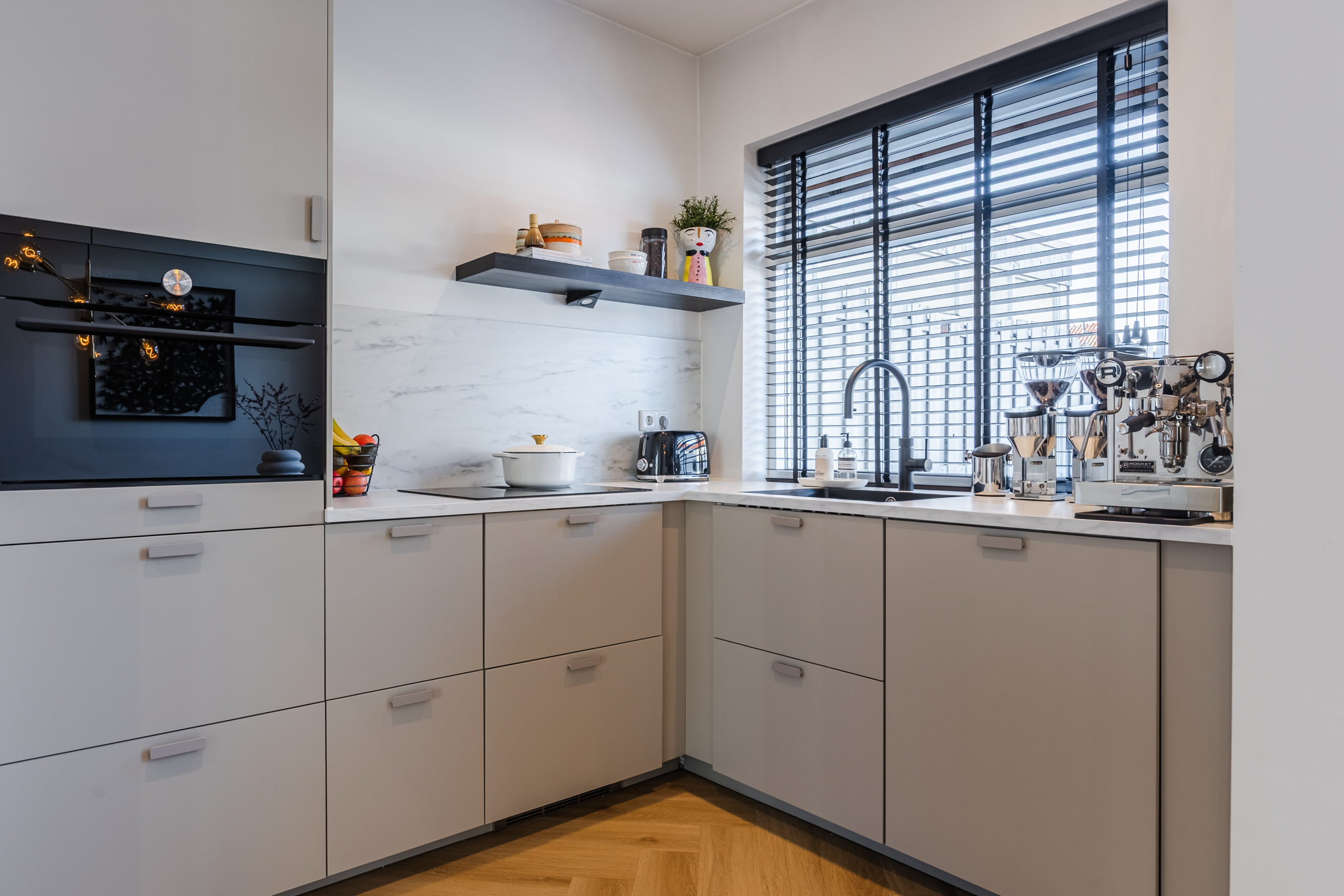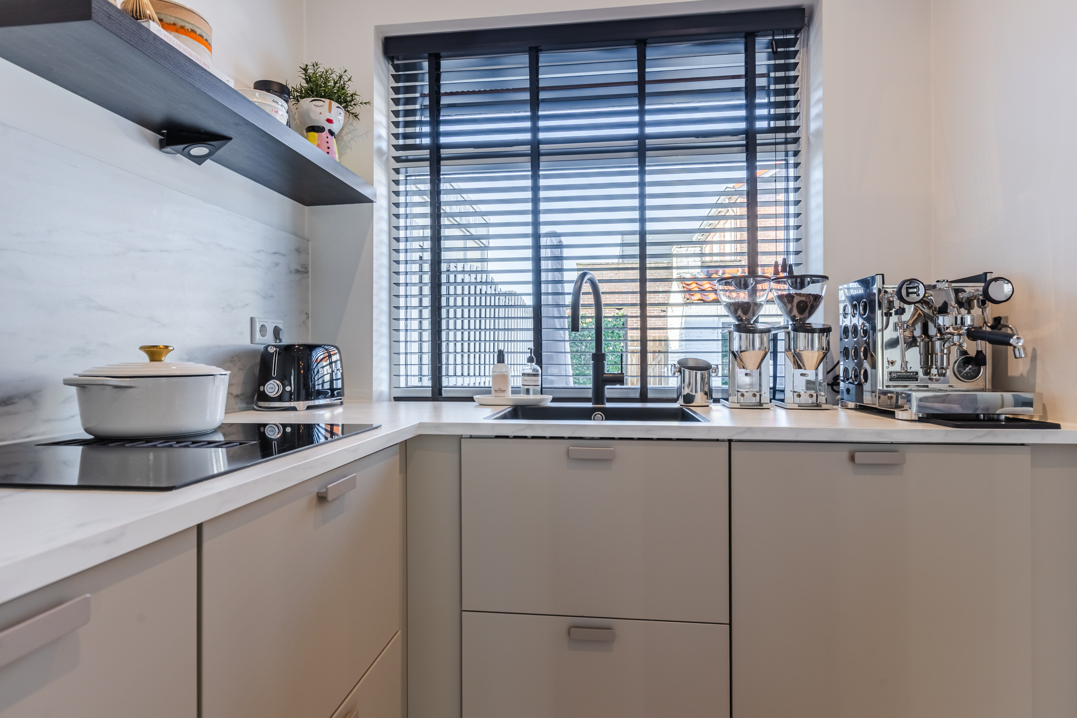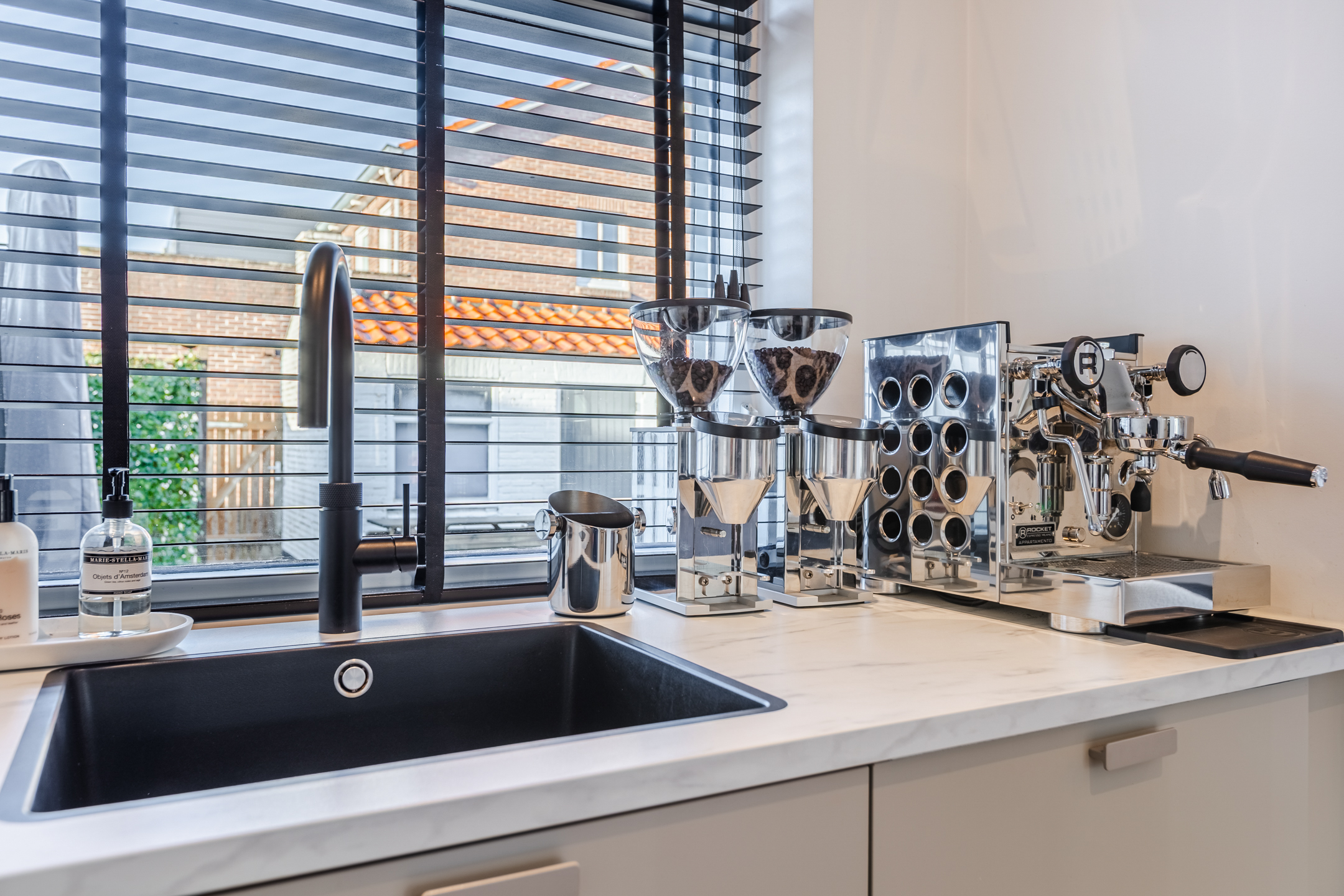 Entree/hal met trapopgang naar de eerste verdieping, meterkast (2013), geheel licht betegelde toiletruimte met een vrijhangend closet, een fontein en een zwart stalen 'glazen' deur naar de woonkamer. Sfeervolle living van maar liefst 38m² met praktische vaste bergkast, toegang tot de kelder en openslaande tuindeuren naar de op het zuid-westen gesitueerde achtertuin. Moderne, compleet vernieuwde keuken in hoekopstelling met de navolgende inbouwapparatuur te weten: inductie-kookplaat met geïntegreerde afzuiging, Quooker, combi-magnetron en een vaatwasmachine. Direct naast de keuken bevindt zich een vaste kast waarin op een slimme wijze de koelkast is geïntegreerd. De hal en living zijn voorzien van een hoogwaardige pvc-vloerafwerking in een visgraat motief.