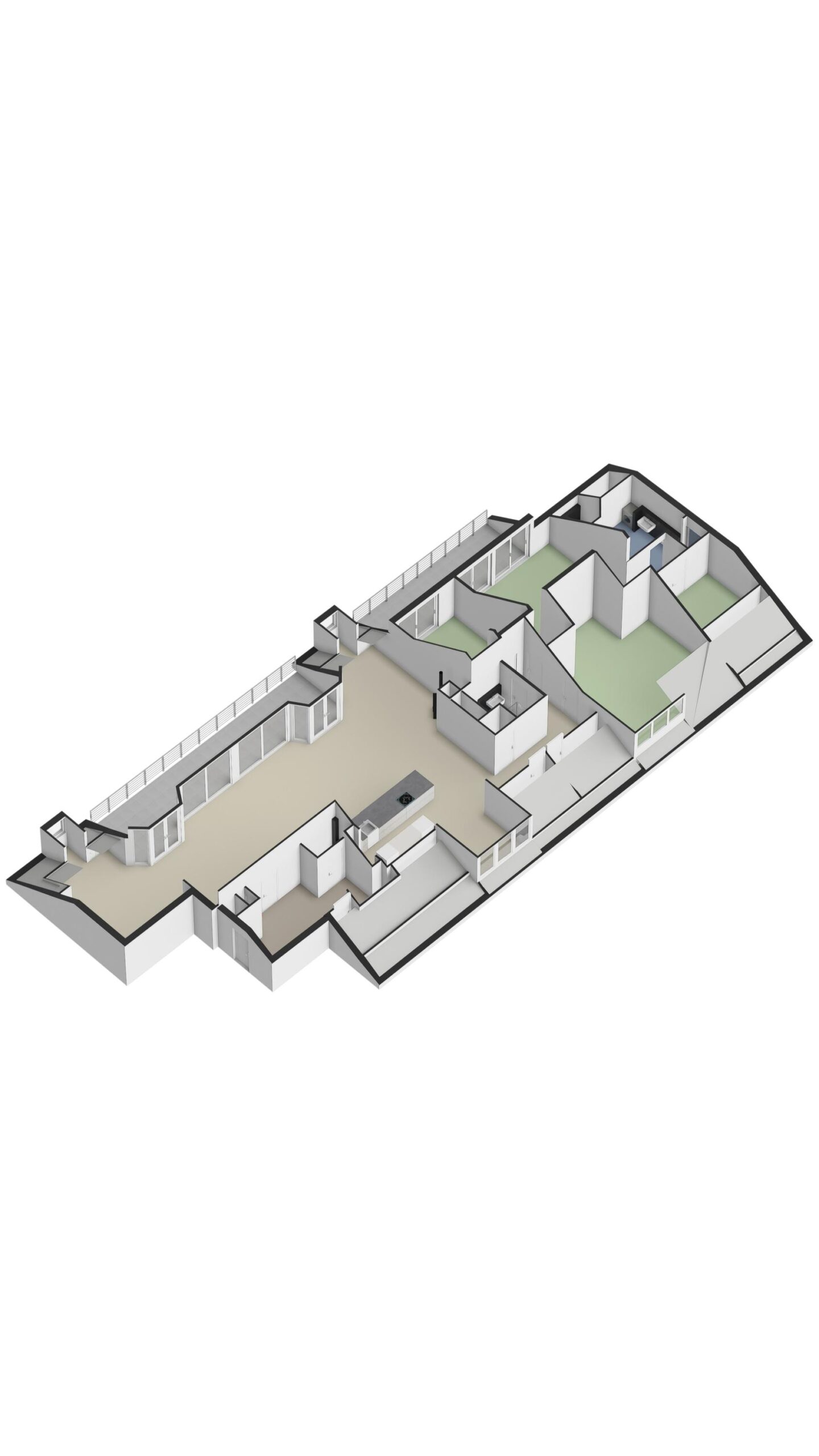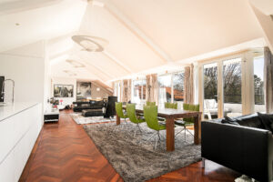 Het appartement heeft een royale hal waarin zich de meterkast bevindt, een betegeld toilet met fontein en een grote opbergkast. Prachtige dubbele openslaande deuren met toegang tot de imposante living. Het totale oppervlak van de living bedraagt ca. 125m², is grotendeels uitgerust met visgraat parketvloer (m.u.v. de keuken welke voorzien is van een strakke tegelvloer) en een palletkachel met zeer prettige stralingswarmte. Middels een tweetal, naar binnen openslaande, dubbele deuren is er toegang tot het eerste fraaie dakterras, zuid gericht en voorzien van bankirai vlonders. De gehele achtergevel welke uit glas is opgetrokken is voorzien van screens en elektrisch bedienbare zonneschermen.