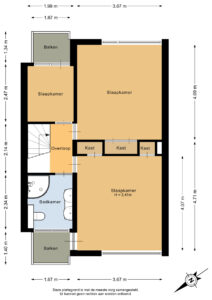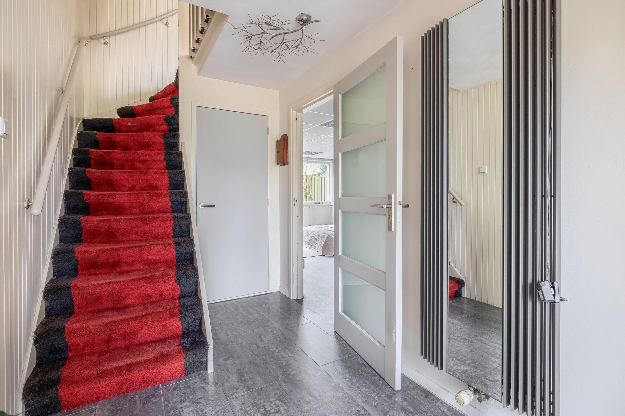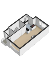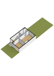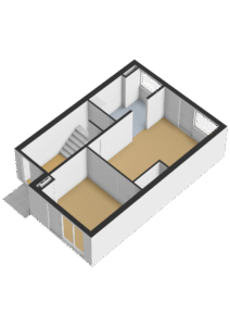 Entree/hal met trapopgang naar de eerste verdieping, de trapkast met de aansluitingen ten behoeve van de wasapparatuur en toegang tot 2 slaapkamers van ca. 20m² en 12m². De kamer aan de achterzijde is voorzien van een vaste kast met de opstelplaats van de c.v.-ketel (Intergas, bwj. 2018), een loopdeur naar de achtertuin en een keukenblok met een spoelbak, koelkast en vriezer. In de kamer aan de voorzijde bevindt zich de meterkast en een grote pui met loopdeur naar de voortuin.