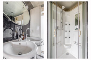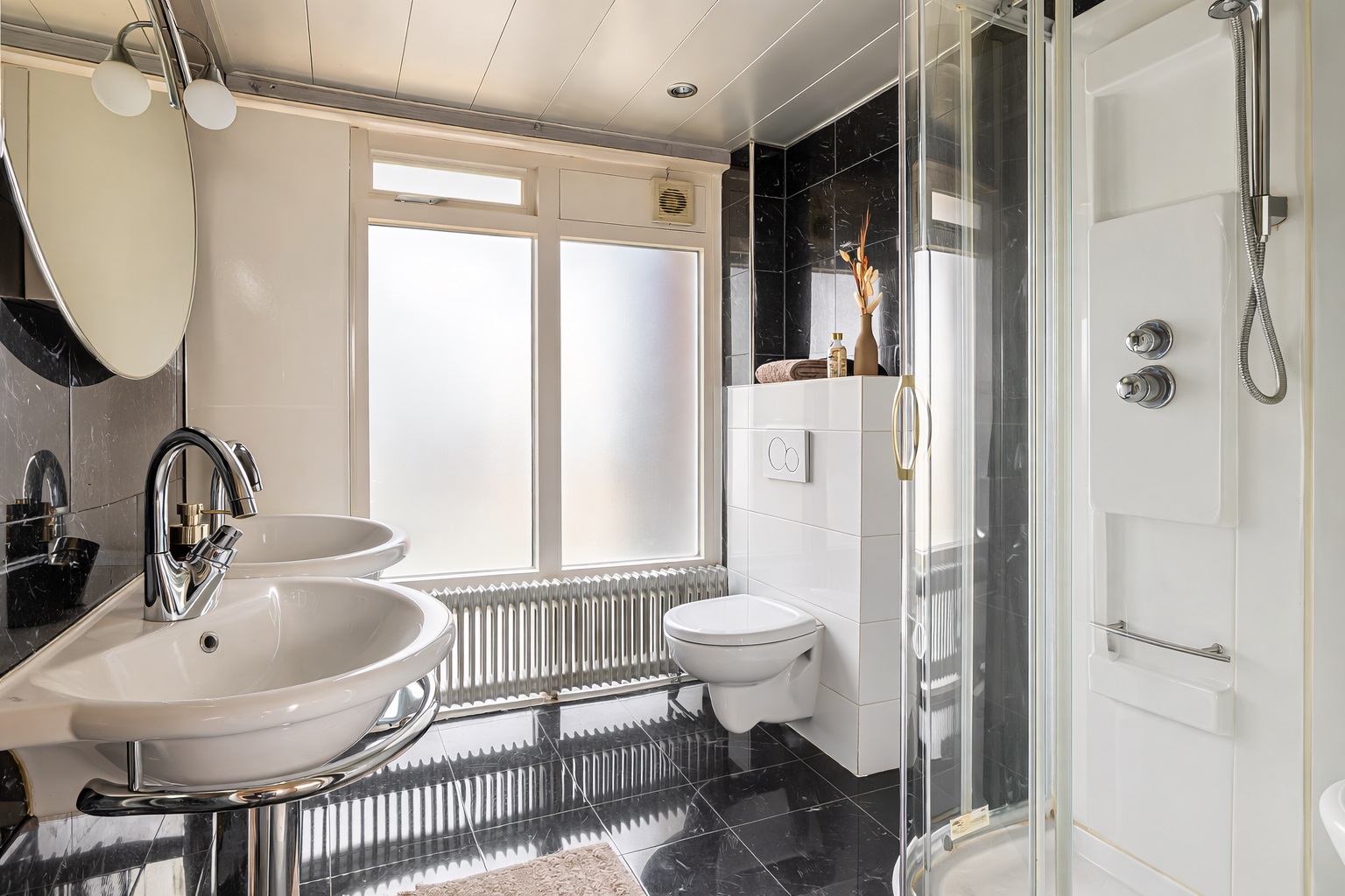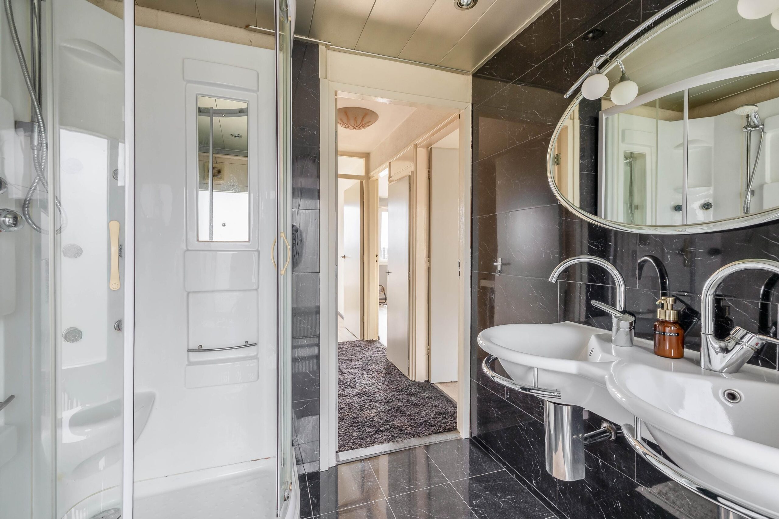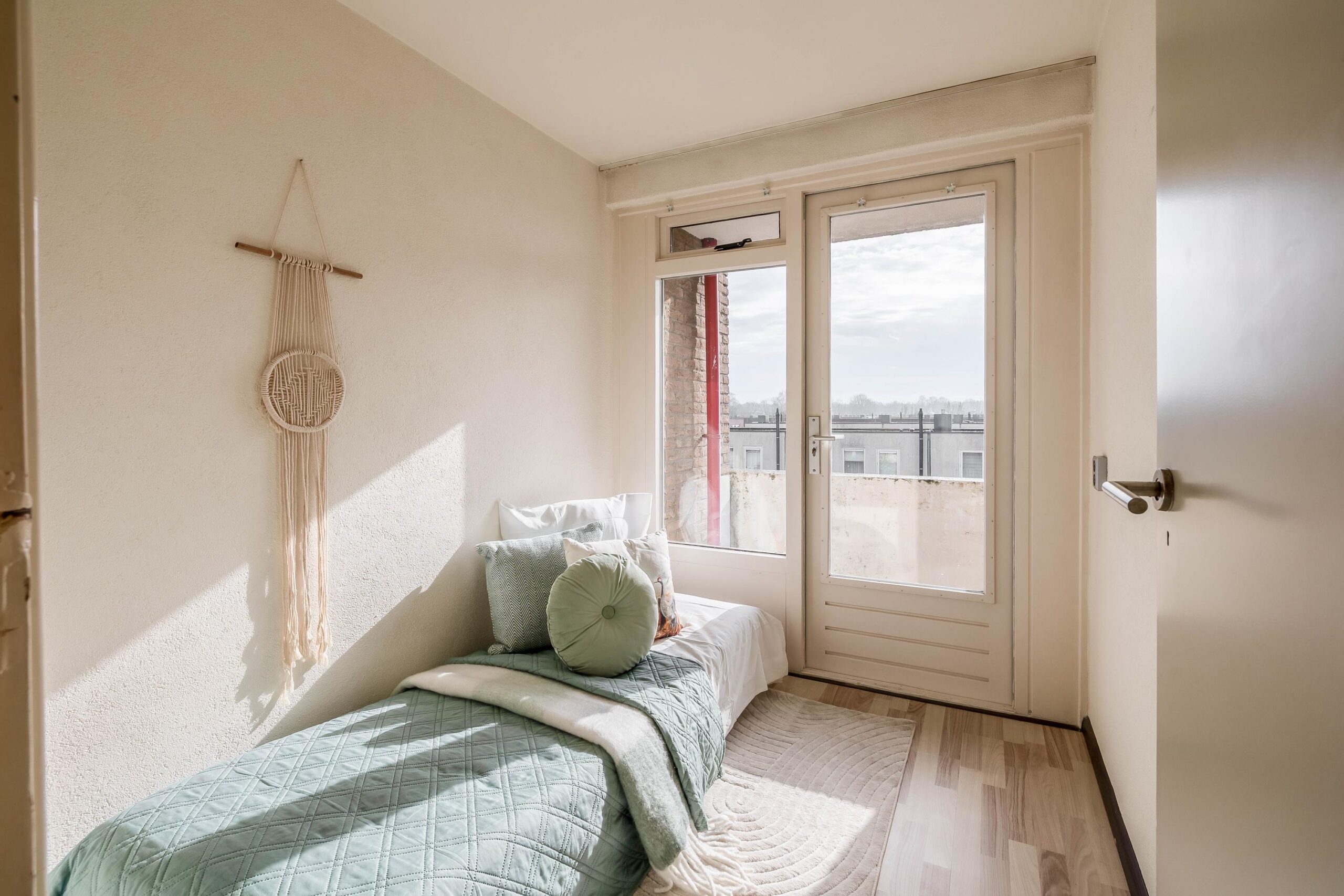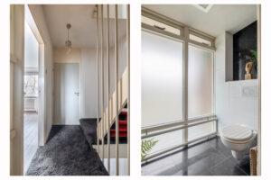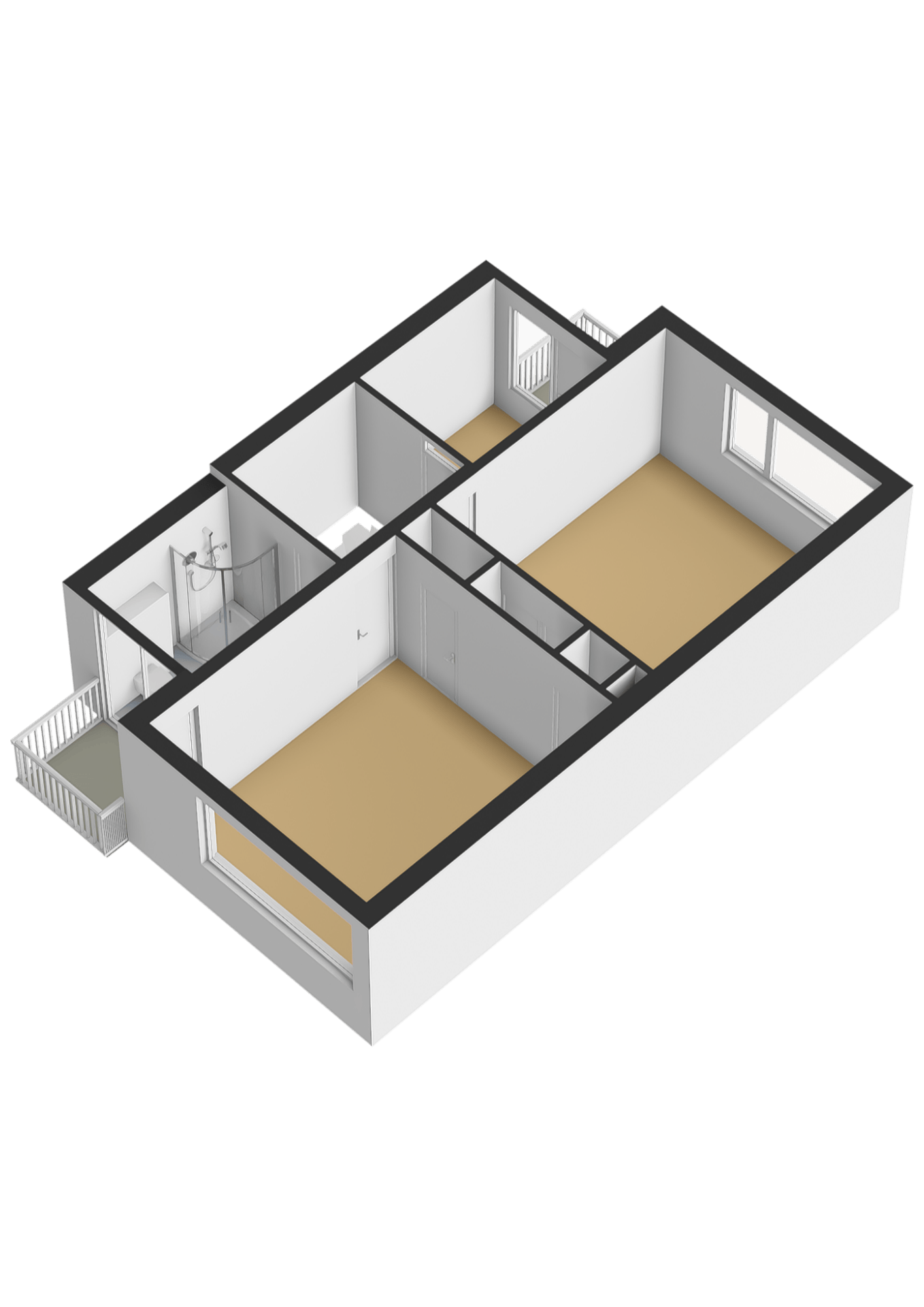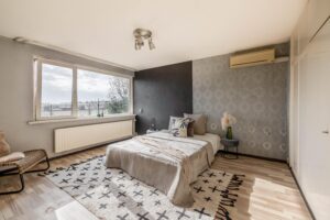 Overloop met toegang tot 3 slaapkamers en de volledig betegelde badkamer voorzien van dubbele wastafel, douchecabine en toilet. Slaapkamer 1 (ca. 15m²) en slaapkamer 2 (ca. 15m²) zijn voorzien van een airco en inbouwkasten. Slaapkamer 2 en slaapkamer 3 (ca. 5m²) beschikken over een eigen balkon. Tevens zijn alle slaapkamers voorzien van een laminaatvloer.
