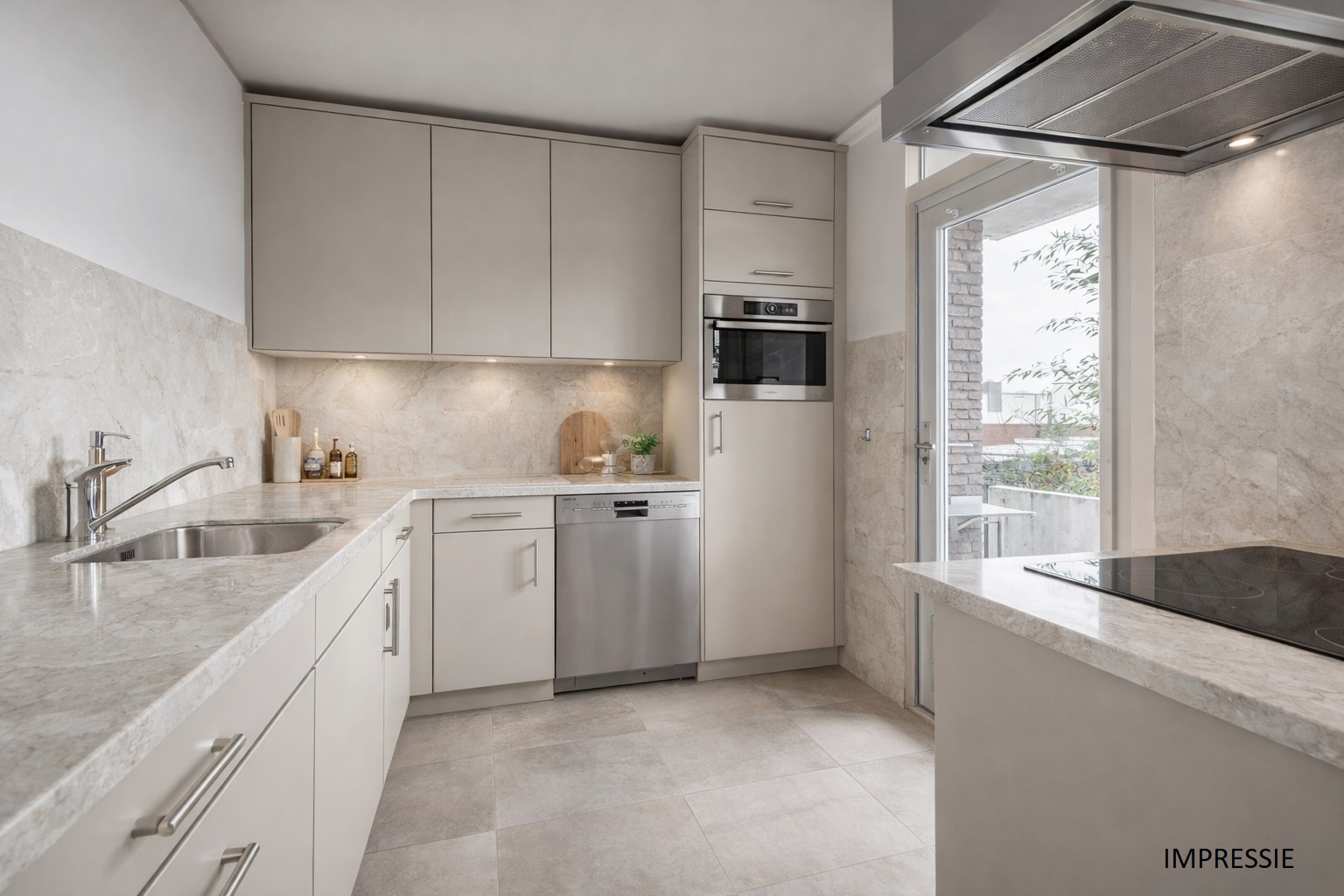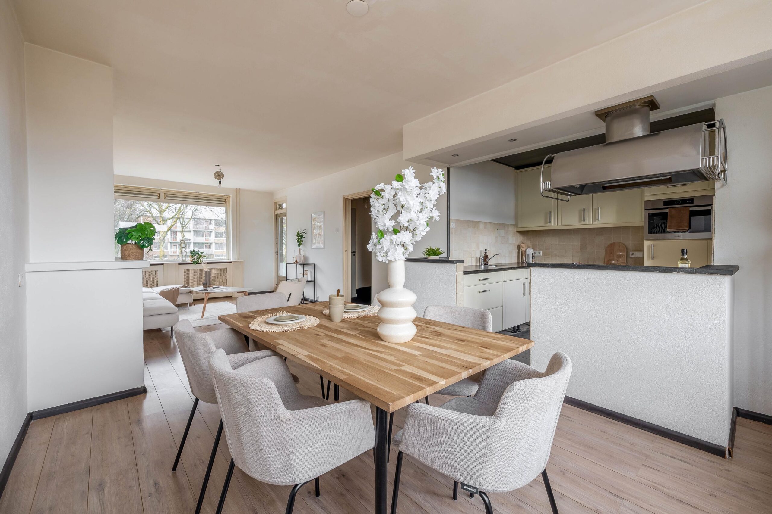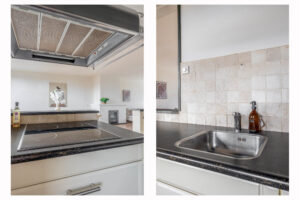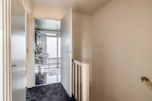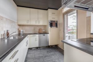 Overloop met vaste trapopgang naar de tweede verdieping en toegang tot de ruime, volledig betegelde toiletruimte en de living. De living is voorzien van een laminaatvloer, elektrische sfeerhaard en screens. Via de living bereikt u het balkon aan de voorzijde van de woning (noordwest) en de half open keuken met een balkon aan de achterzijde van de woning (zuidoost). De keuken is voorzien van de navolgende inbouwapparatuur: vaatwasmachine, inductie kookplaat, combi-oven/magnetron en een koelkast met vriesvakje.