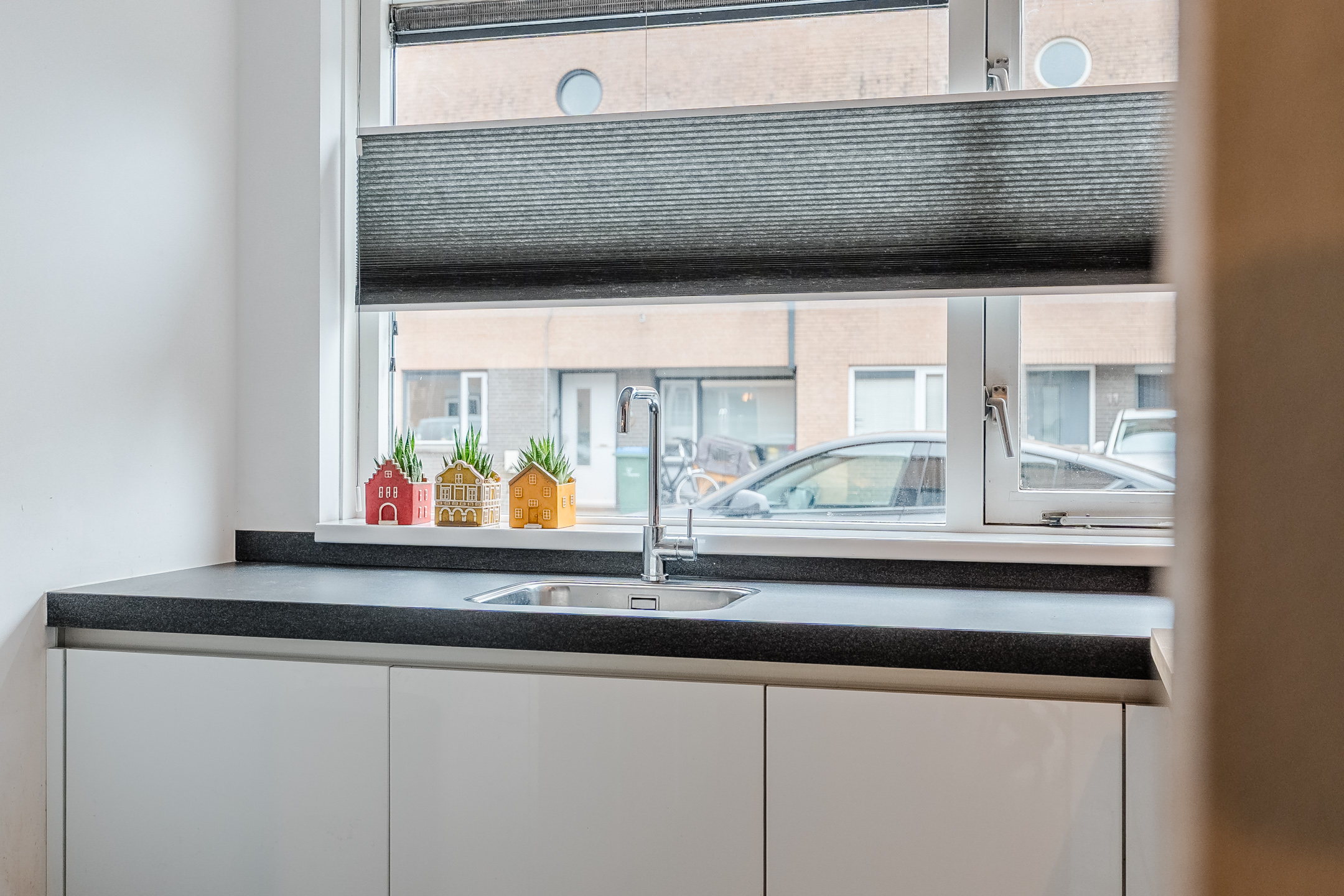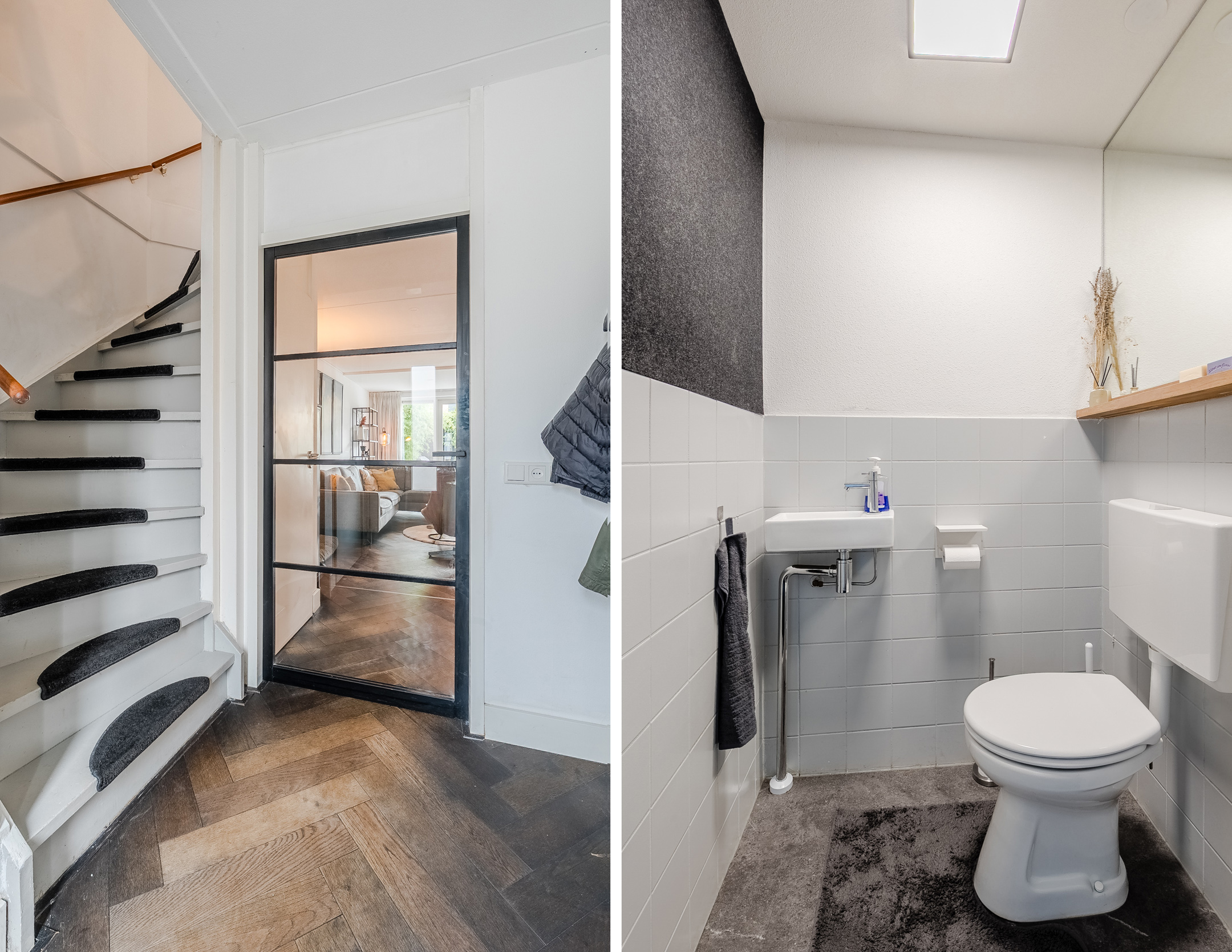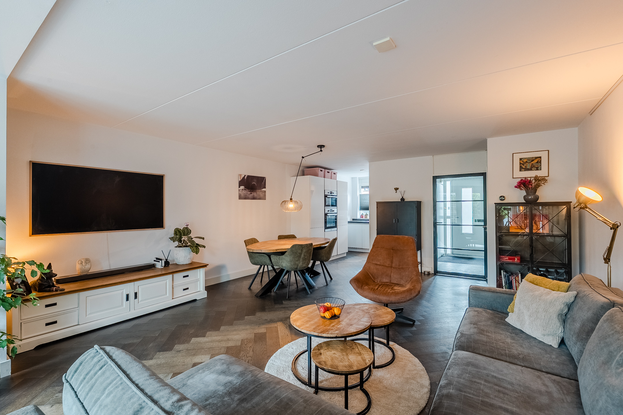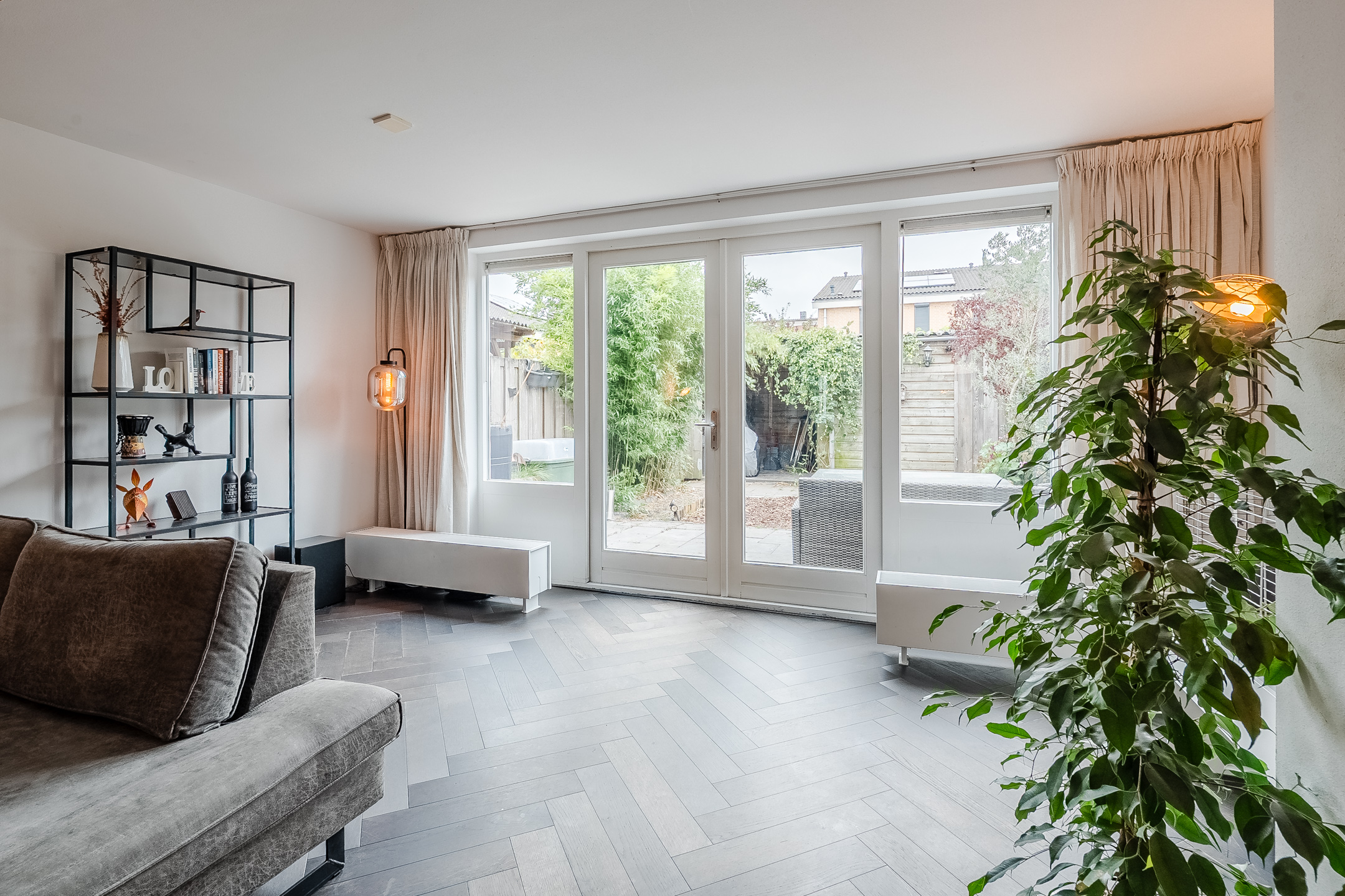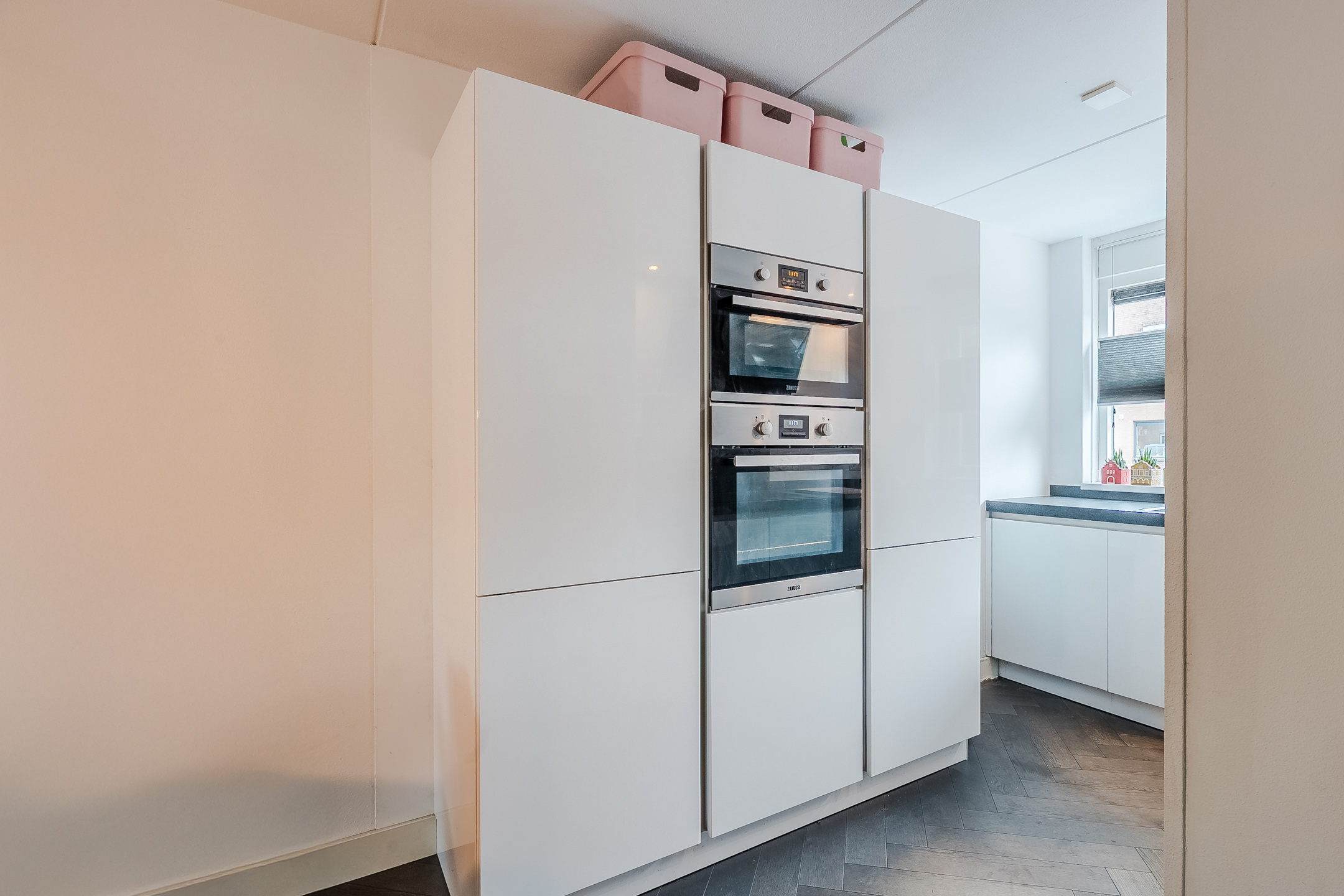 Entree/hal met trapopgang naar de eerste verdieping en toegang tot de vernieuwde meterkast en de half betegelde toiletruimte met toilet en fonteintje. Vanuit de hal heeft u toegang tot de ruime living welke aan de achterzijde is uitgebouwd en voorzien is van een fraaie houten vloer in visgraatmotief, praktische trapkast, dubbele openslaande deuren naar de achtertuin en een open keuken. De keuken is gelegen aan de voorzijde en voorzien van een nette keukeninrichting (uit 2019) met diverse kastjes, lades en inbouwapparatuur, te weten: een inductiekookplaat, afzuigkap, combi-oven/magnetron, oven, koelkast, vriezer en vaatwasmachine.