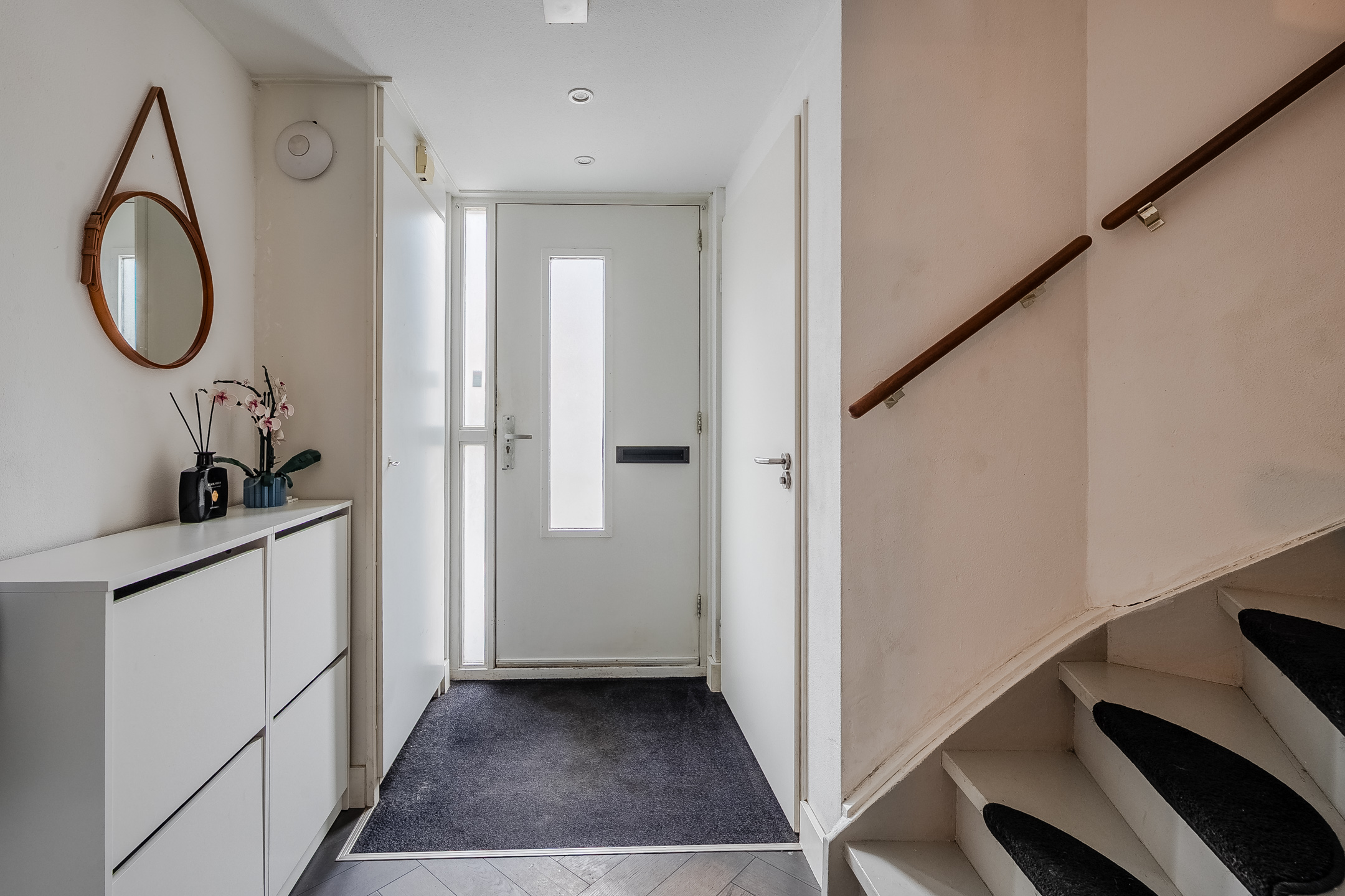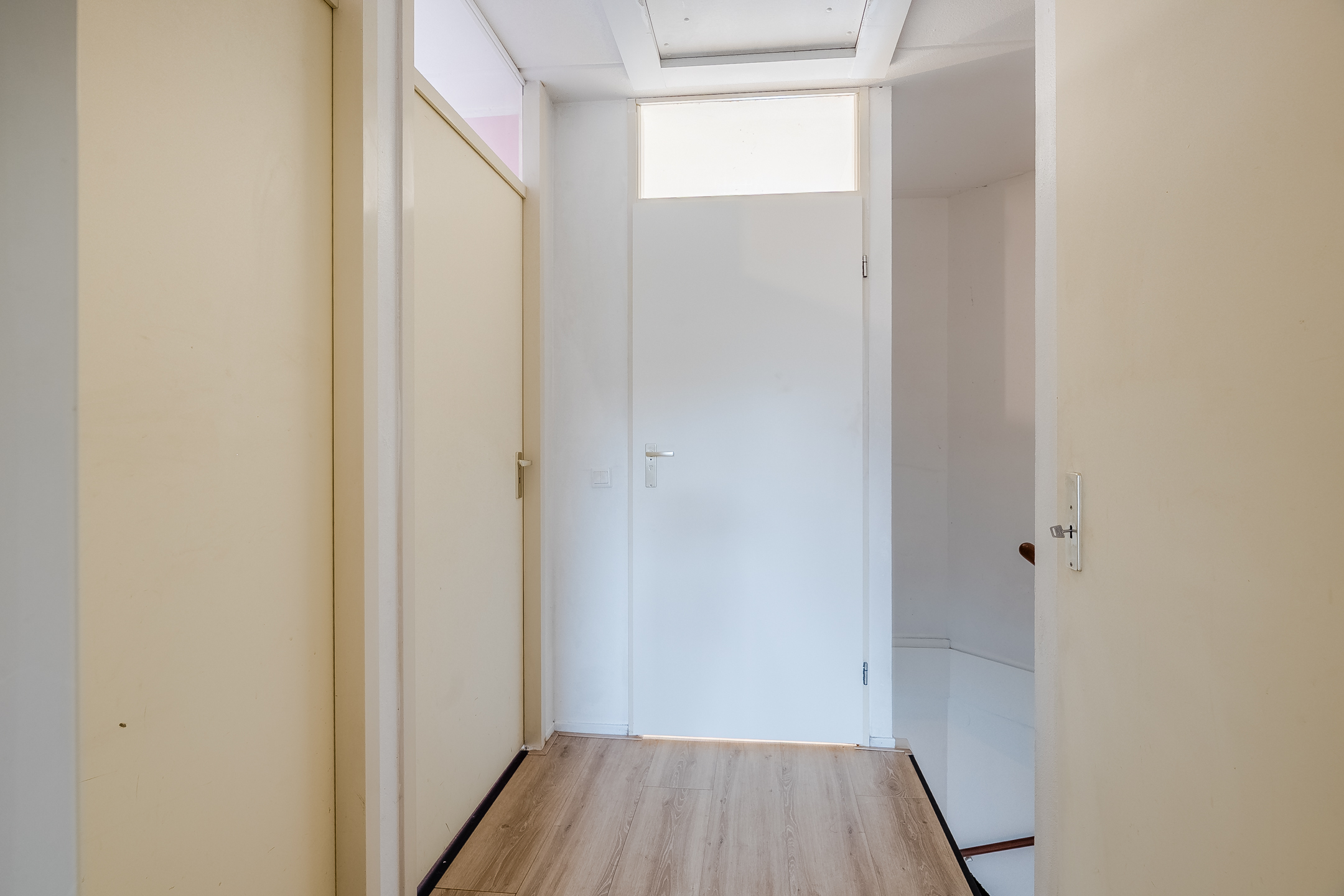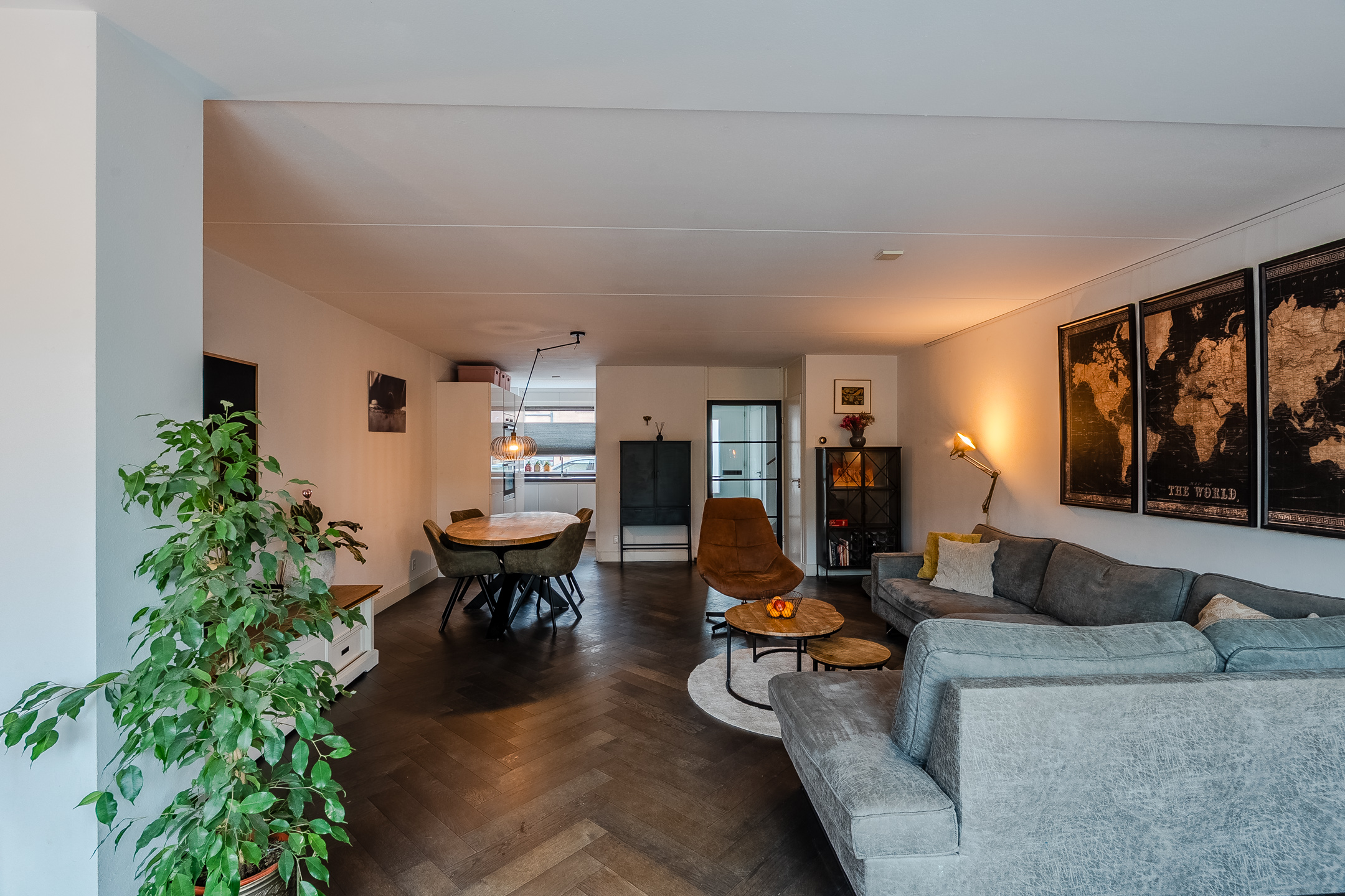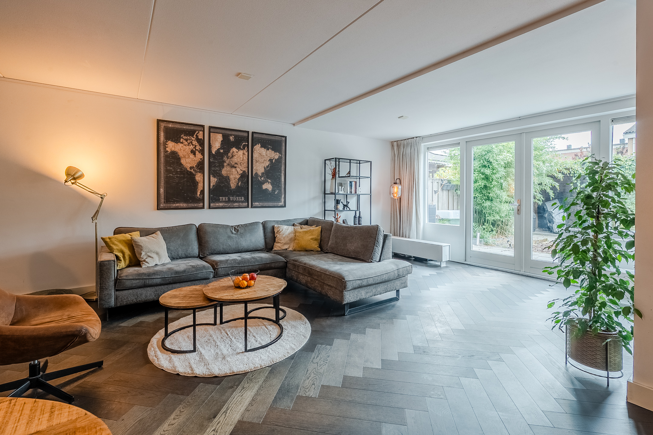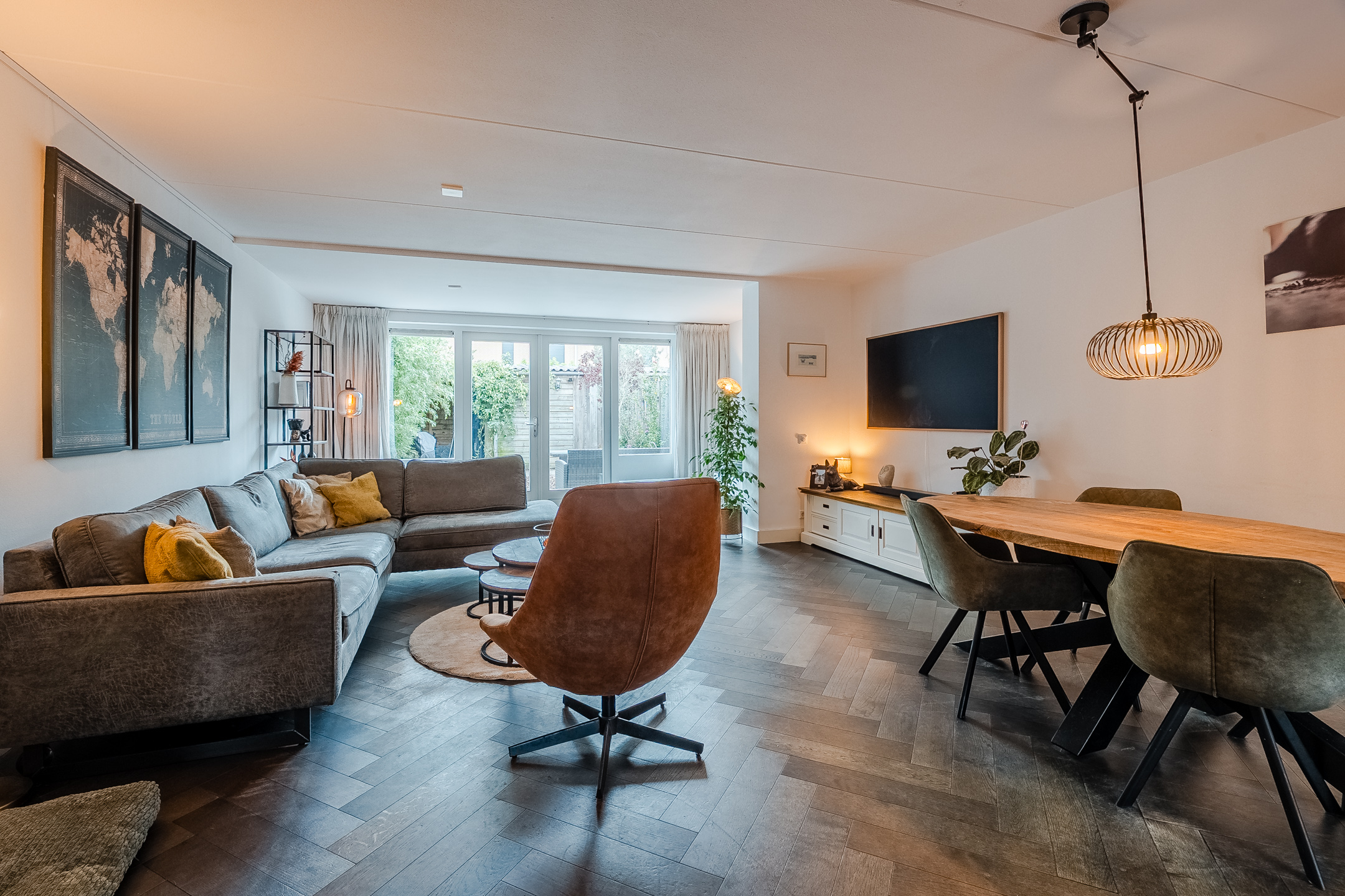 Entree/hal met trapopgang naar de eerste verdieping en toegang tot de vernieuwde meterkast en de half betegelde toiletruimte met toilet en fonteintje. Vanuit de hal heeft u toegang tot de ruime living welke aan de achterzijde is uitgebouwd en voorzien is van een fraaie houten vloer in visgraatmotief, praktische trapkast, dubbele openslaande deuren naar de achtertuin en een open keuken. De keuken is gelegen aan de voorzijde en voorzien van een nette keukeninrichting (uit 2019) met diverse kastjes, lades en inbouwapparatuur, te weten: een inductiekookplaat, afzuigkap, combi-oven/magnetron, oven, koelkast, vriezer en vaatwasmachine.