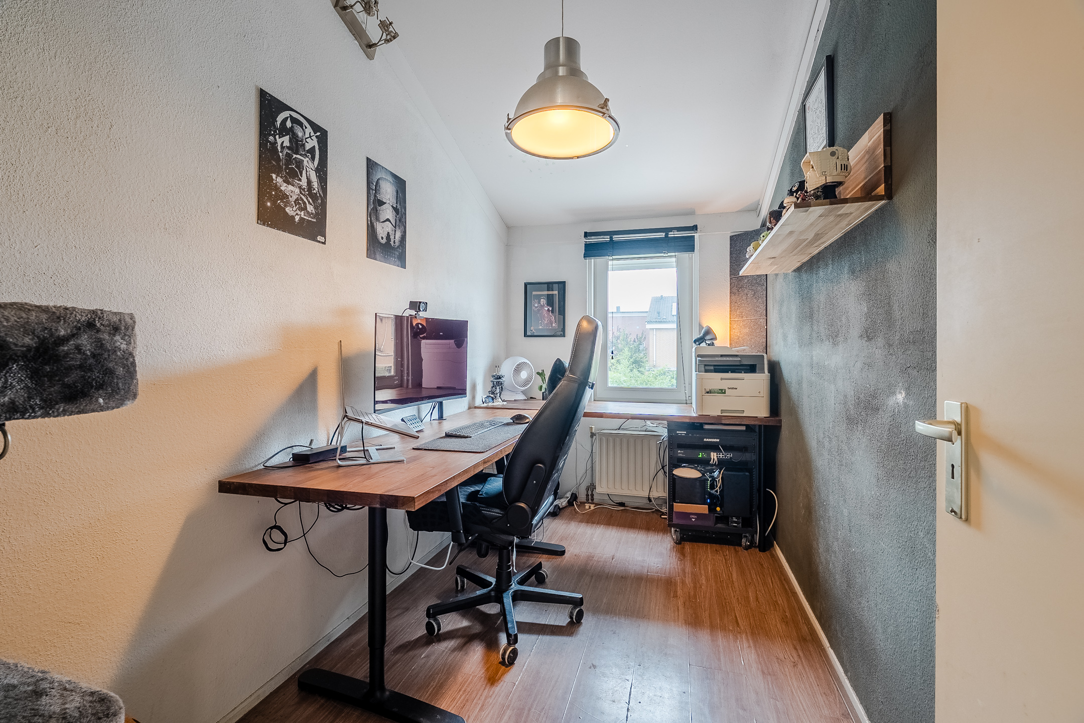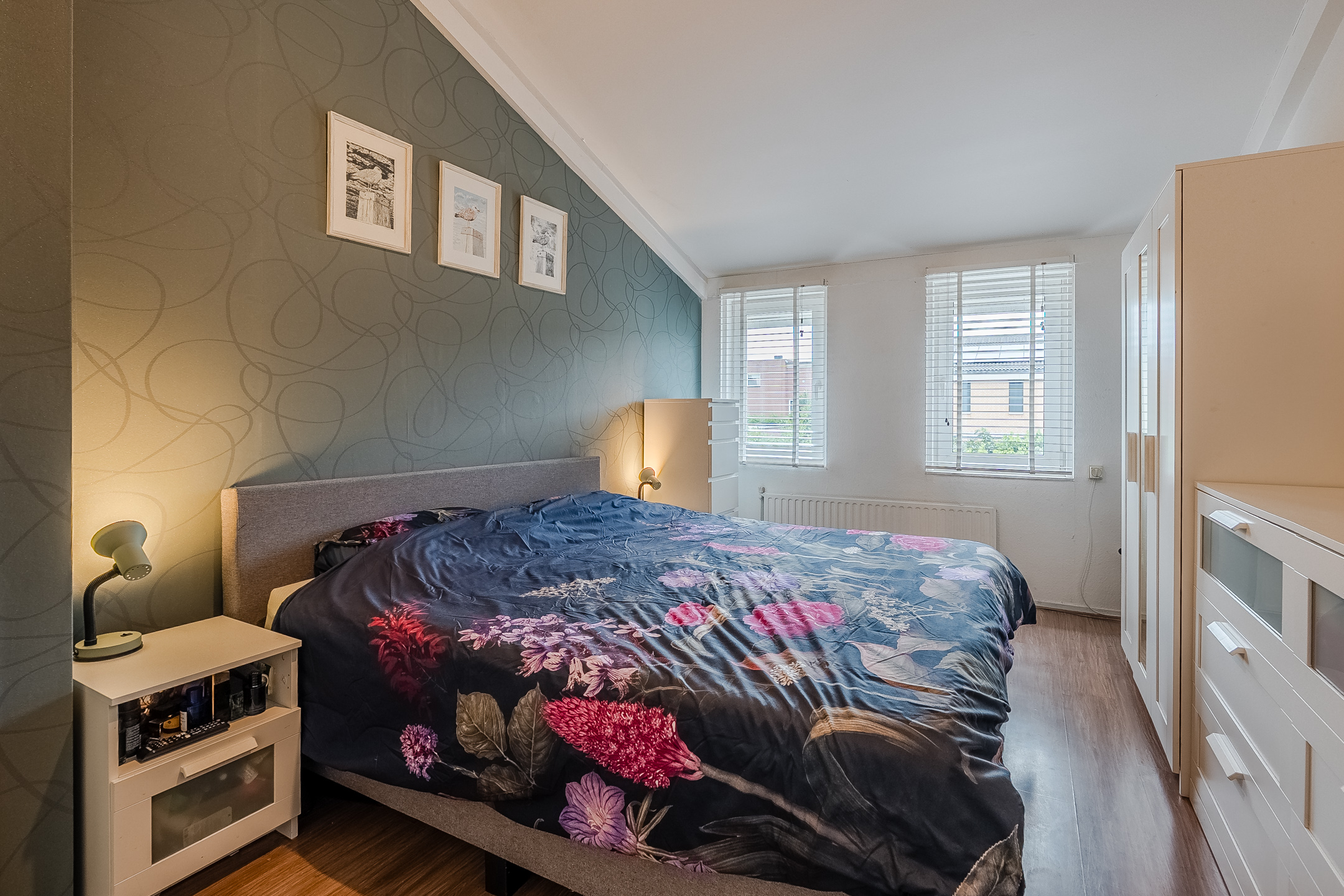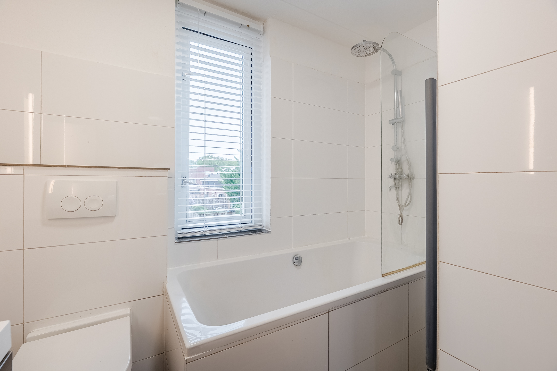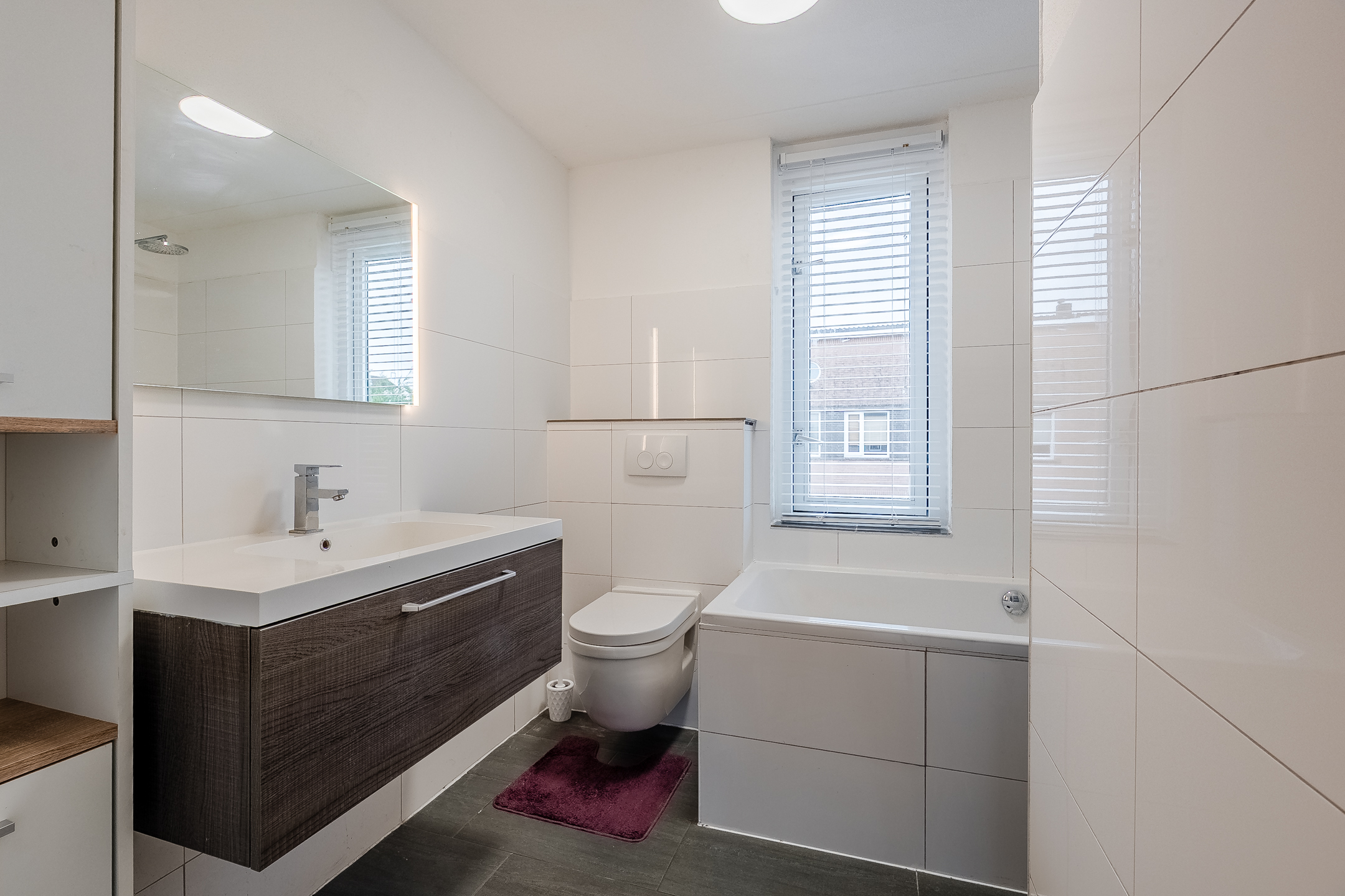 Overloop met toegang tot een wasruimte met de aansluitingen voor de wasapparatuur, 3 ruime slaapkamers van ca. 14m², 9m² en 7m² en een deels betegelde badkamer met een ligbad, wastafelmeubel, designradiator en een tweede toilet.