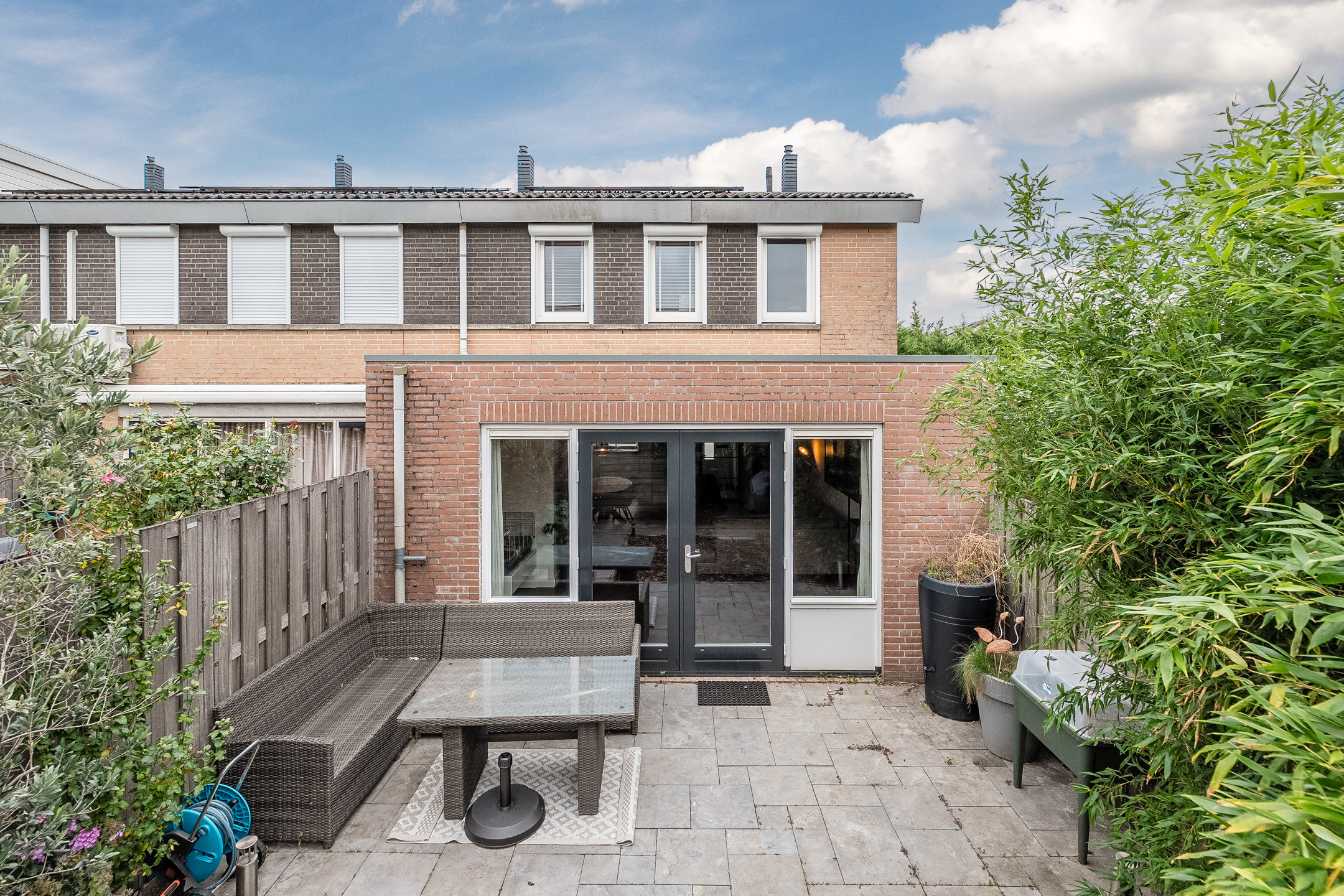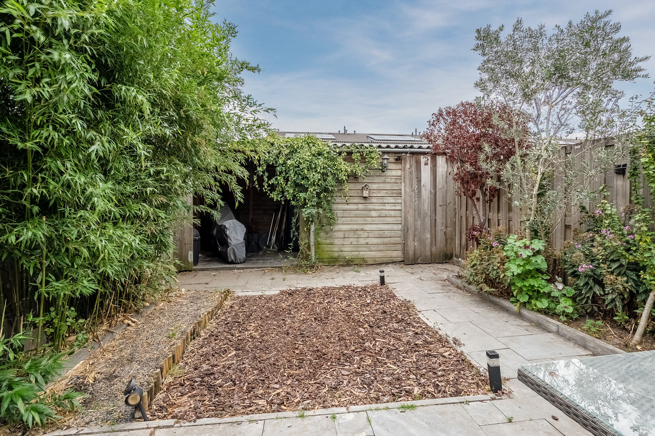 De woning beschikt over een nette voortuin en een fraai aangelegde achtertuin op het zonnige westen met achterom. Tevens is er een houten berging aanwezig met elektra.